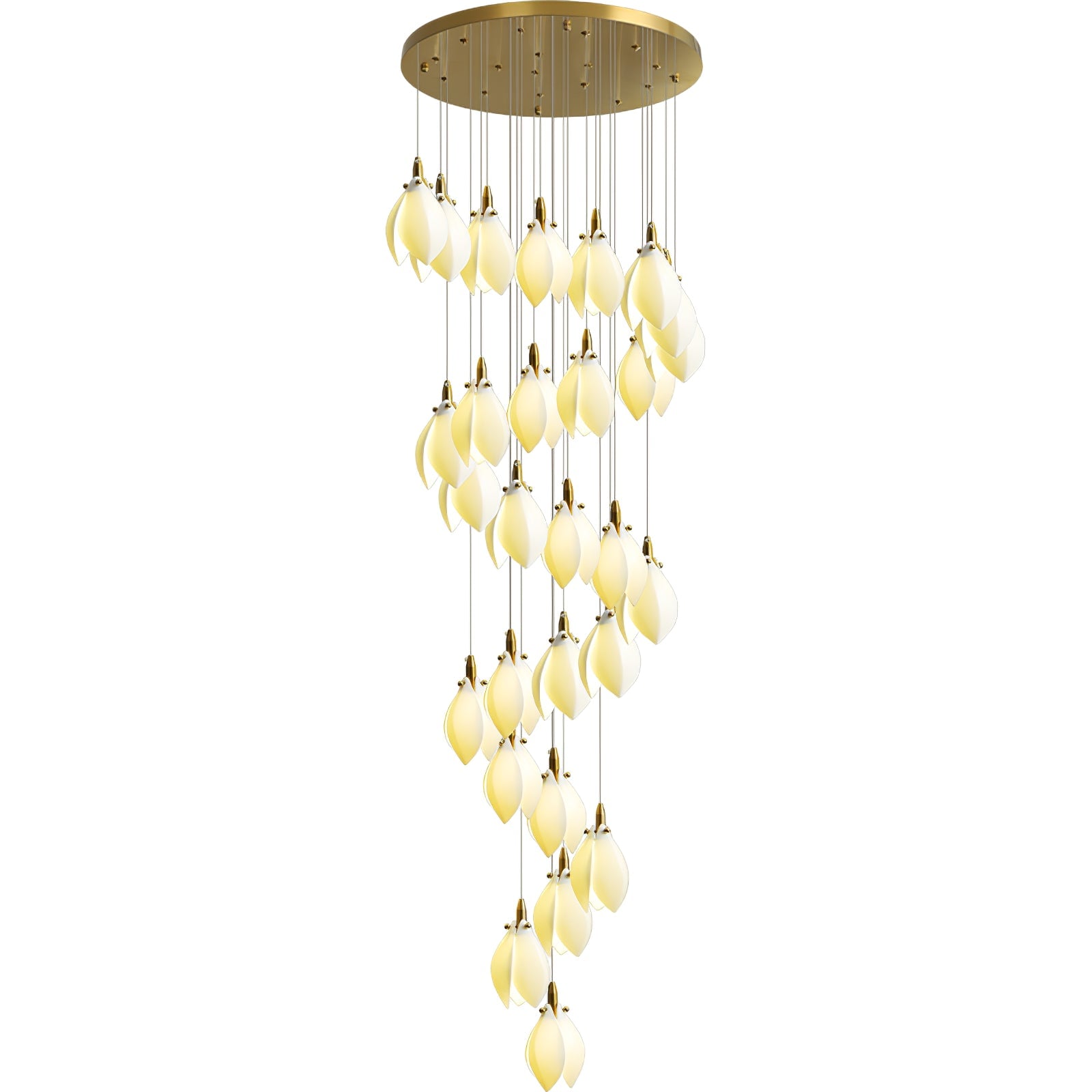 Der Astralis Bloom Kronleuchter präsentiert eine atemberaubende Fusion aus elektroplattiertem Eisen und keramischer Handwerkskunst. Entworfen, um einem ätherischen Wasserfall aus leuchtenden Blütenblättern zu ähneln, fängt dieser Kronleuchter das Wesen himmlischer Schönheit ein. Jedes zarte, schwebende Keramikblatt strahlt ein sanftes und warmes Licht aus und schafft eine ruhige Atmosphäre. Mit seiner gestuften Struktur und eleganten goldenen Akzenten verleiht dieser Kronleuchter Ihrem Zuhause einen anspruchsvollen und organischen Touch, perfekt für moderne Räume, die sowohl Eleganz als auch natürlichen Charme suchen.