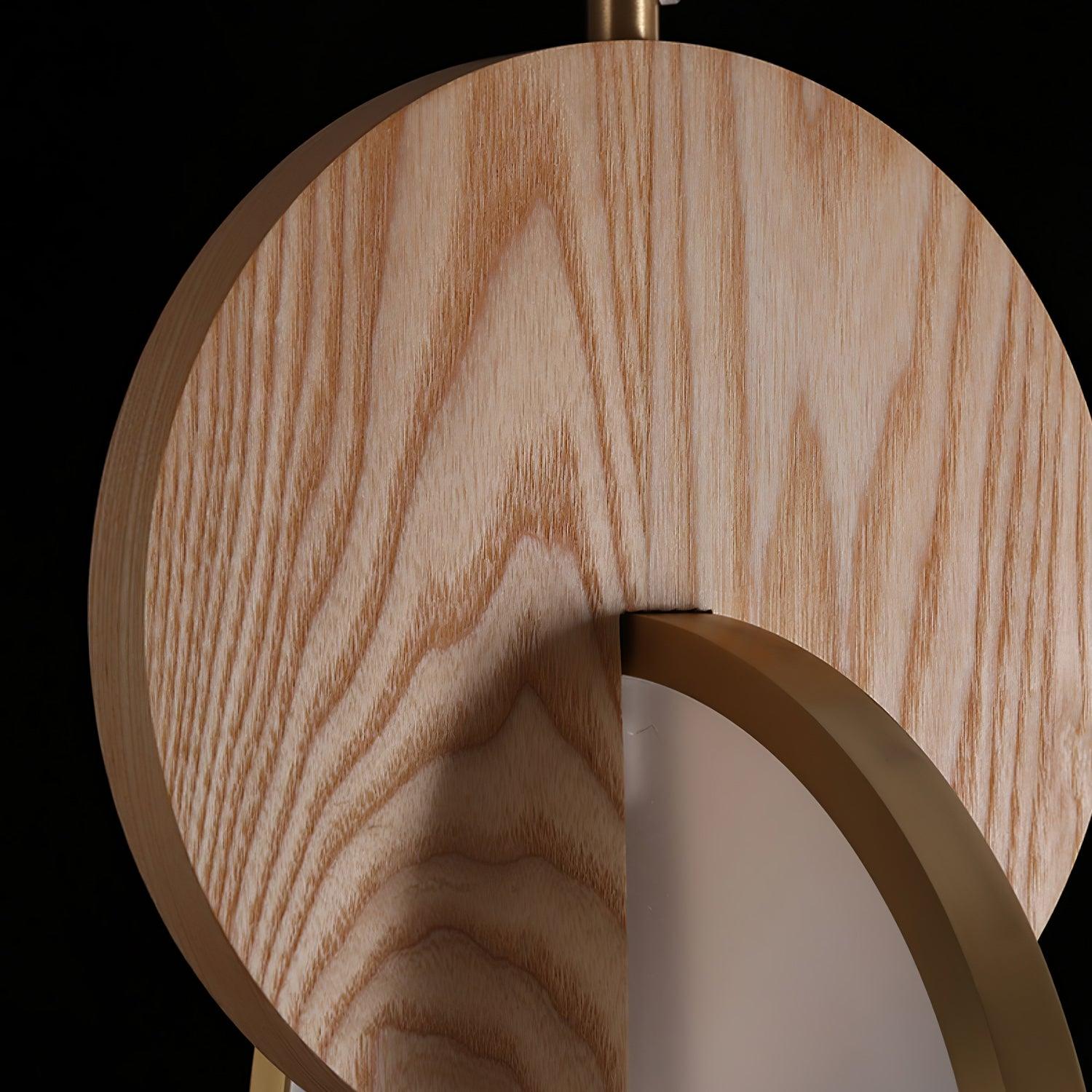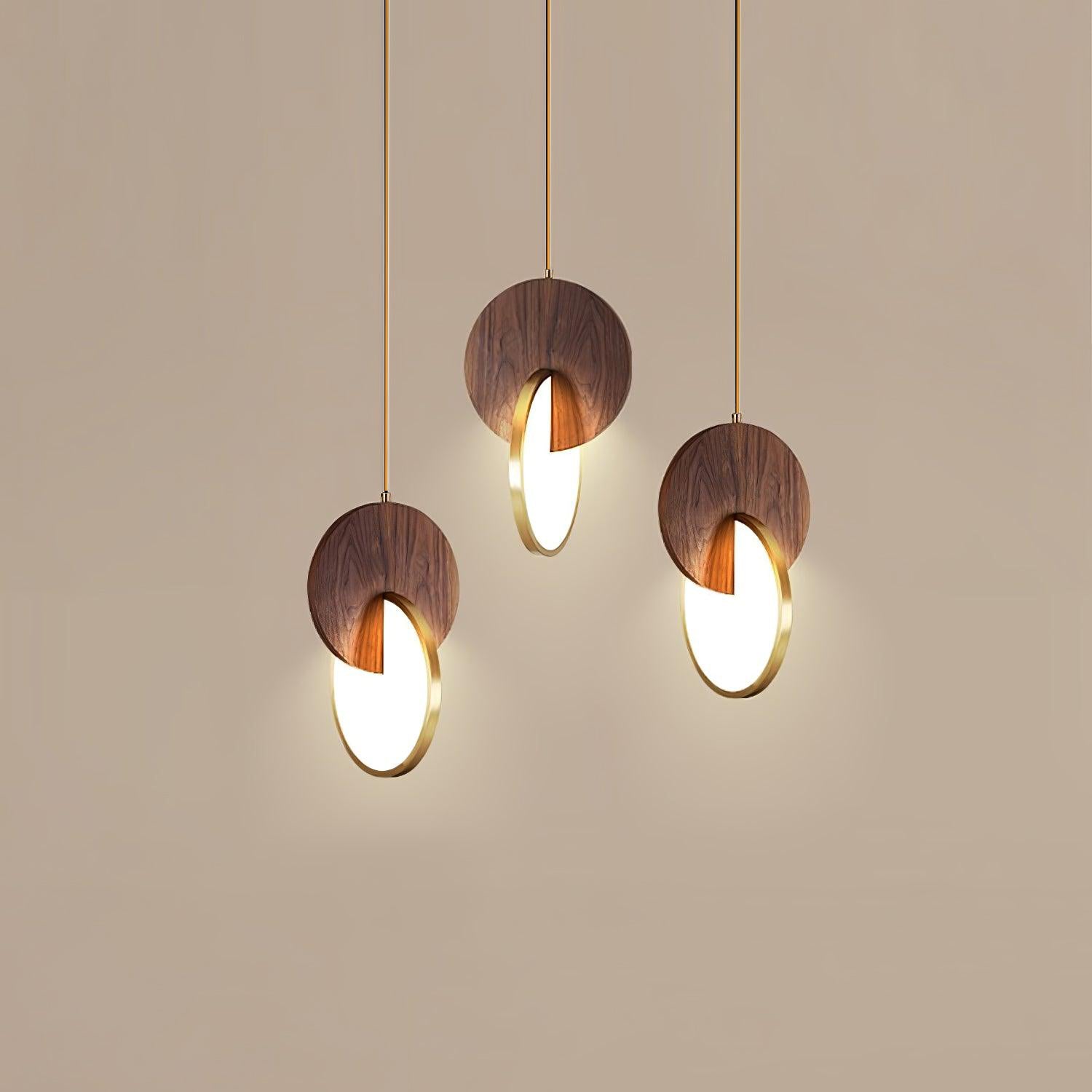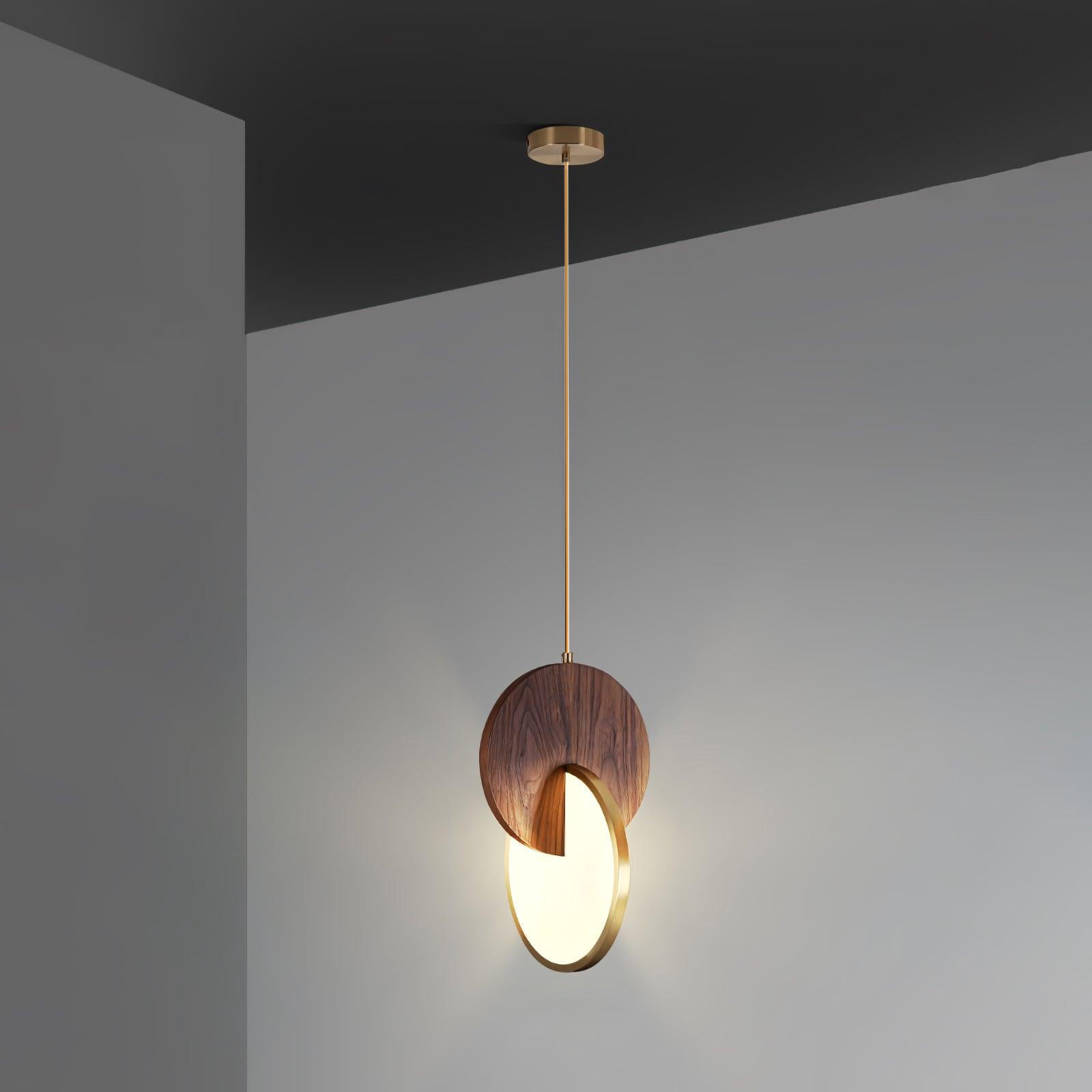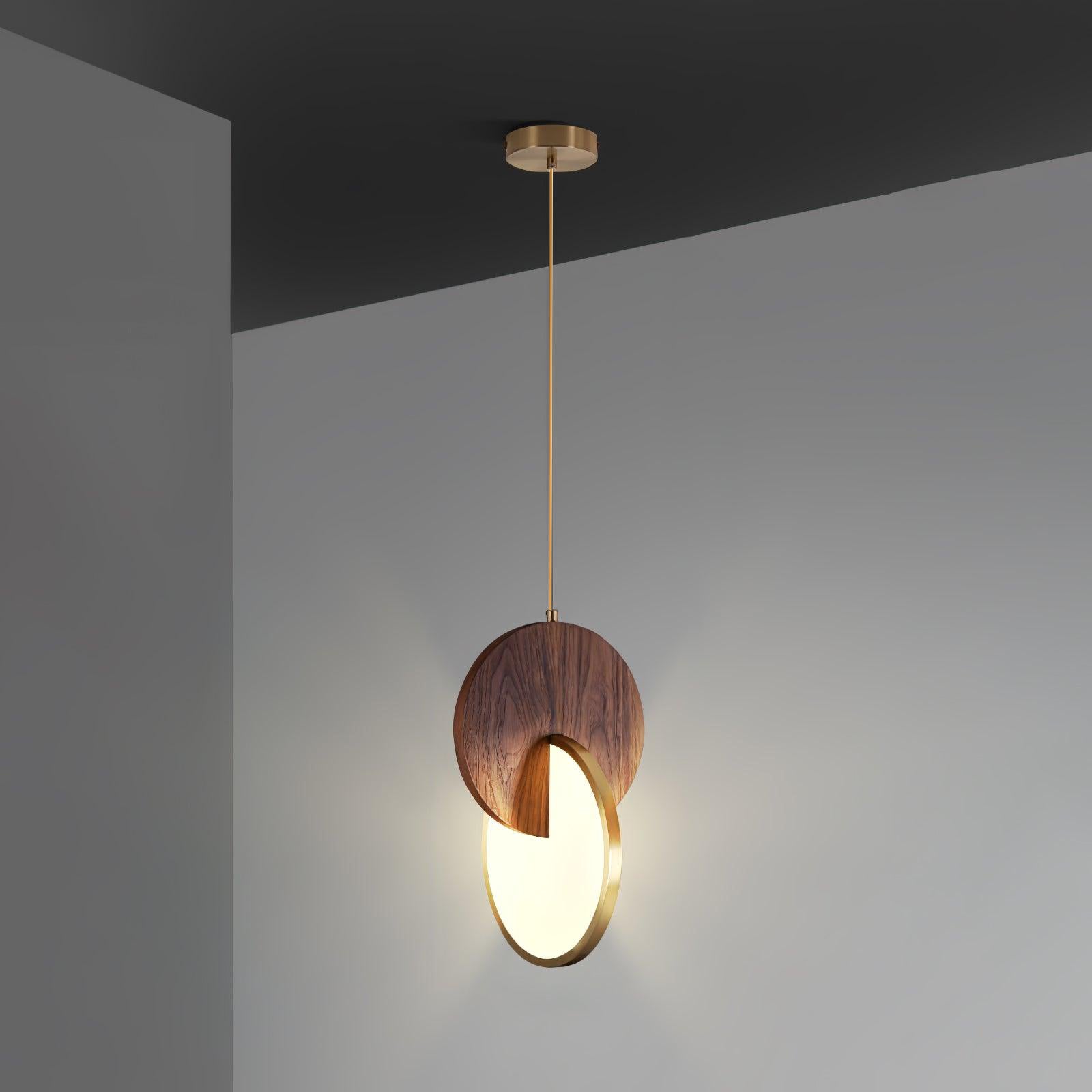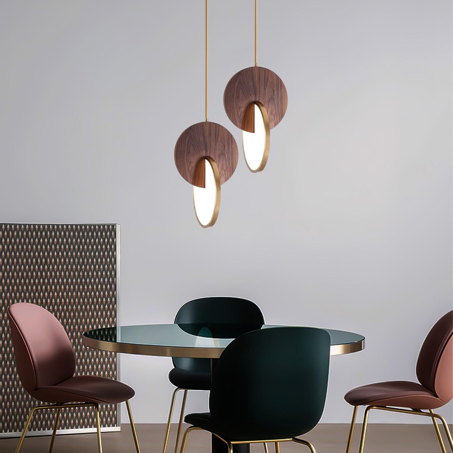 Die Double Disk Pendelleuchte ist eine Symphonie aus modernem Design und Materialien, bei der der rustikale Charme von Holz nahtlos mit der zeitgenössischen Eleganz von Metall und der leuchtenden Qualität von Acryl harmoniert. Diese avantgardistische Leuchte verfügt über zwei harmonisch ausgerichtete Scheiben – eine warme Holzscheibe, die die organischen Muster der Natur widerspiegelt, und eine reflektierende Metallscheibe, die einen Hauch von Modernität hinzufügt. Zwischen diesen beiden Scheiben sorgt ein Acryl-Diffusor dafür, dass das Licht sanft gestreut wird und einen warmen, einladenden Glanz erzeugt, der die Ästhetik jedes Raumes bereichert.