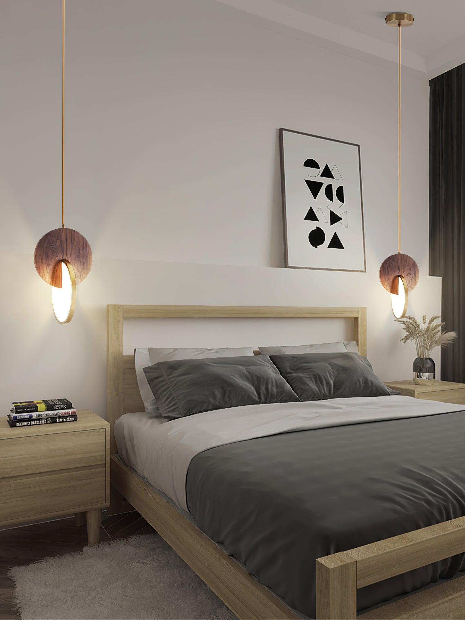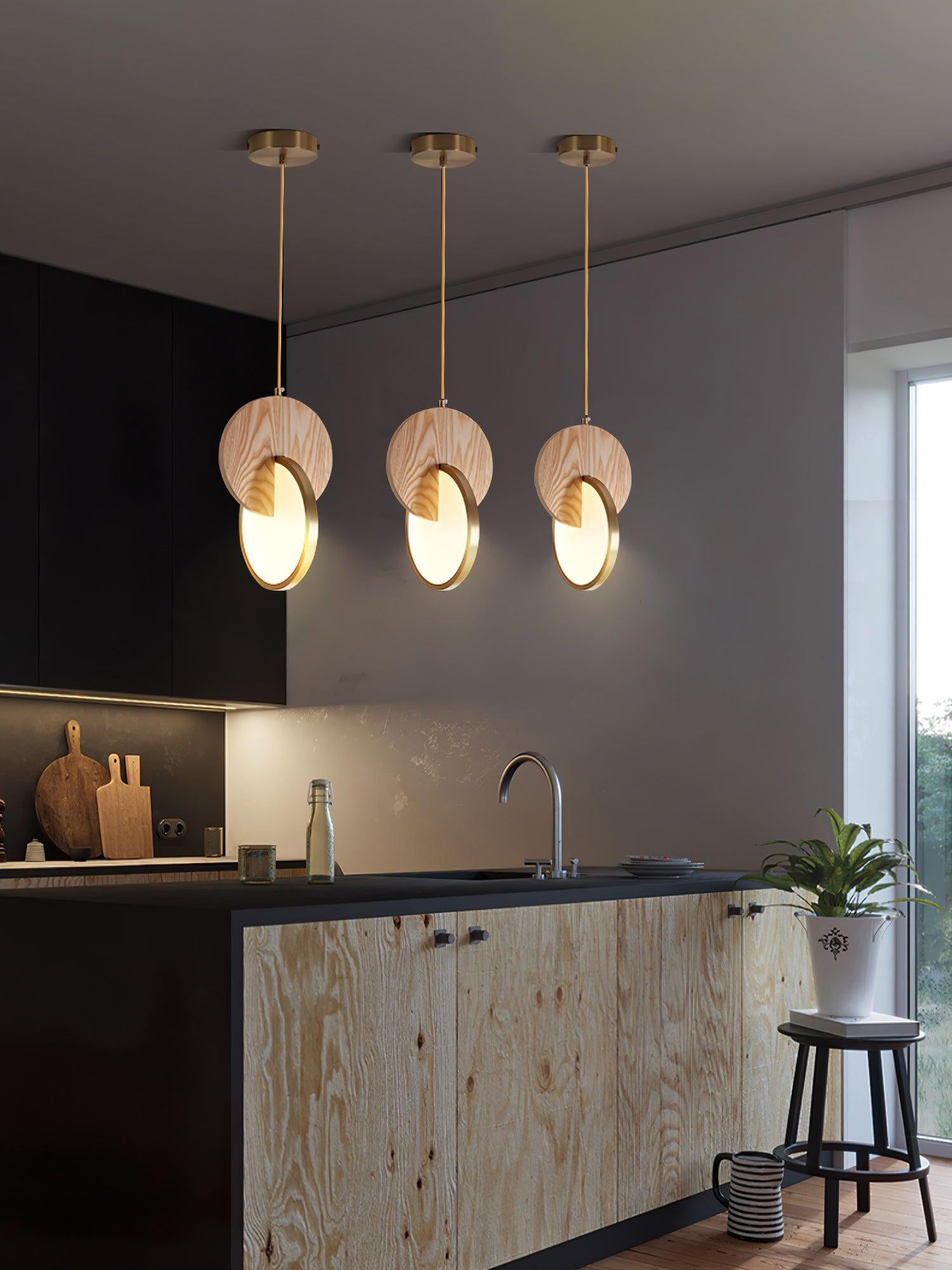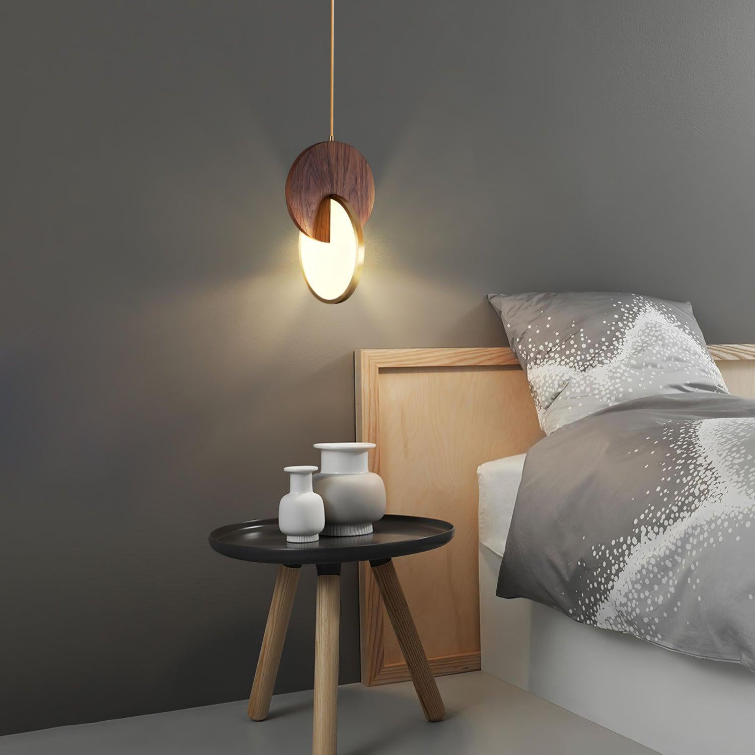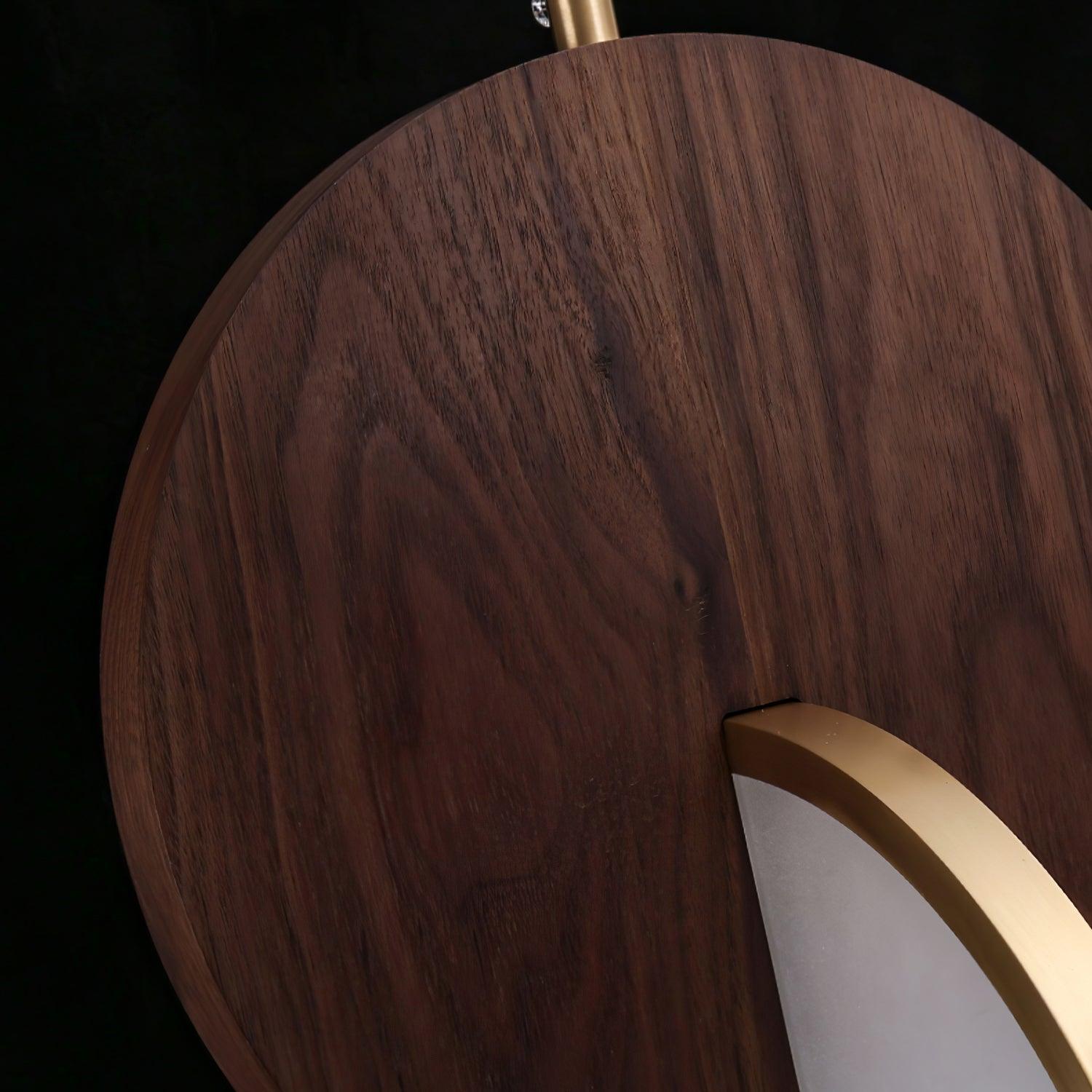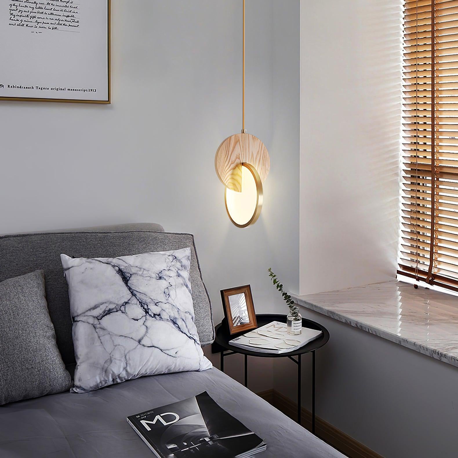 Die Double Disk Pendelleuchte ist eine Symphonie aus modernem Design und Materialien, bei der der rustikale Charme von Holz nahtlos mit der zeitgenössischen Eleganz von Metall und der leuchtenden Qualität von Acryl harmoniert. Diese avantgardistische Leuchte verfügt über zwei harmonisch ausgerichtete Scheiben – eine warme Holzscheibe, die die organischen Muster der Natur widerspiegelt, und eine reflektierende Metallscheibe, die einen Hauch von Modernität hinzufügt. Zwischen diesen beiden Scheiben sorgt ein Acryl-Diffusor dafür, dass das Licht sanft gestreut wird und einen warmen, einladenden Glanz erzeugt, der die Ästhetik jedes Raumes bereichert.