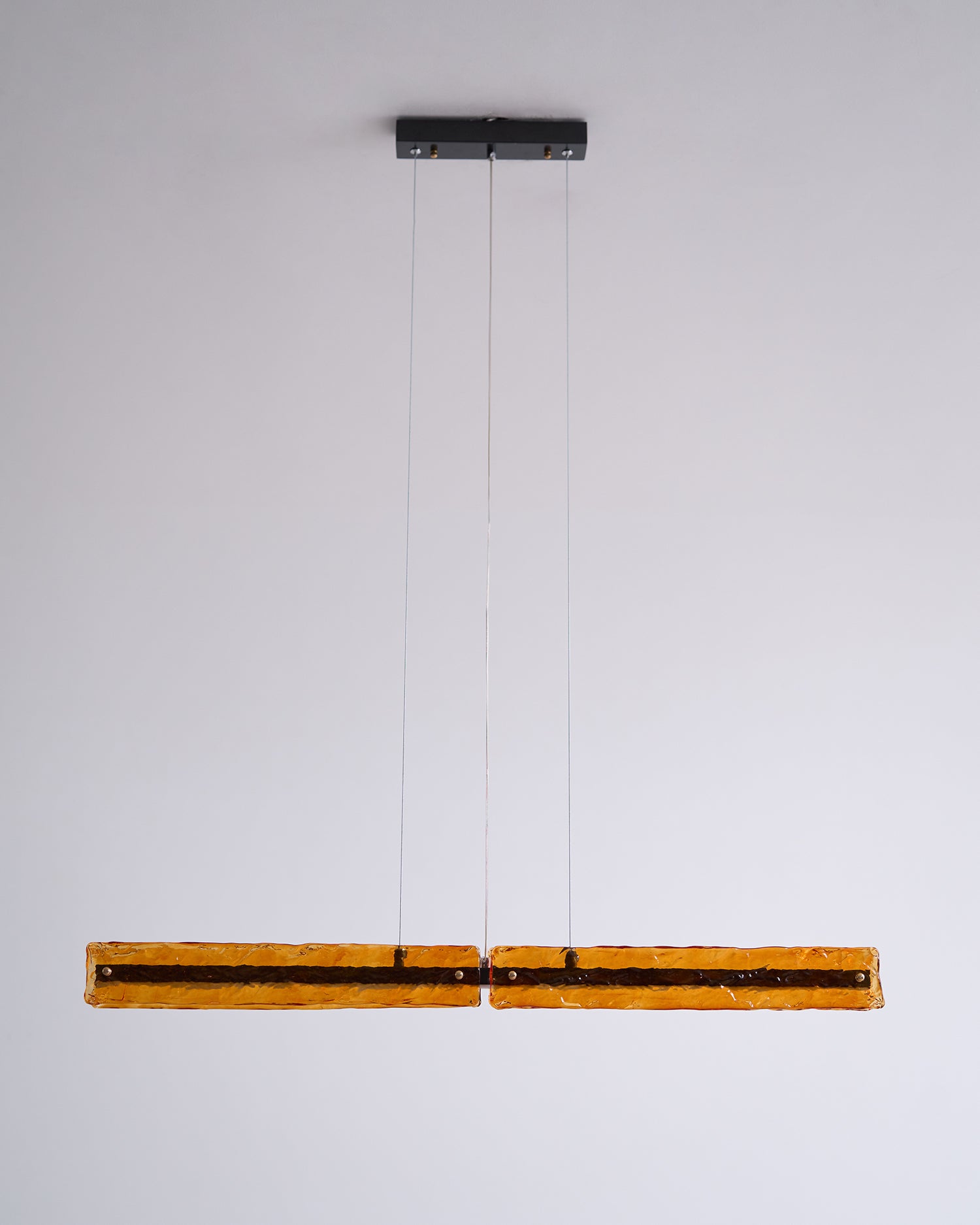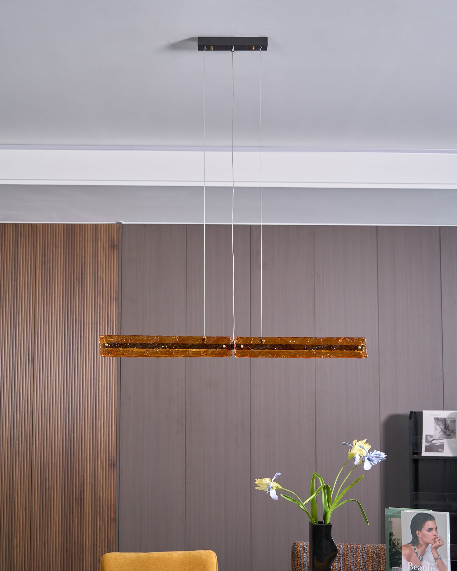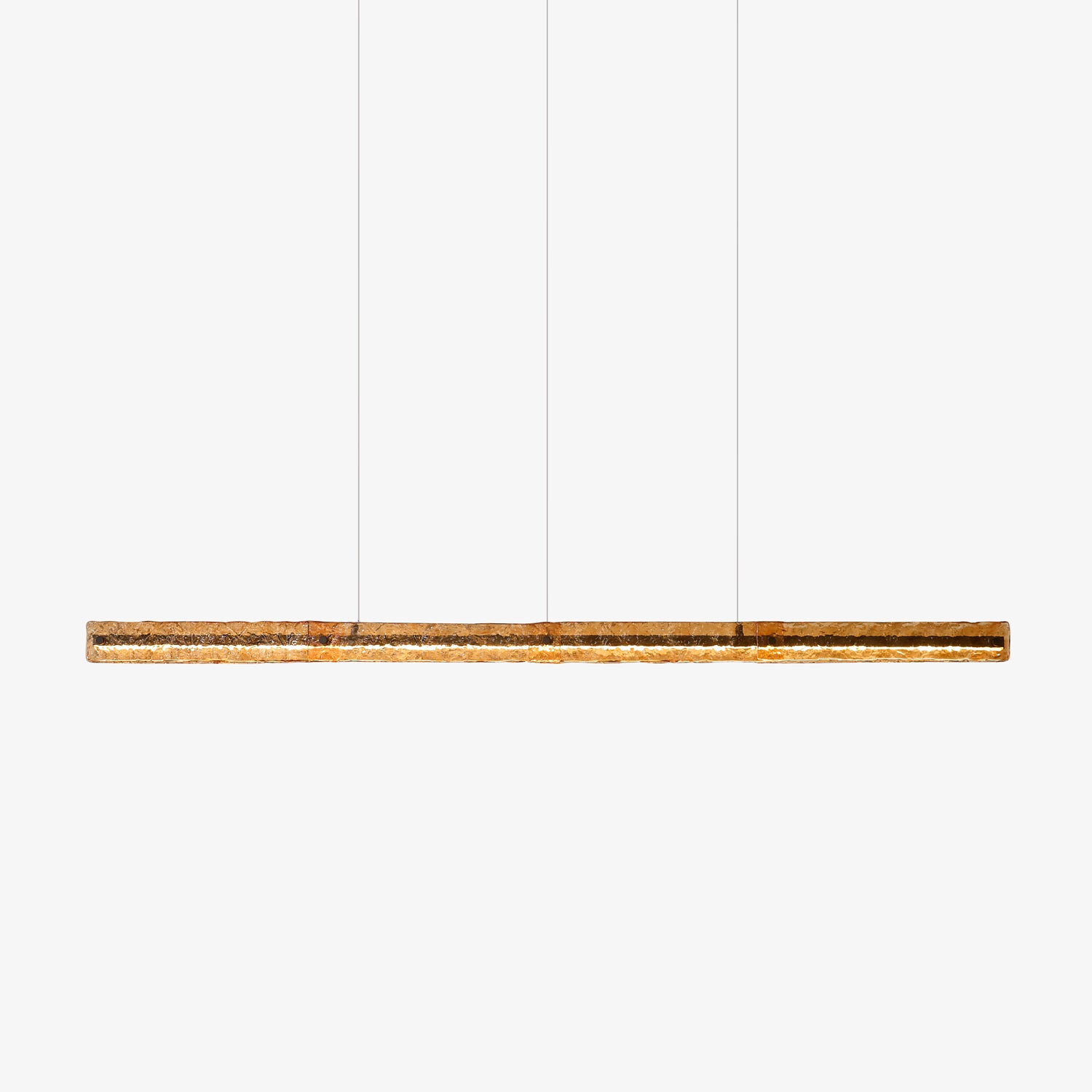 Die Pendelleuchte Oriona Linear verkörpert Eleganz und moderne Raffinesse. Mit ihrem schlanken, gehämmerten Glasdesign und dem verfeinerten Eisenrahmen bietet diese Lampe eine auffällige lineare Form, die sich nahtlos in jede zeitgenössische Umgebung einfügt. Die warmen, goldenen Farbtöne des Glases reflektieren ein sanftes, einladendes Licht, während der minimalistische Stil einen Hauch von industriellem Flair hinzufügt.
