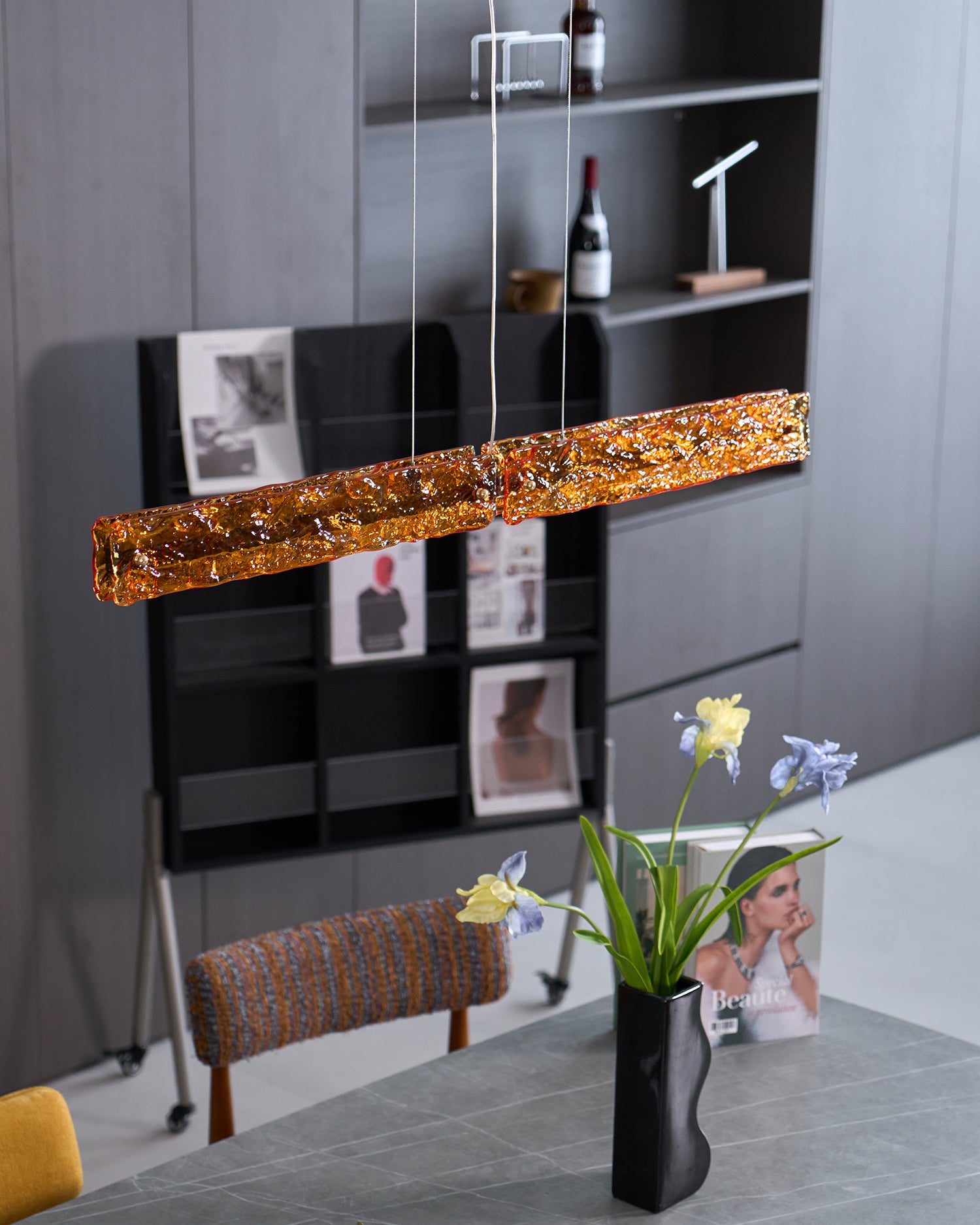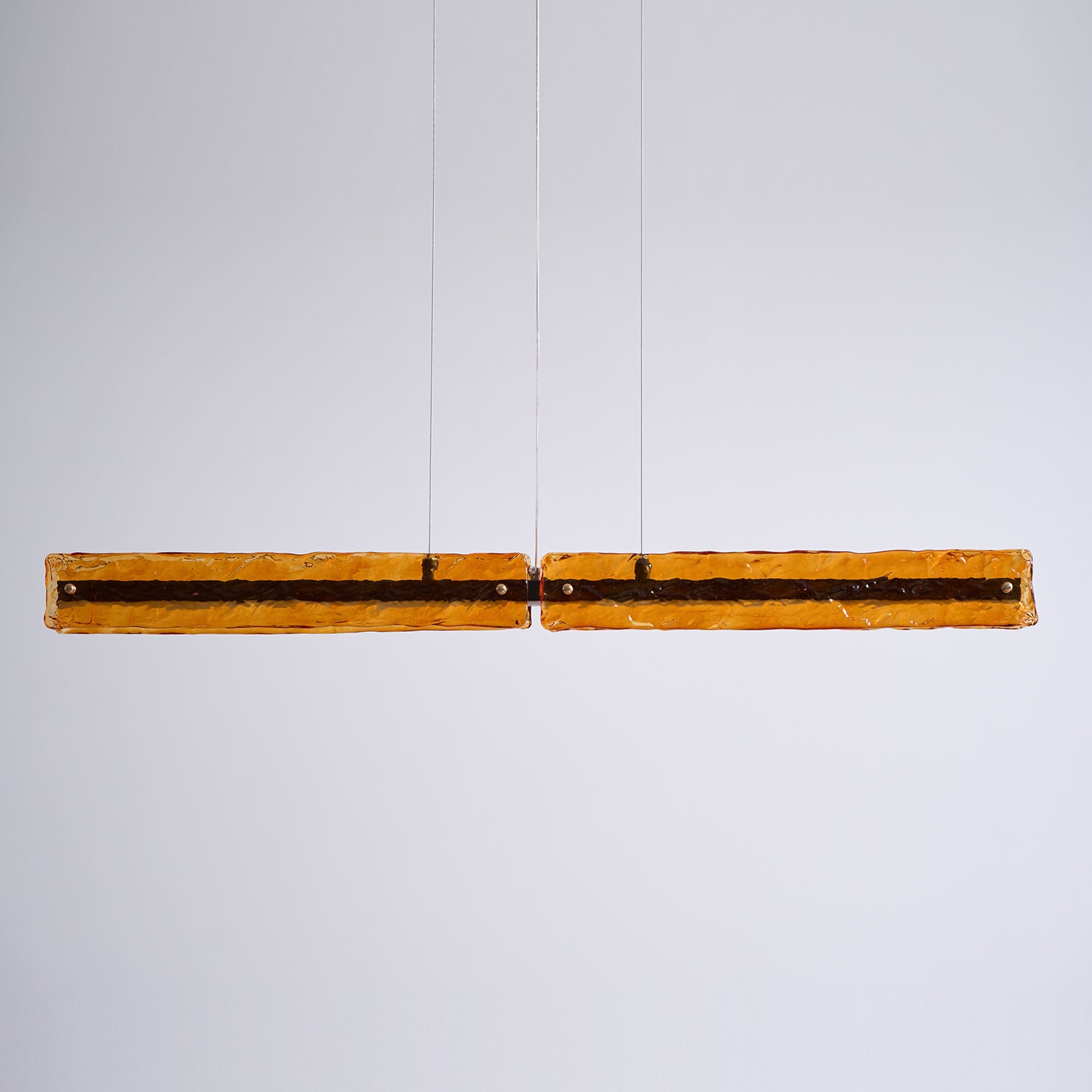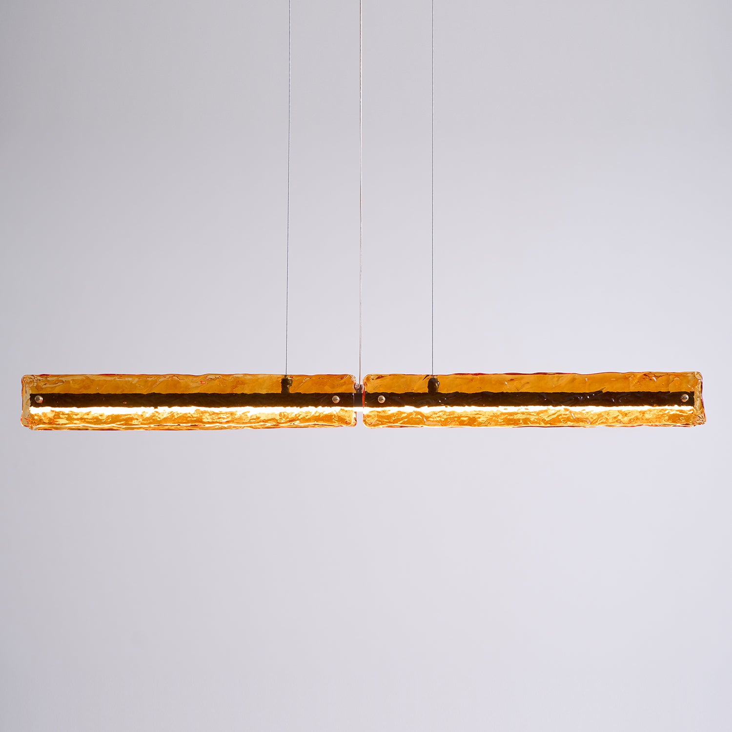 Die Pendelleuchte Oriona Linear verkörpert Eleganz und moderne Raffinesse. Mit ihrem schlanken, gehämmerten Glasdesign und dem verfeinerten Eisenrahmen bietet diese Lampe eine auffällige lineare Form, die sich nahtlos in jede zeitgenössische Umgebung einfügt. Die warmen, goldenen Farbtöne des Glases reflektieren ein sanftes, einladendes Licht, während der minimalistische Stil einen Hauch von industriellem Flair hinzufügt.