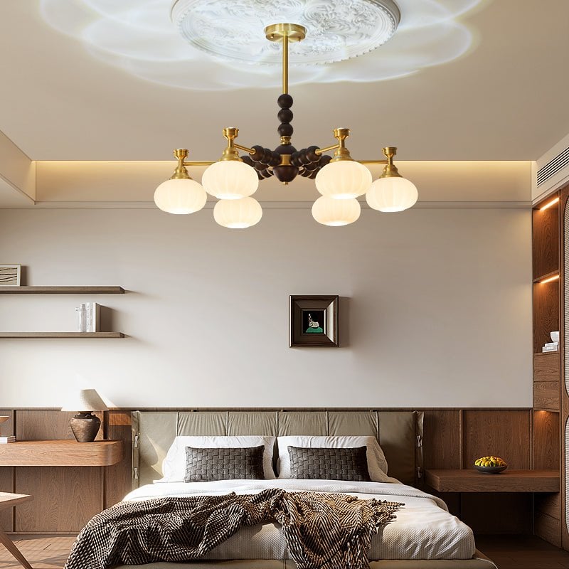Eine harmonische Fusion aus Eisen, Glas und Holz, dieses Lichtkunstwerk verkörpert die Eleganz der himmlischen Bewegung und der natürlichen Elemente. Mit seinen sanft geschwungenen Armen und warm leuchtenden Kugeln bringt es eine raffinierte, zugleich organische Atmosphäre in jeden Raum, die an eine sanfte Brise unter der goldenen Sonne erinnert.