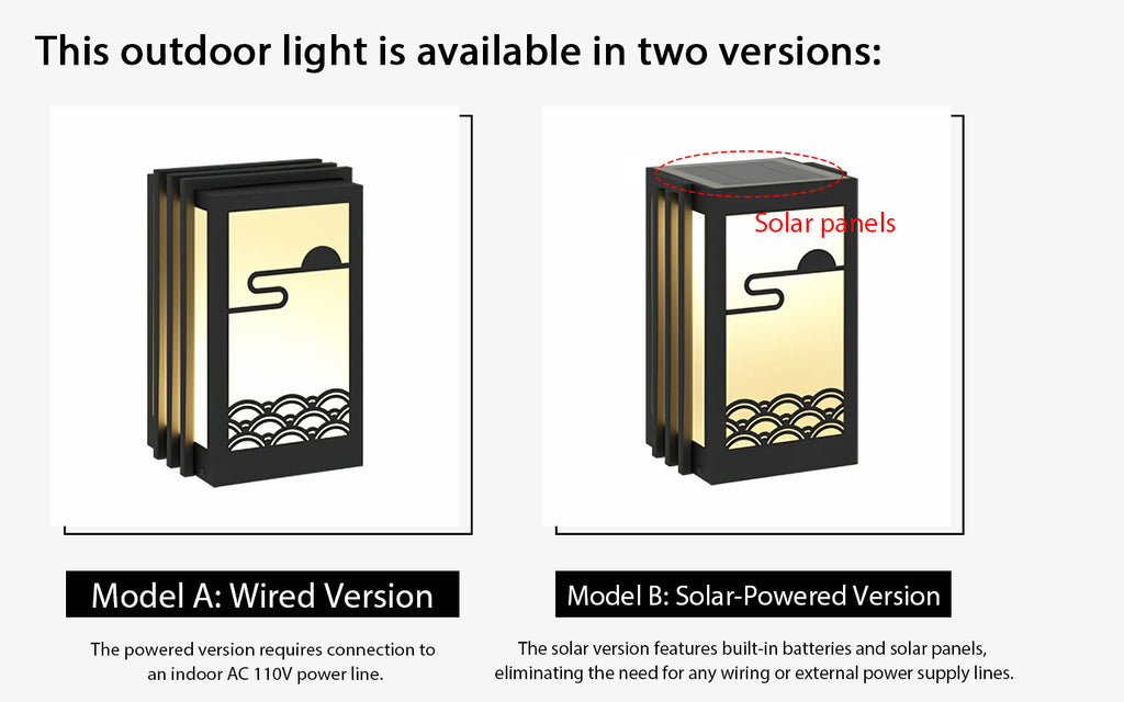 Spannung: AC 110-240V (drahtgebundene Version) / DC 3.2V (solarbetriebene Version).