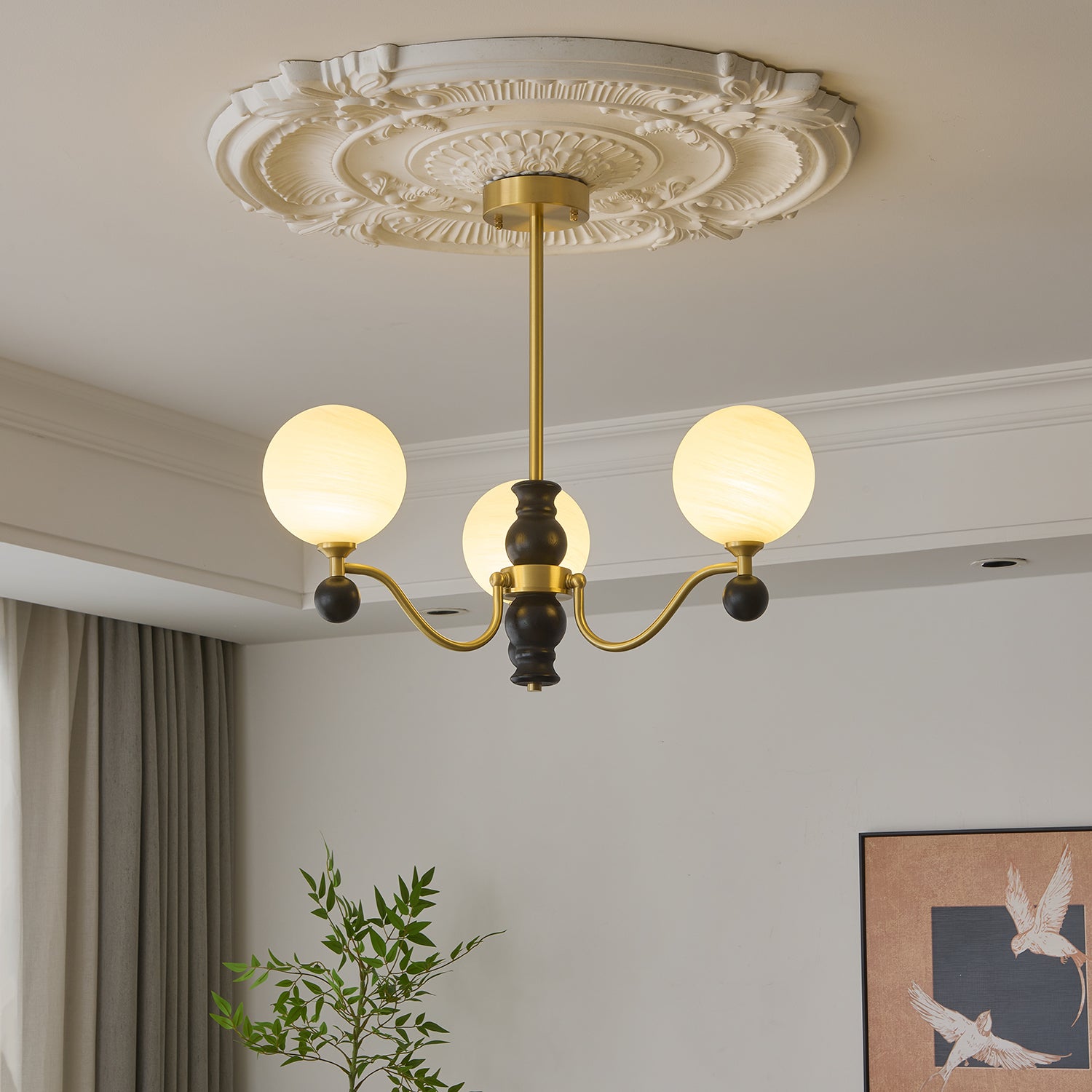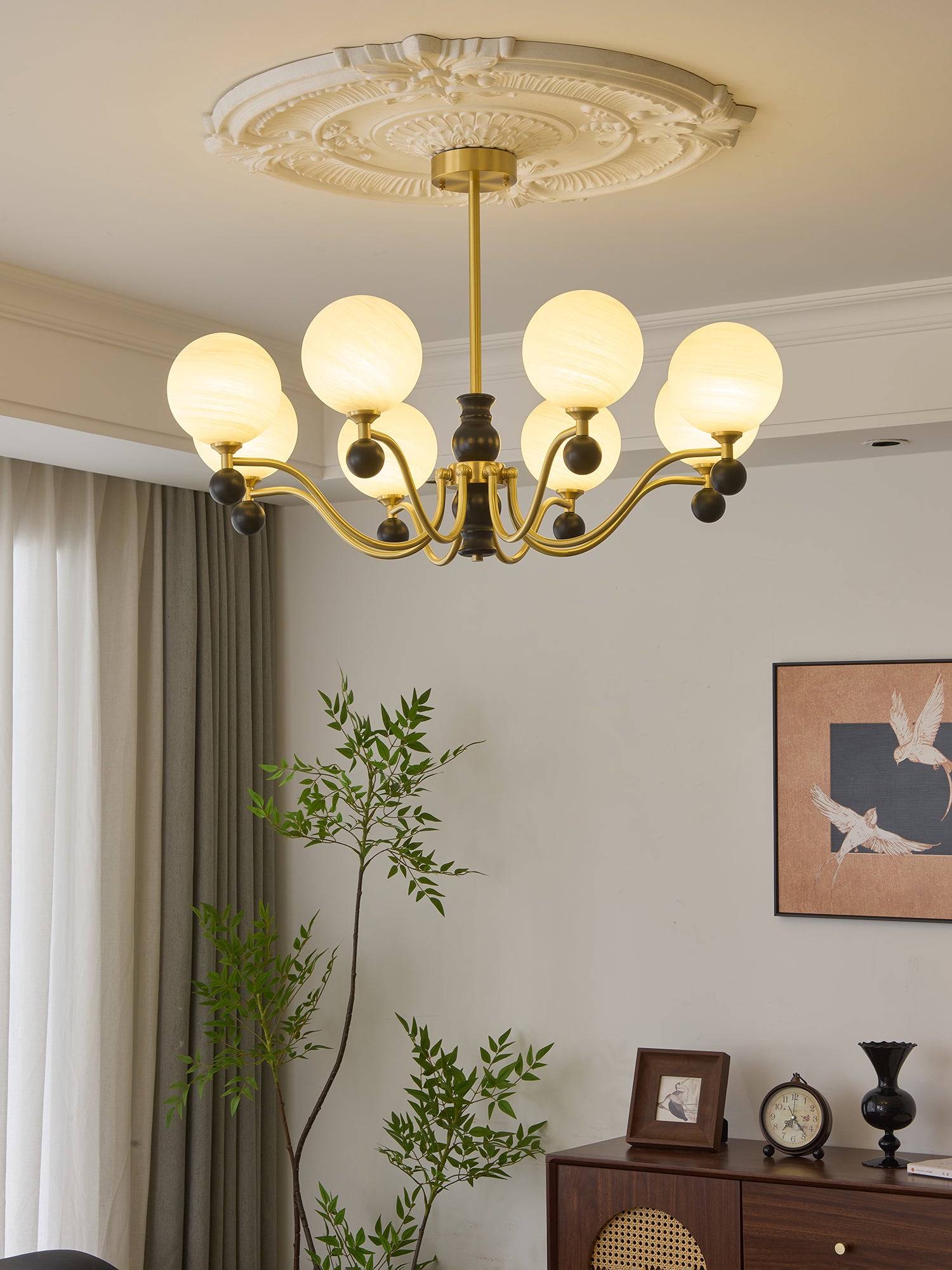 The Rosetta Chandelier by Lighting embodies a perfect balance of vintage charm and modern refinement. Featuring gracefully curved golden iron arms, rich wooden accents, and delicately textured glass shades, this chandelier casts a soft, inviting glow reminiscent of blooming petals. Designed to elevate any space, from a sophisticated dining room to a cozy living area, the Rosetta Chandelier is a statement of timeless beauty and craftsmanship.