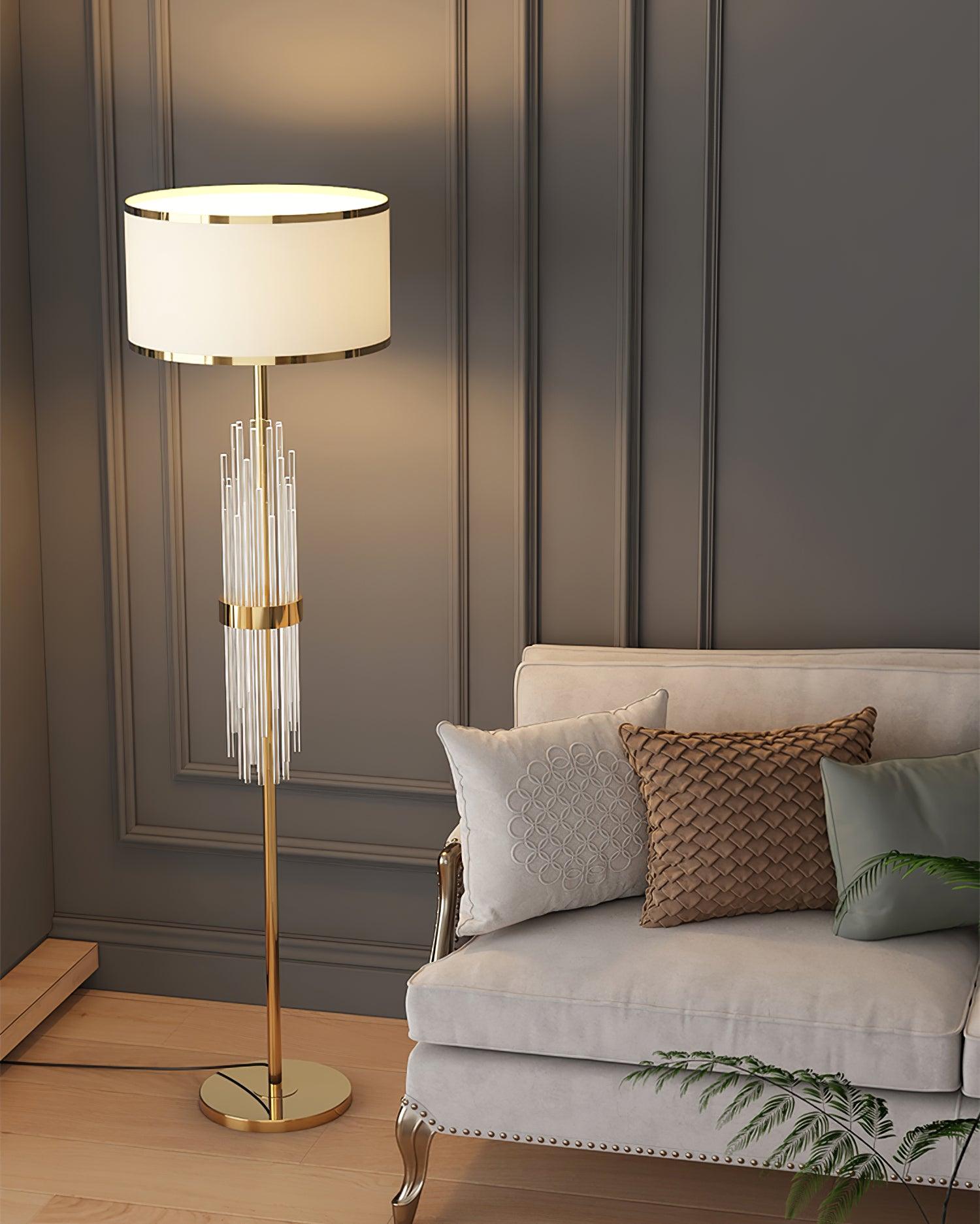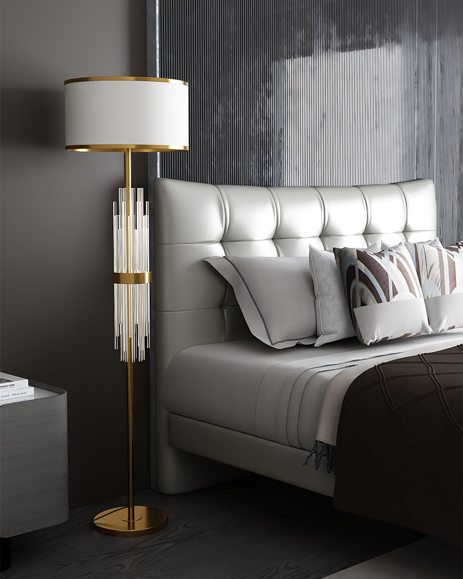 Add a conversation-starter to your living room or bedroom - guests won't be able to take their eyes off the clear and linear design, all garnished with a gilded metal and white fabric lampshade! Talk about dazzling!