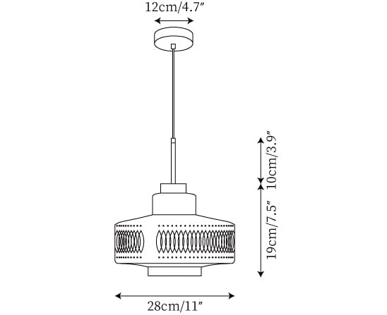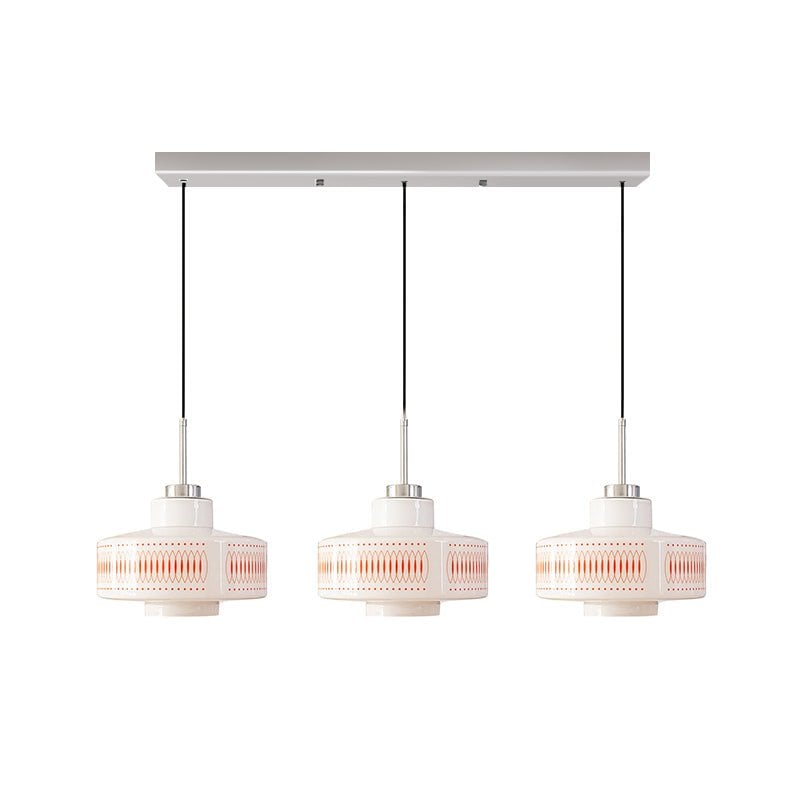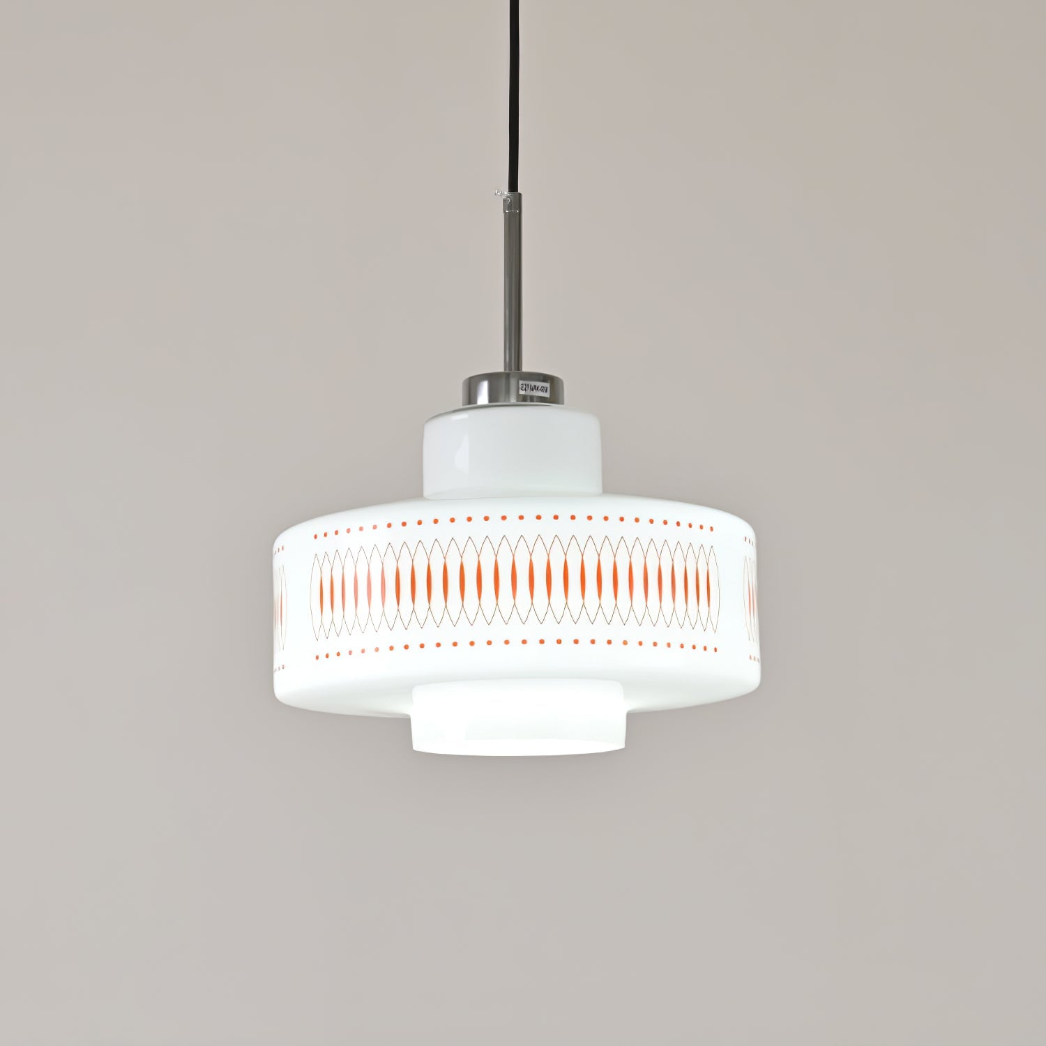 The Anna Pendant Lamp effortlessly blends modern functionality with vintage charm. The unique glass shade features a striking warm orange geometric pattern, providing a warm and nostalgic ambiance. The polished metal fixture adds a touch of modern elegance, making it the perfect addition to any contemporary or retro space.