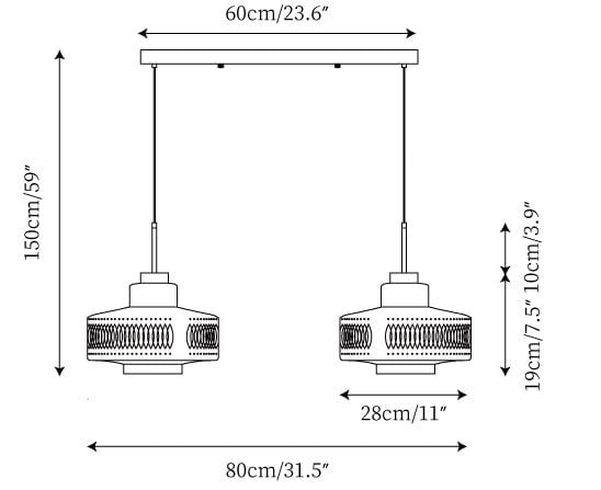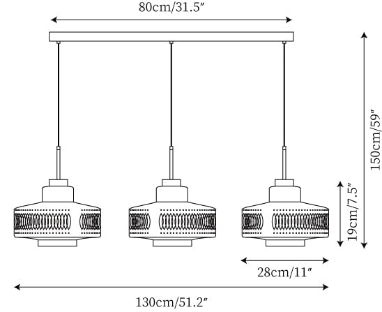59″ Adjustable hanging height cable. Can be extended upon request.