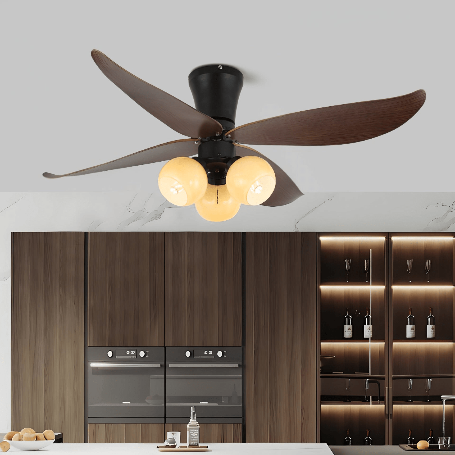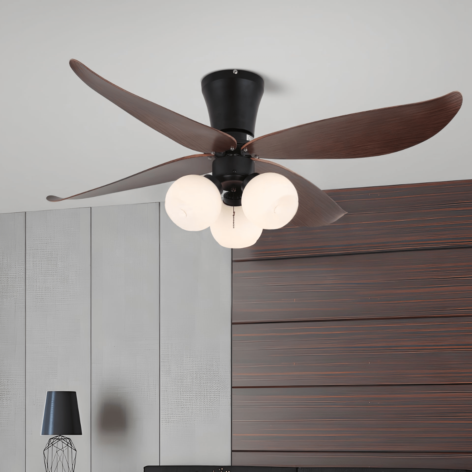 The Arbora Bloom Ceiling Fan Light channels organic beauty through petal-shaped wooden blades and soft glass globes that echo blooming flowers. Its dark wood grain and matte black base add a grounded sophistication, while the multi-light design ensures bright, even illumination—ideal for cozy bedrooms, tranquil dining rooms, or nature-themed interiors.