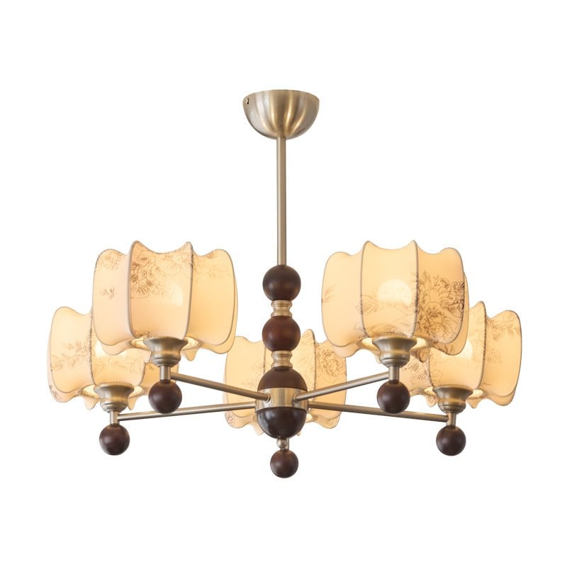 Inspired by the harmony of nature, the Arboris Floral Chandelier features a unique combination of soft fabric shades with intricate floral engravings, set upon a sturdy iron frame with wood accents. The contrast between the metal, wood, and fabric creates a refined, organic look that adds timeless beauty to any space. Its calming light and artistic design bring warmth and elegance, making it a standout feature in any room.