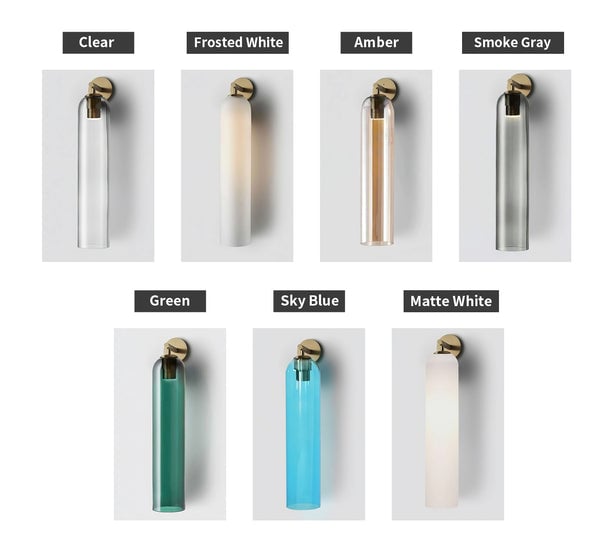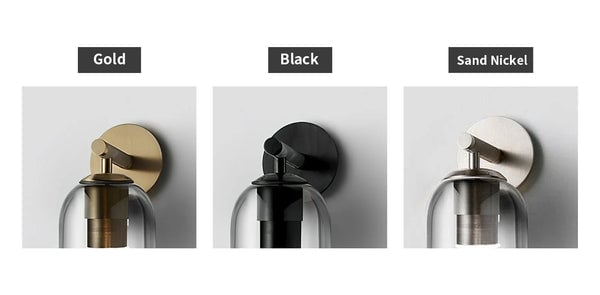 This wall light is available in three finishes: Black, Gold, and Sand Nickel, with glass shades in seven finishes: Clear, Frosted White, Amber, Smoke Gray, Green, Sky Blue, and Matte White. See comparison images below.