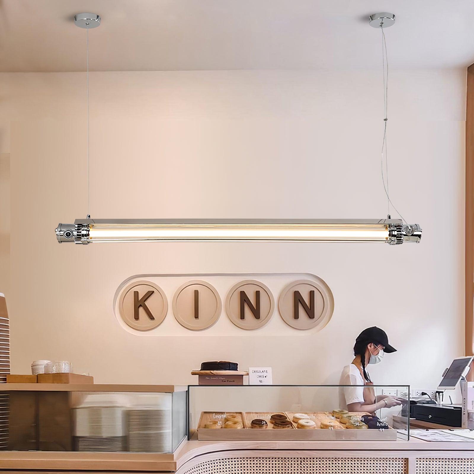 A 48” long row of symmetrical channel-set diffusers, each handcrafted artisan from clear cast glass, evokes the look of jewelry in this glittering linear chandelier. Sleek and sparkling, this clean-lined design elevates kitchens, bars and other functional entertaining spaces without blocking views.