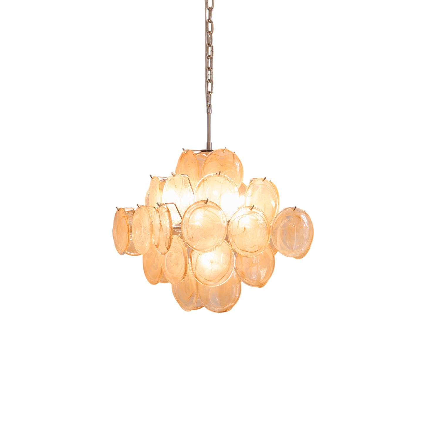 The Aurelia Apricot Murano Glass Chandelier is a radiant celebration of craftsmanship and color. Made from delicately swirled Murano glass, each apricot-toned disc shimmers with subtle translucence, creating a warm and inviting glow when illuminated.