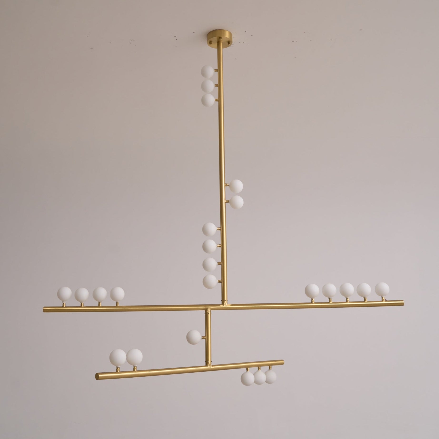 Brass Glass Drop Chandelier is an elegant fusion of form and function, featuring flexible joints that allow its slender rods to gracefully tilt, capturing the essence of organic movement. Adorned with delicate blown glass orbs reminiscent of pearls, and available in finishes like brushed brass and tarnished nickel, this chandelier brings a touch of natural sophistication to any space.