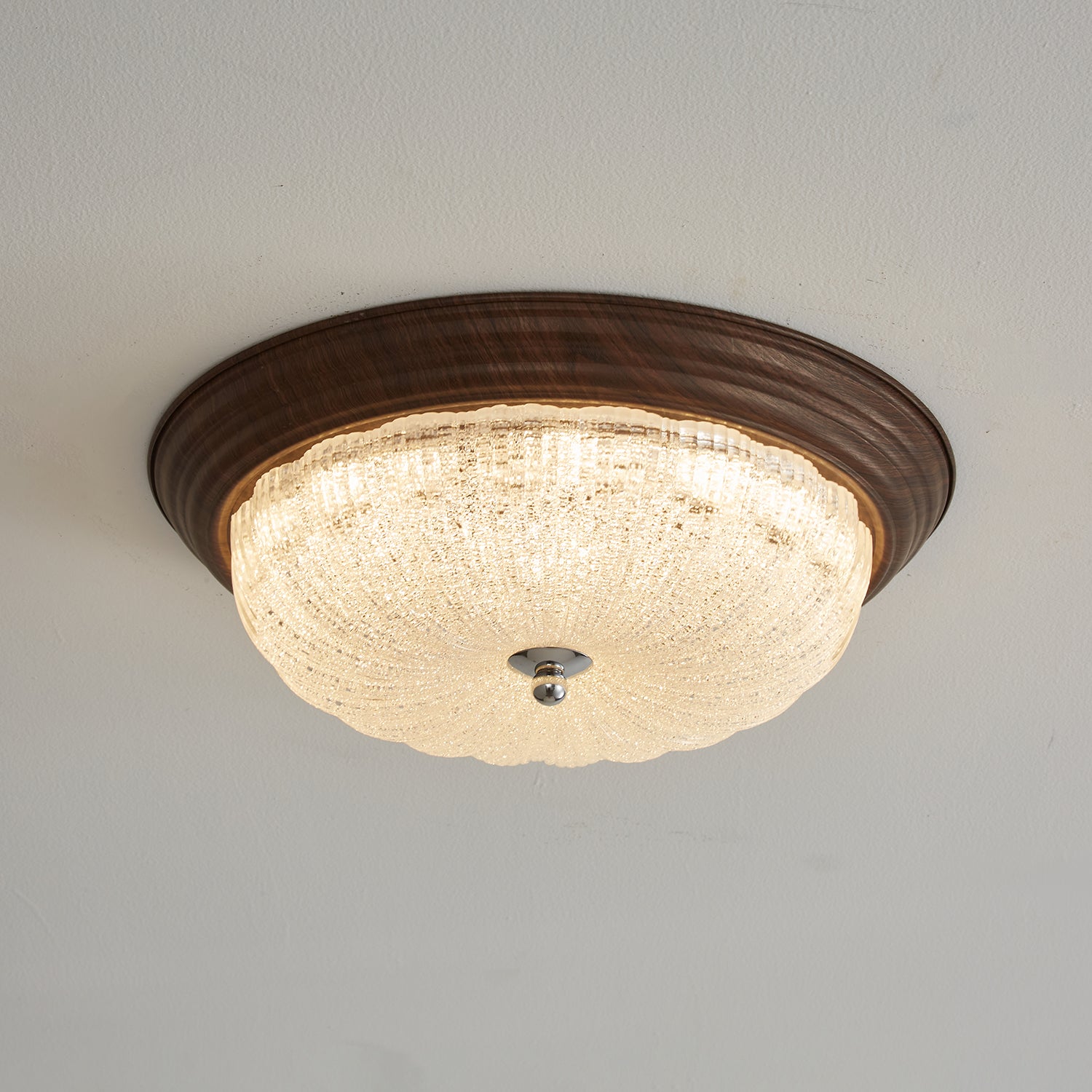 The Celestia Walnut Ceiling Light by Lighting blends timeless elegance with modern craftsmanship. Featuring a water-transfer walnut wood grain finish and a delicately textured glass dome, it casts a soft, radiant glow that enhances any sophisticated interior.