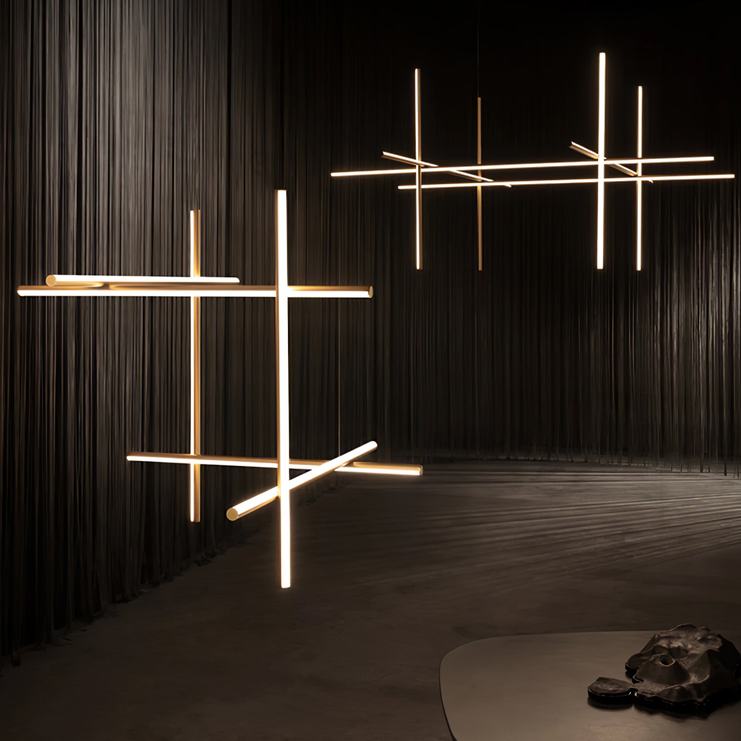 Coordinates is a lighting system consisting of horizontal and vertical strip lights that form illuminated grid-like structures of various complexities. This collection of standard chandeliers of pared-down configurations that can be used in any setting.