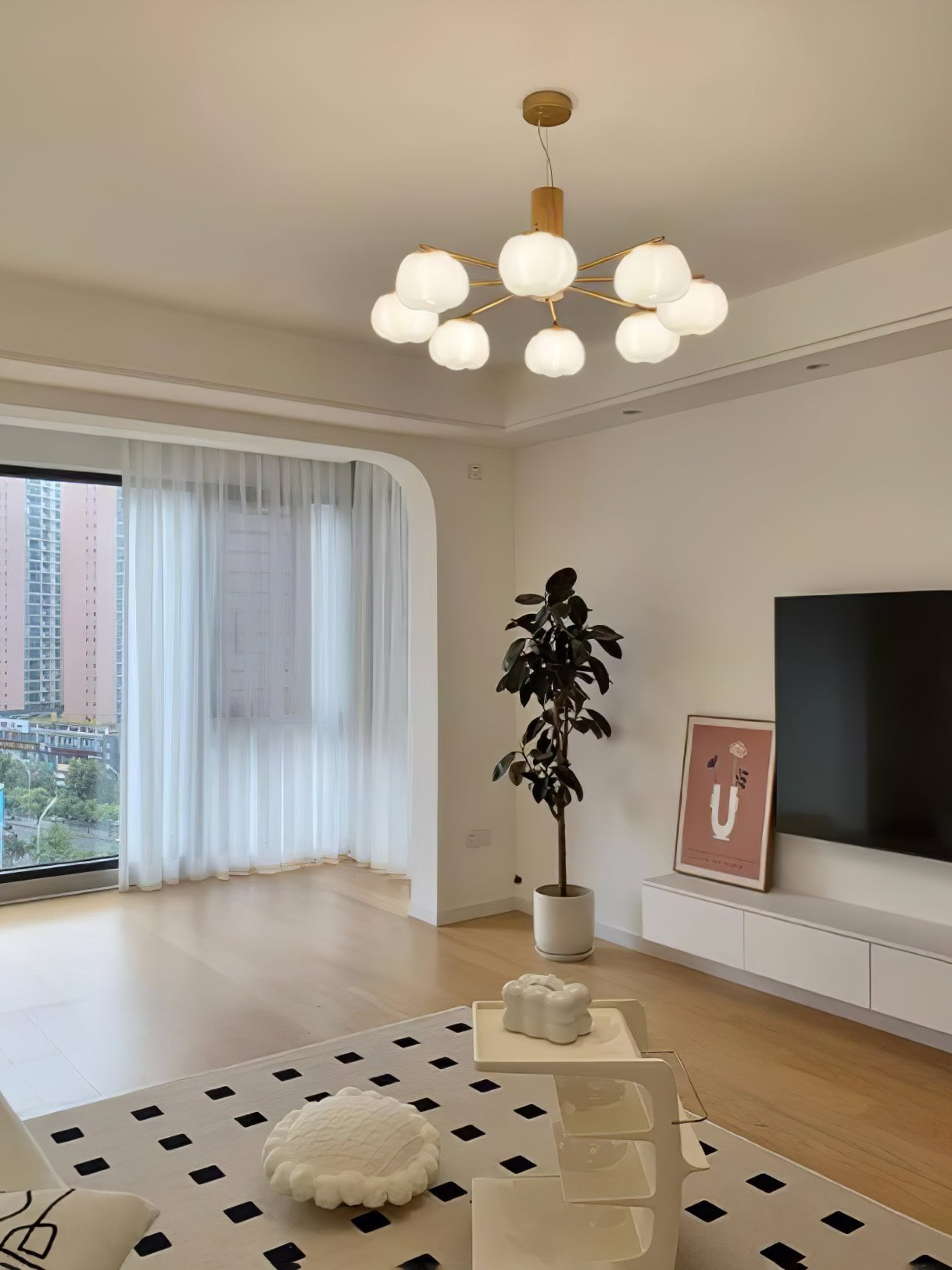 The Cotton Balls Chandelier will elevate any room with its sleek design. Made with gold metal and white acrylic, this chandelier creates a warm and inviting atmosphere. Its modern shape and minimalistic look make for a chic addition to any space.