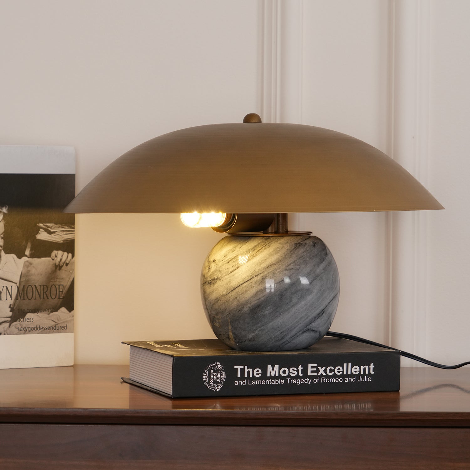 This Formosa Marble Table Lamp features an artistic design, with a polished brass shade floating on a handmade marble base. The dynamic tilt of the shiny metal shade creates a vibrant contrast with the organic swirls of grey, white, and black on the stone sphere. Illuminate your space with this lively and unique lamp.