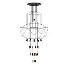 The Wireflow 3D lamp is a reinterpretation and reinvention of the classic chandelier fitting. The supporting structure for the Wireflow 3D light fitting is constructed using the black electrical cable and 2 Watt LED light sources, the lamp is characterized by these very materials which define the collection.