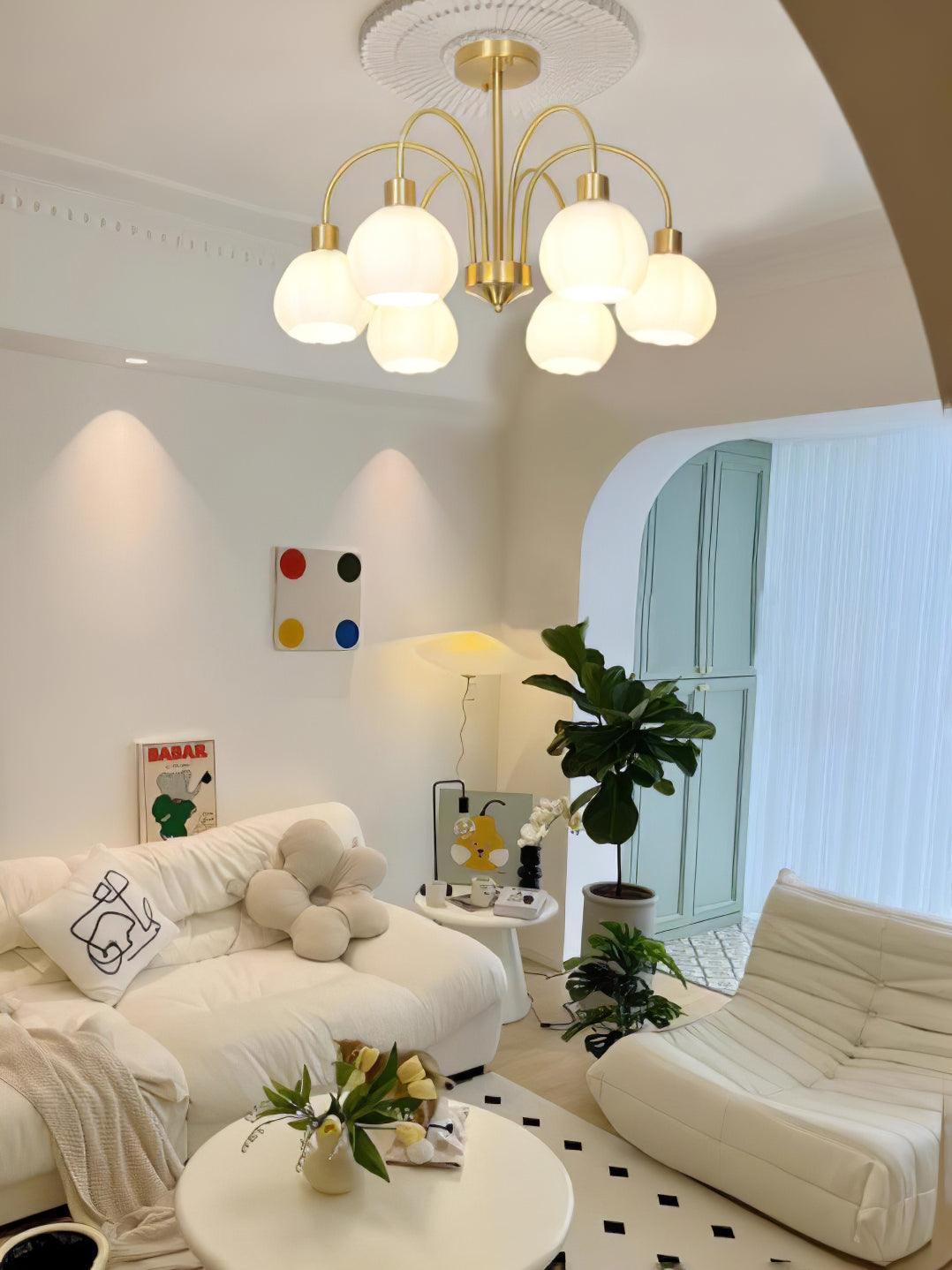 This Glass Pumpkin Gold Chandelier is an elegant and timeless piece, perfect for adding a luxurious touch to any room. Its sophisticated gold finish accentuates the luminous glass pumpkins, providing a beautiful, metallic glimmer that will draw the eye of any guest. With its classic design, this one-of-a-kind chandelier provides a timeless look of luxury.