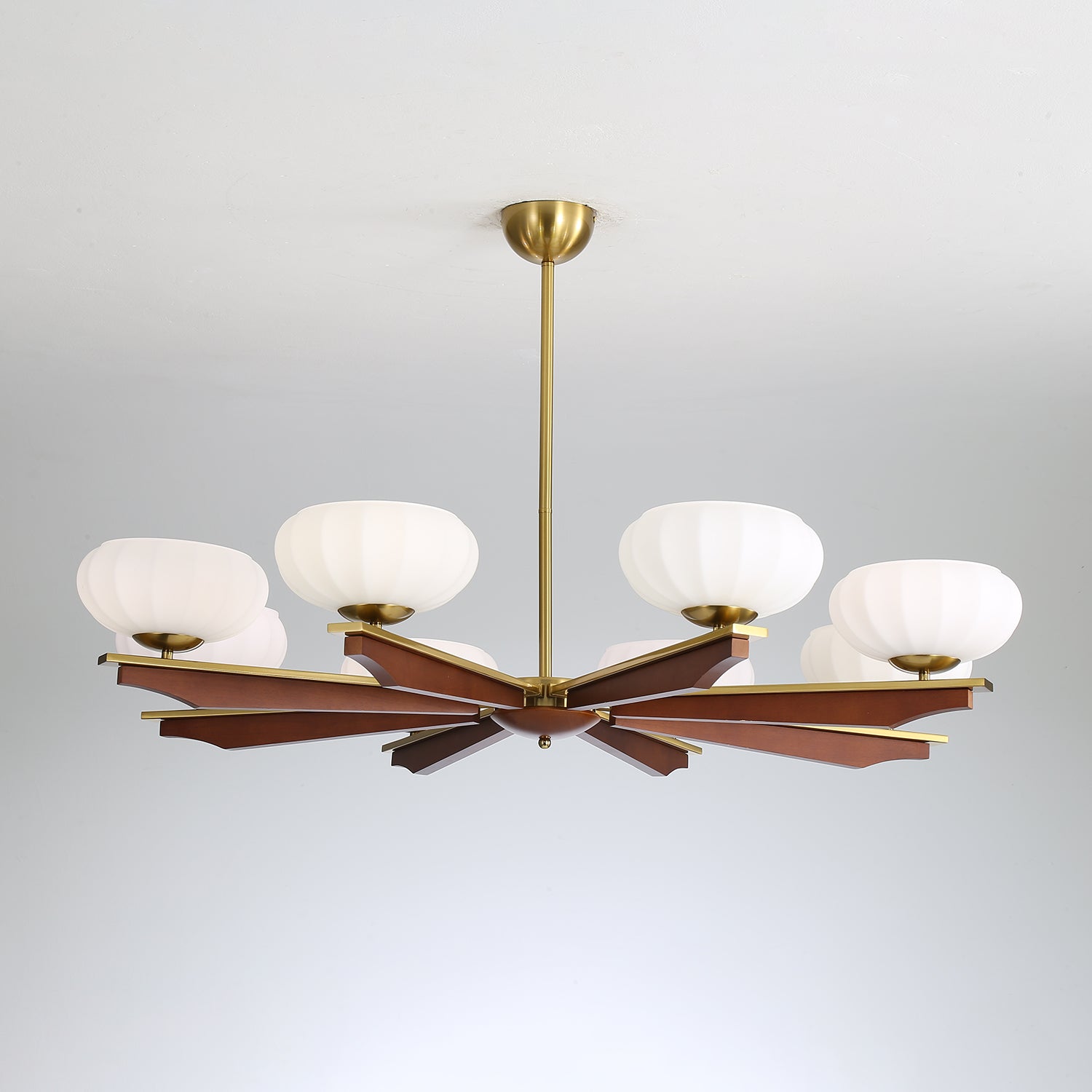 The Imperium Chandelier by Lighting is a statement piece that blends timeless craftsmanship with modern elegance. Crafted with glass, iron, and wood, this chandelier embodies regal sophistication. Its sculpted glass shades, reminiscent of delicate lanterns, diffuse a soft and ambient glow, while the sleek iron framework provides durability and structure. The warm wooden elements introduce an organic touch, making it a perfect addition to dining rooms, living spaces, and grand foyers. With its balanced design and luminous presence, the Imperium Chandelier transforms any space into a realm of refined luxury.