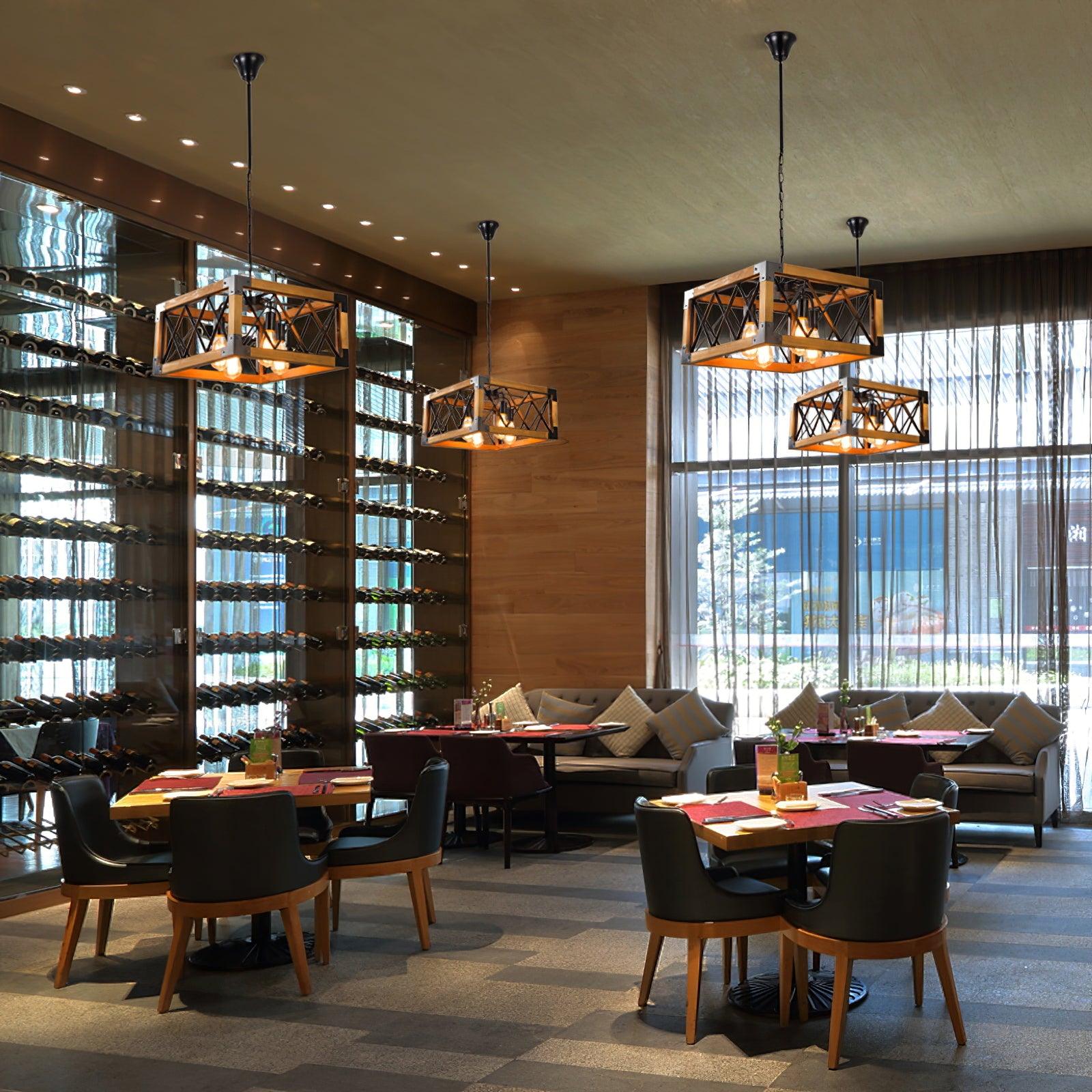 The perfect combination of wood and metal to create a unique modern farmhouse style, Hanging directly this charming 5-light island light fixture over your dining table or kitchen island , bright lighting. With Oak wood, The kitchen island chandelier light is durable and beautiful. With 5 bulbs (not included ), this pendant light can illuminate your space with it's bright but warm light. Made with a rectangular wooden cage shape shade, it is not only your industrial kitchen island pendant lighting, but also an ornament for your home table.