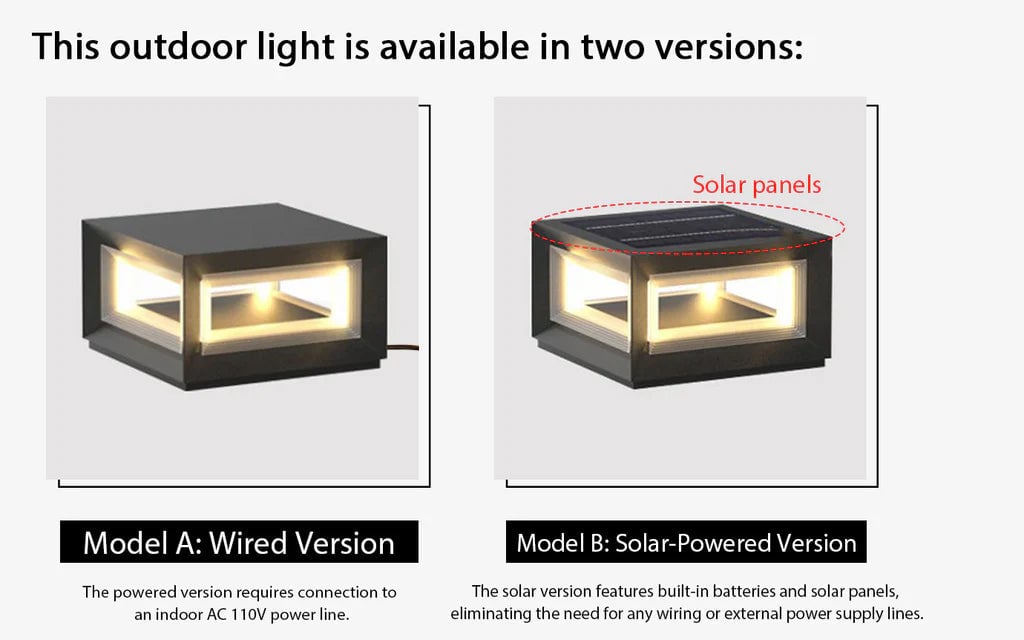 Voltage: AC 110-240V (Wired version) / DC 3.2V (Solar-powered version).