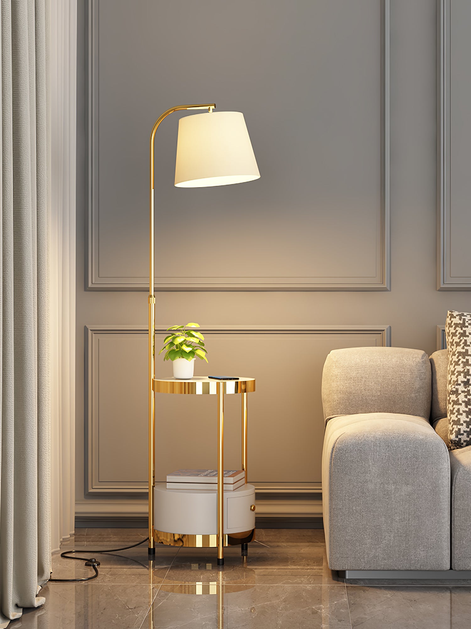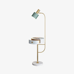 Illuminate your space while adding a functional surface with the Lilah Floor Lamp End Table with Storage Shelf. This table and lamp combination features a metal base with a gold finish, a beige drum shade, and a faux marble tabletop for a modern addition to your bedroom or living space.With a storage shelf under the tabletop, this table provides plenty of space for your phone, remotes, books, and other small items.