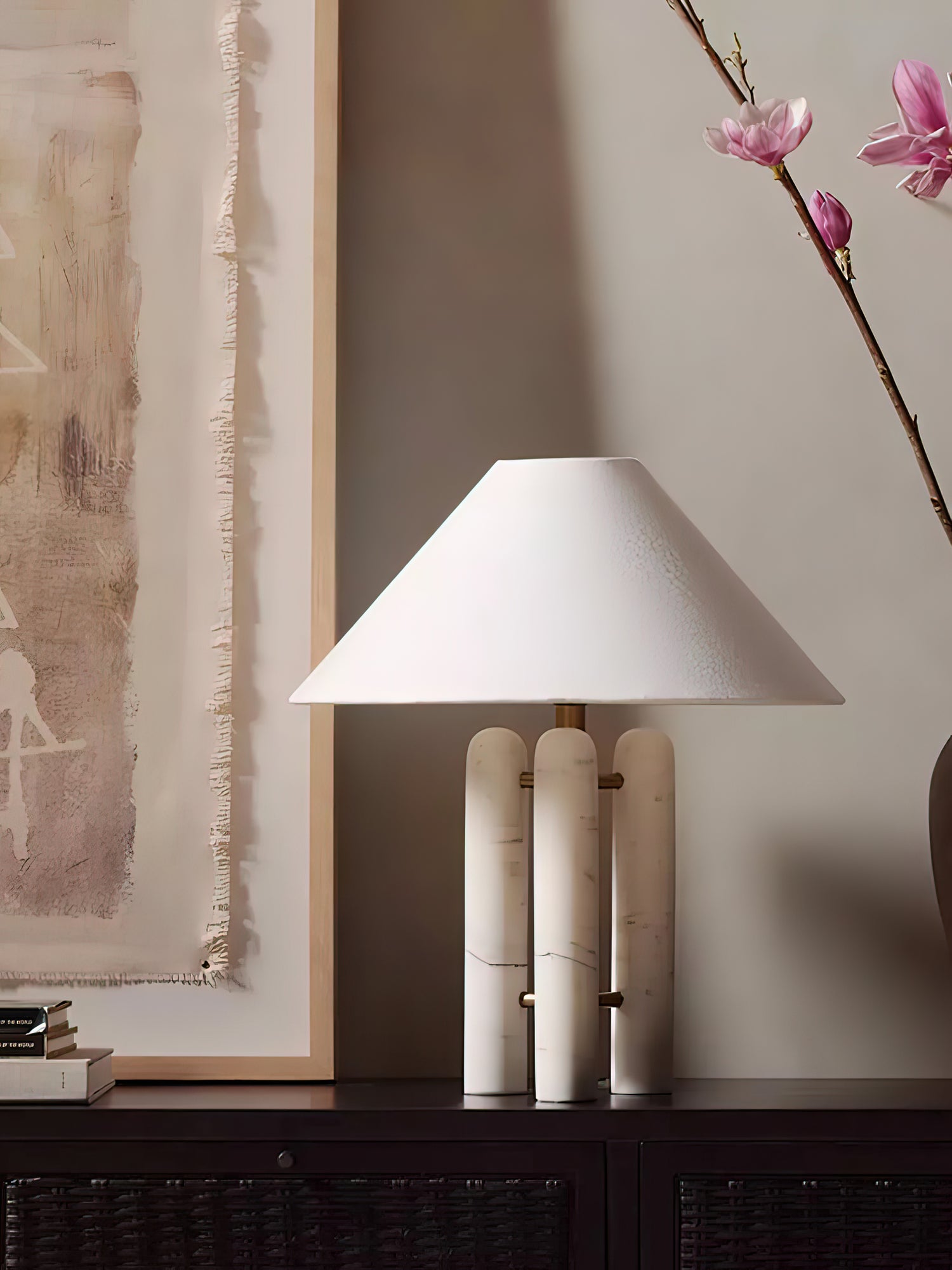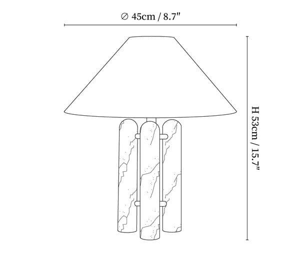Add a touch of classical architecture to your space with the Lloyd Table Lamp. Featuring three marble columns, metal accents, and a large silken shade, this sculptural lamp elevates any room with its beautiful mix of textures. Perfect for creating a luxurious yet livable design.