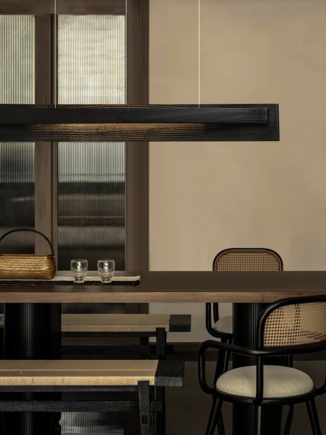 The Lucien Linear Pendant Lamp is an embodiment of refined modernity. Its linear wooden structure, suspended by discreet steel cables, offers a seamless blend of style and functionality. Whether used above a dining table or in a workspace, the Lucien delivers warm, diffused lighting that enhances the ambiance while adding a touch of architectural elegance.