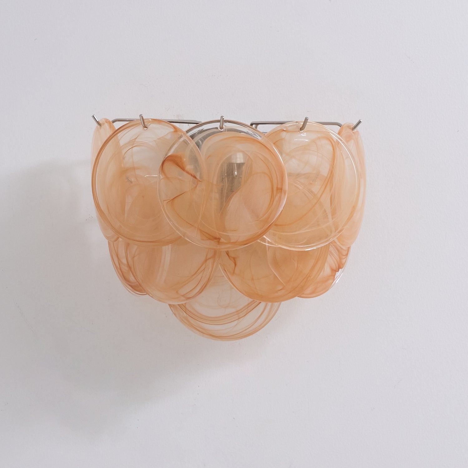 The Lunaria Disc Murano Wall Lamp is a radiant composition of handcrafted Murano glass, each disc swirling with delicate pigment and organic texture. Suspended in layers from a sleek metal frame, these iridescent forms shimmer and shift with the light—casting a dreamy, kaleidoscopic glow that transforms any room into a gallery of soft color and refined elegance.