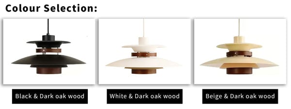 Shade Finishes: Black+Walnut wood, Beige+Walnut wood, White+Walnut wood.