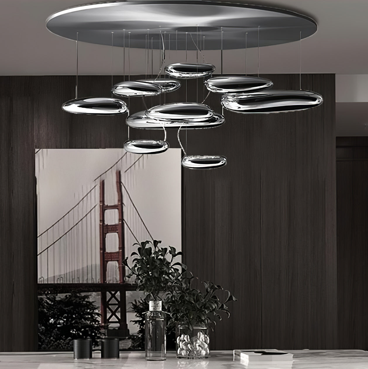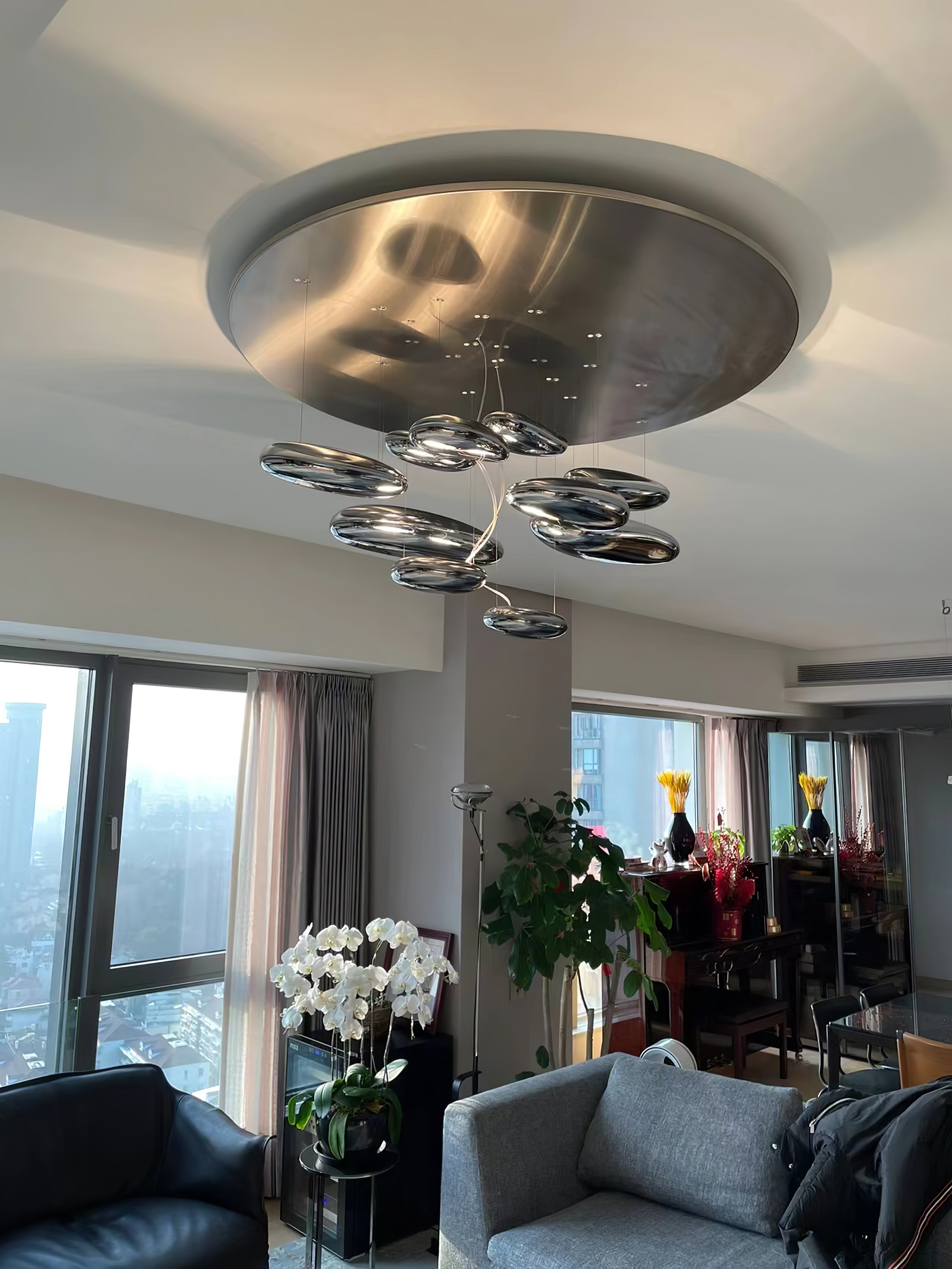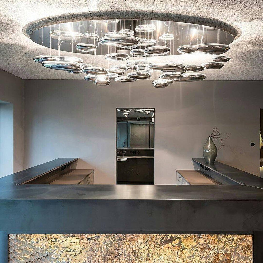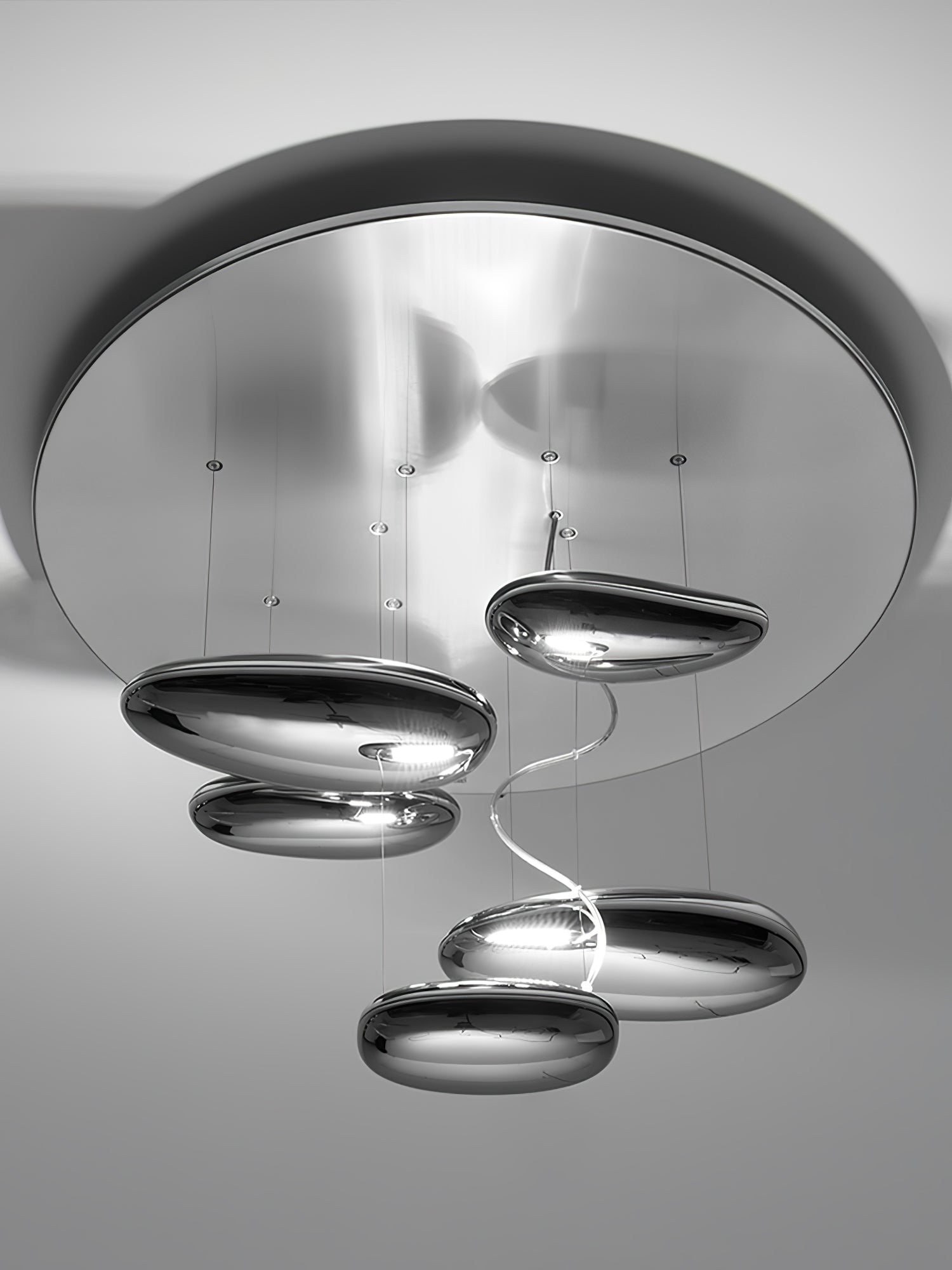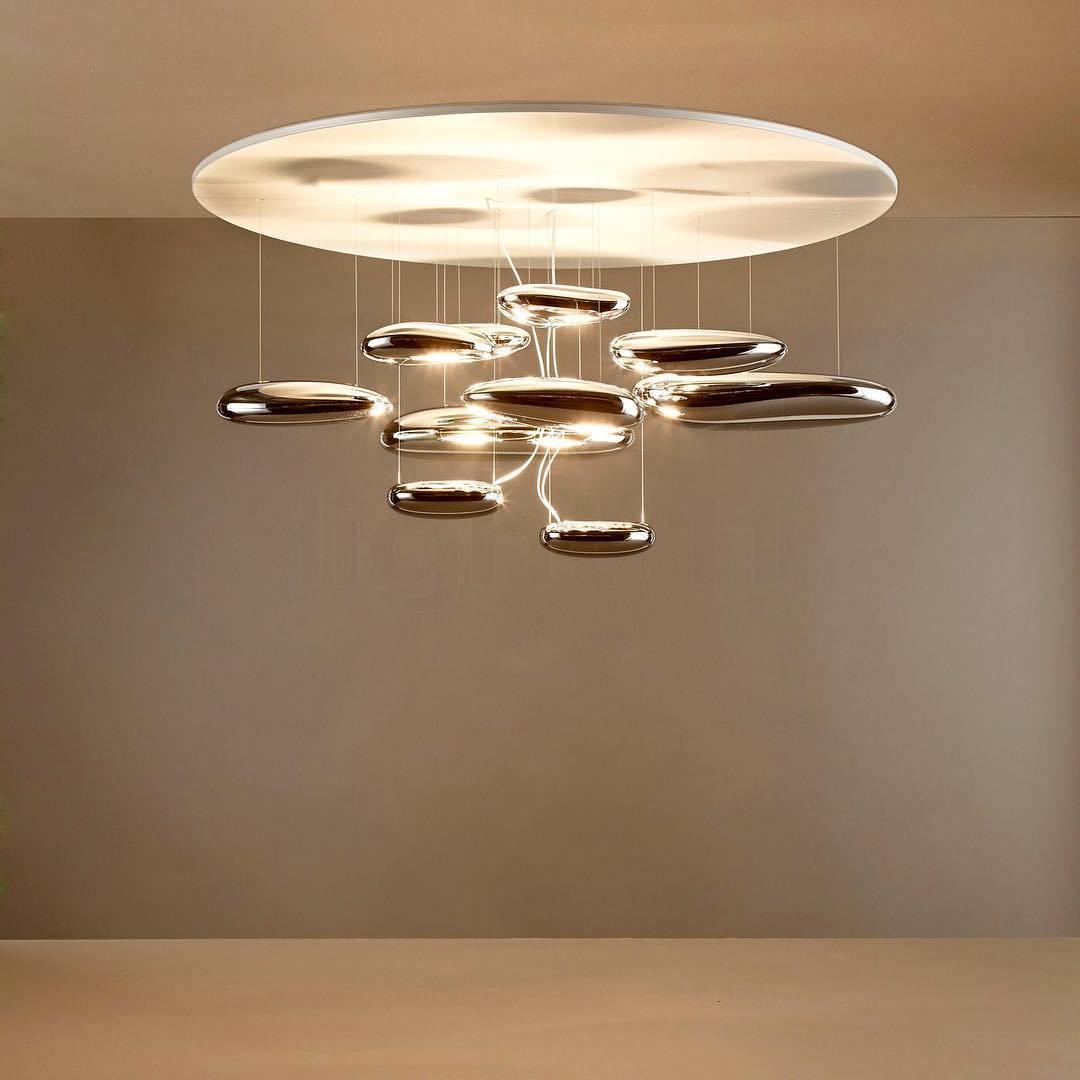 The lamp is available in suspended and ceiling versions. "A ceiling fixture that places floating assemblies of large pebbles beneath a simple modern aluminium disc. These in turn reflect each other, bouncing light between the biomorphic surfaces they teach and their surroundings .