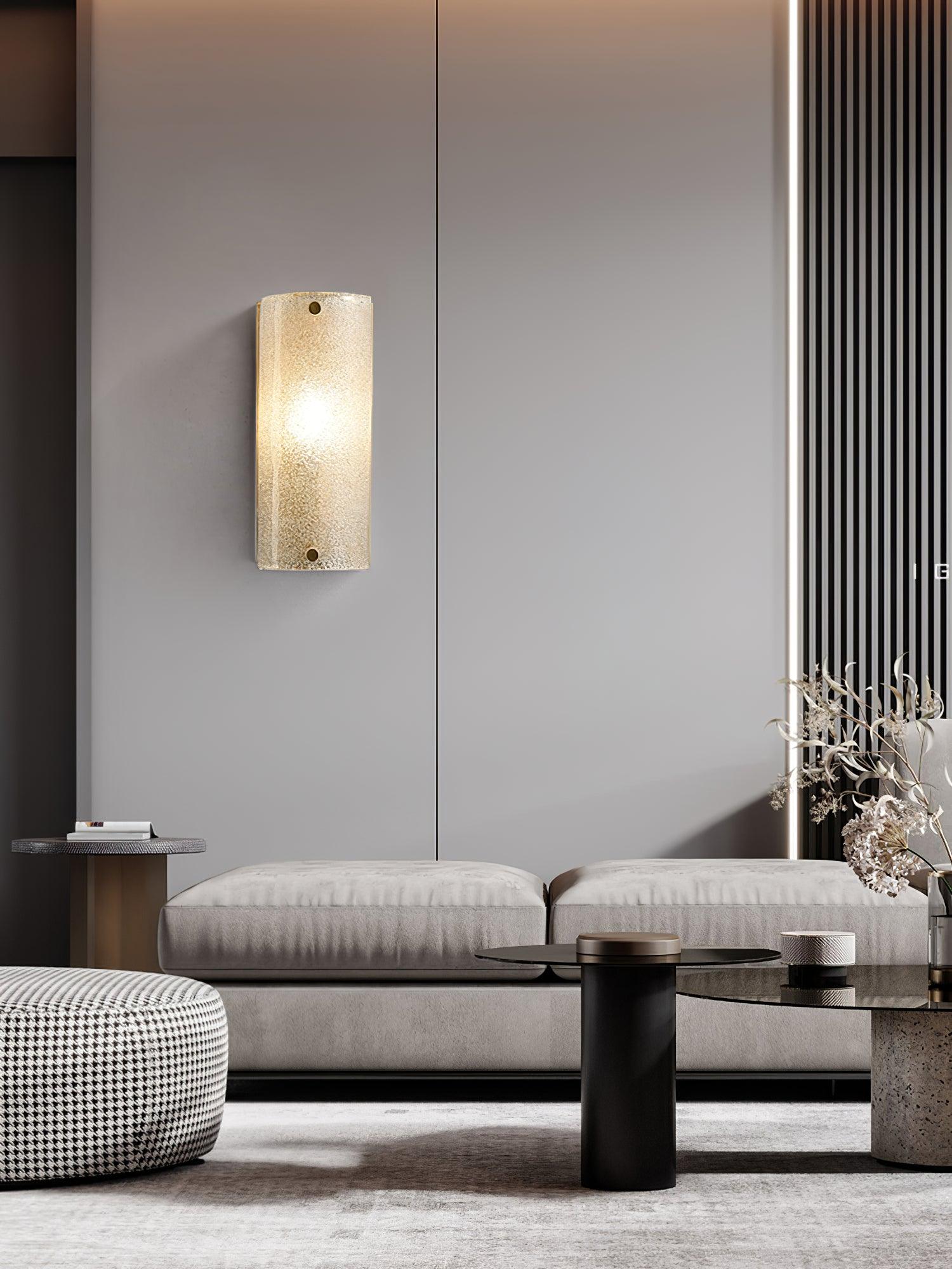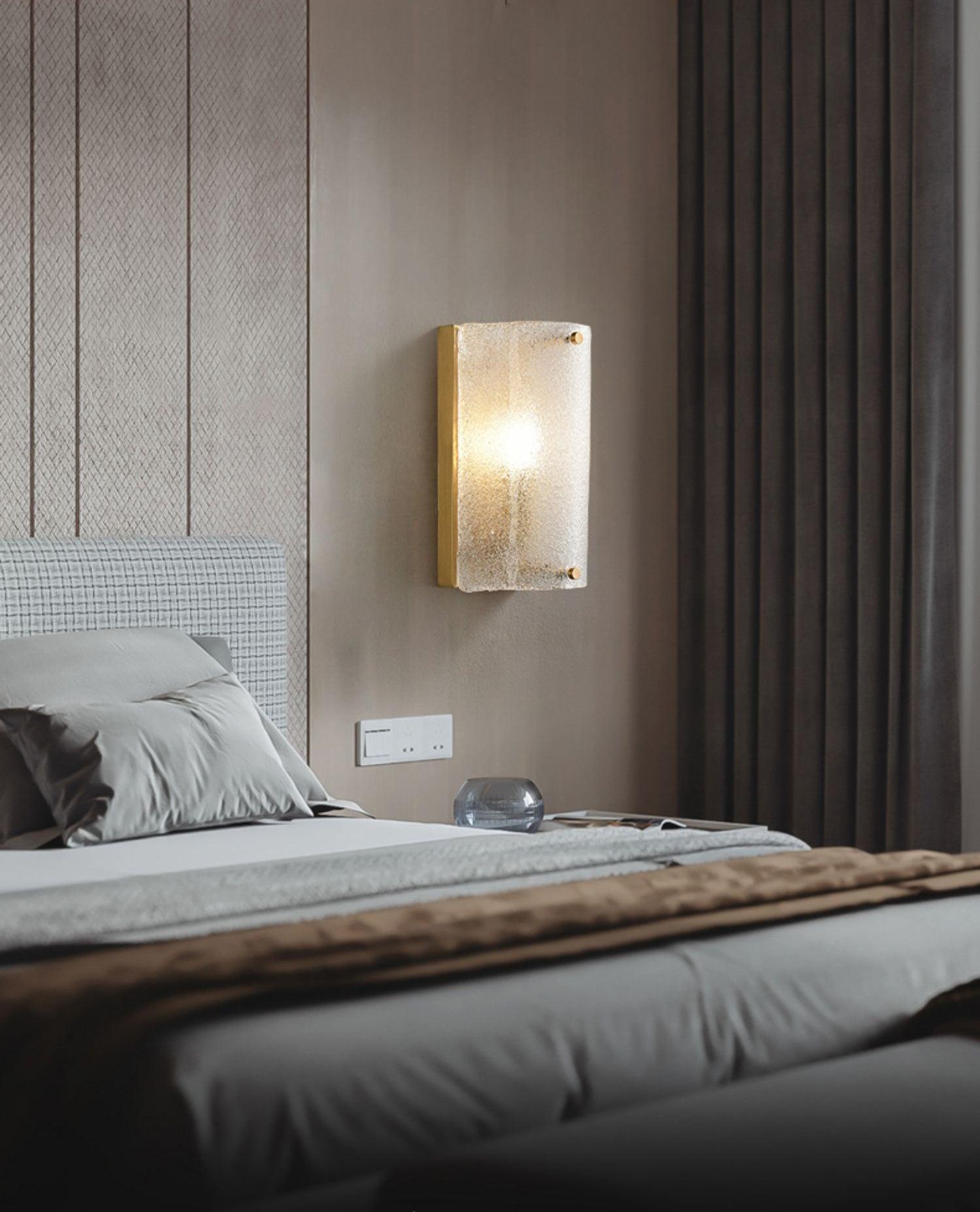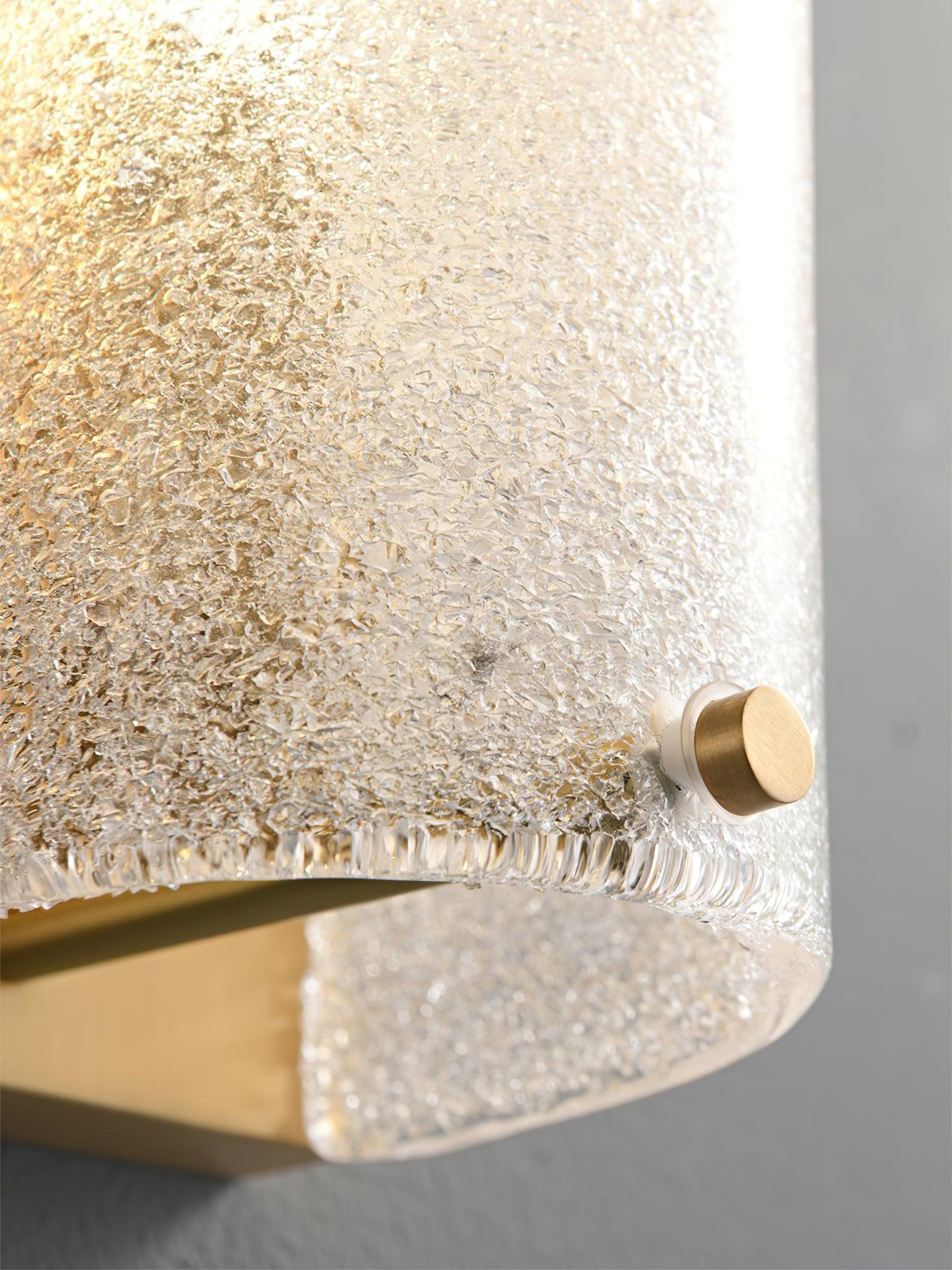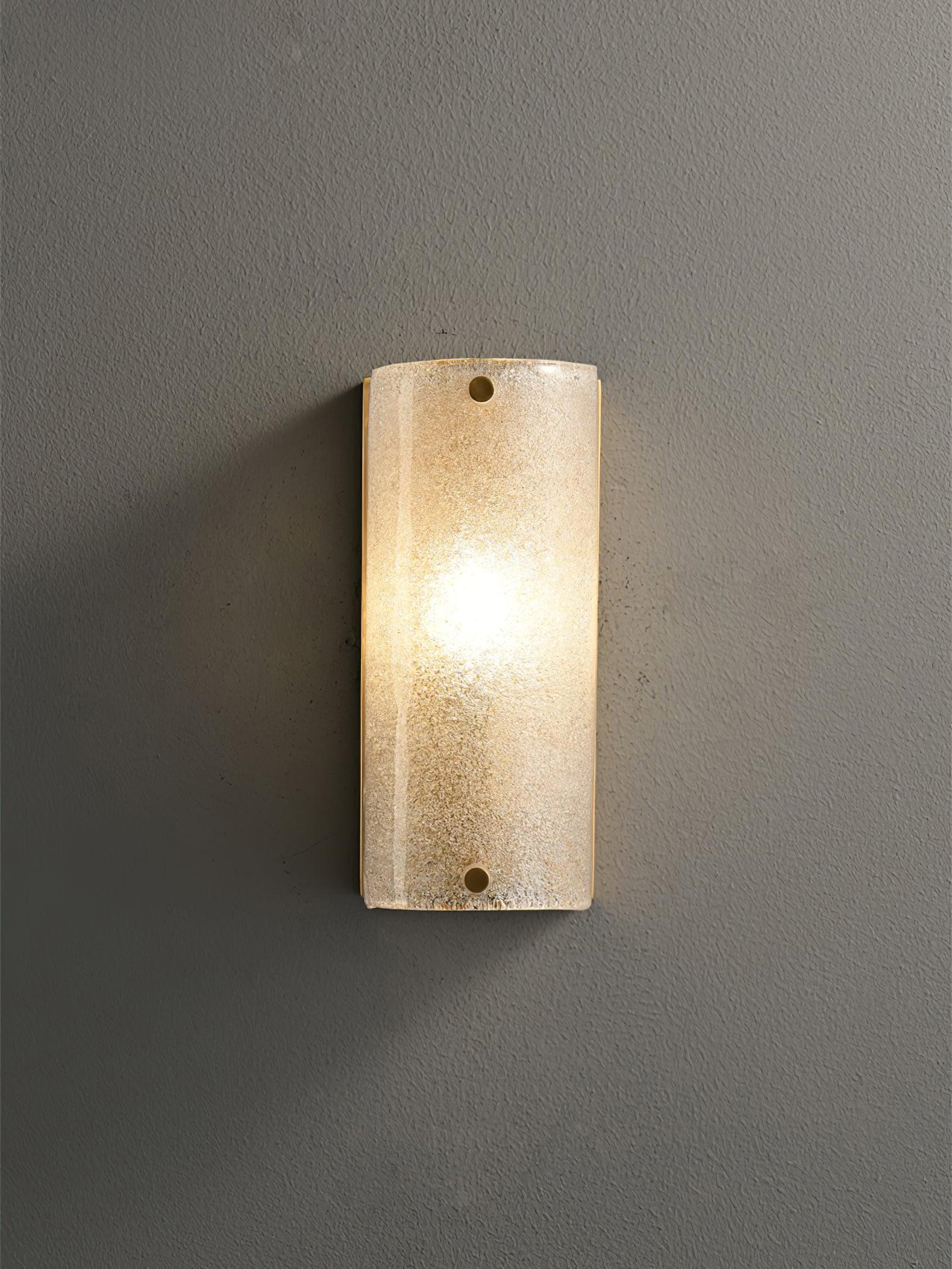 This opaque decorative glass treatment feels like melted ice against an antique brass back plate. They can be placed in any room in the house and hang vertically or horizontally.