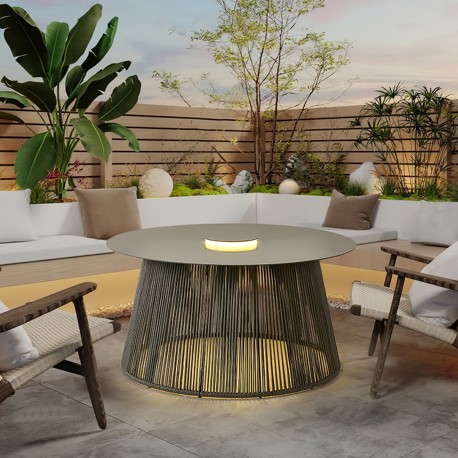 The Nit Outdoor Portable Solar Floor Lamp features a sleek design with a circular surface and rope base, exuding a modern and lightweight aesthetic. Its integrated LED lights emit soft but subtle brightness, perfect for outdoor gatherings or camping activities.