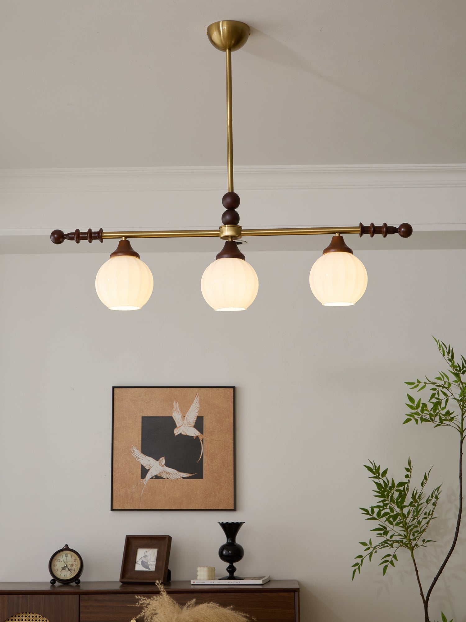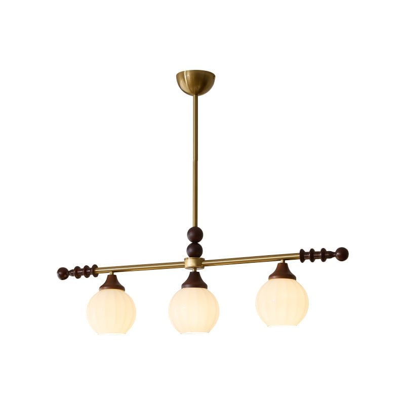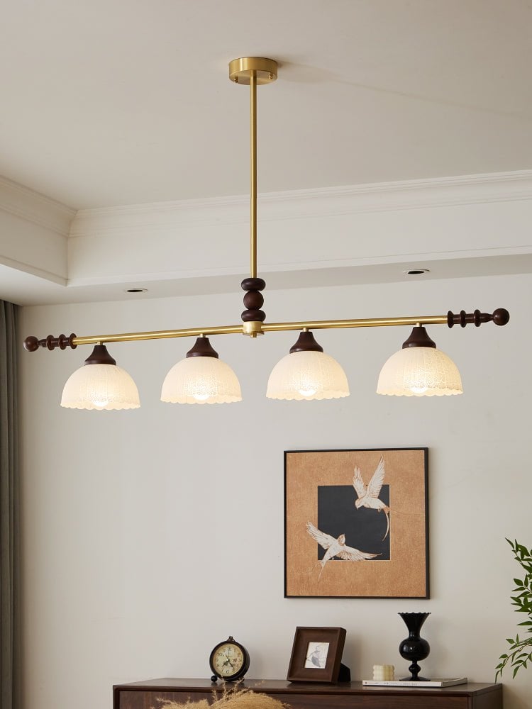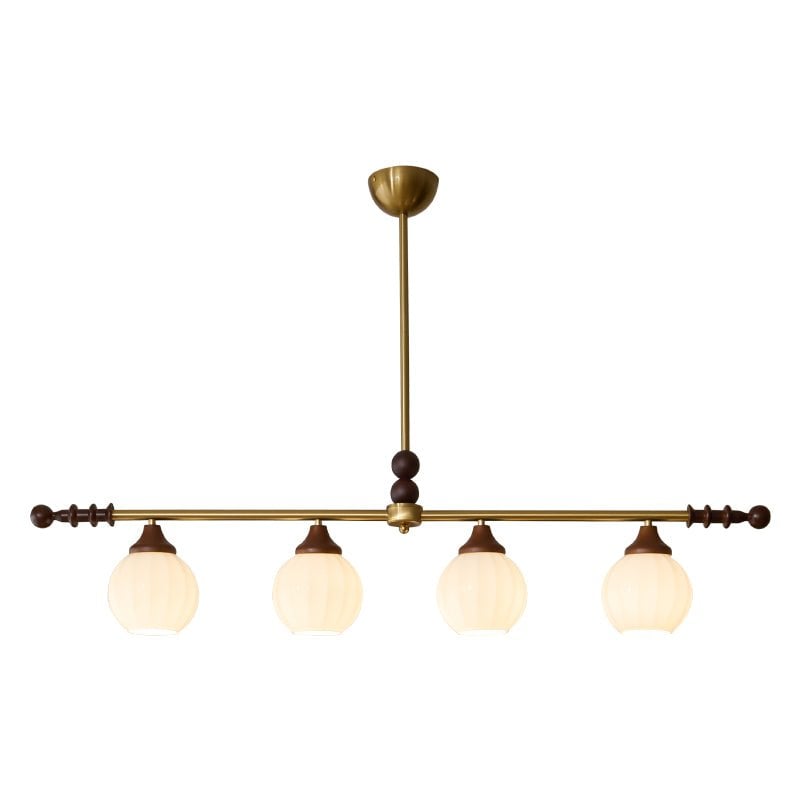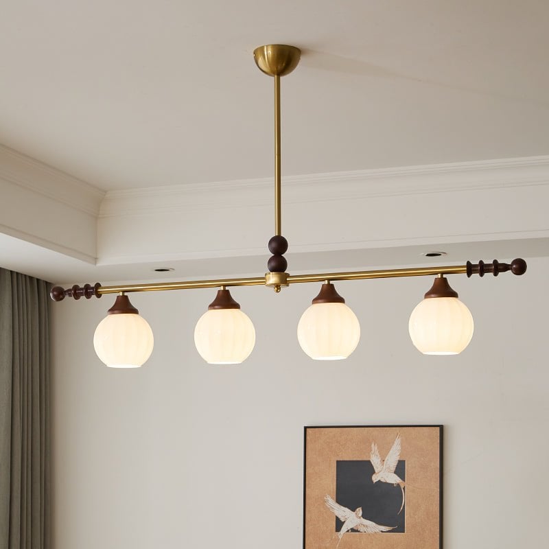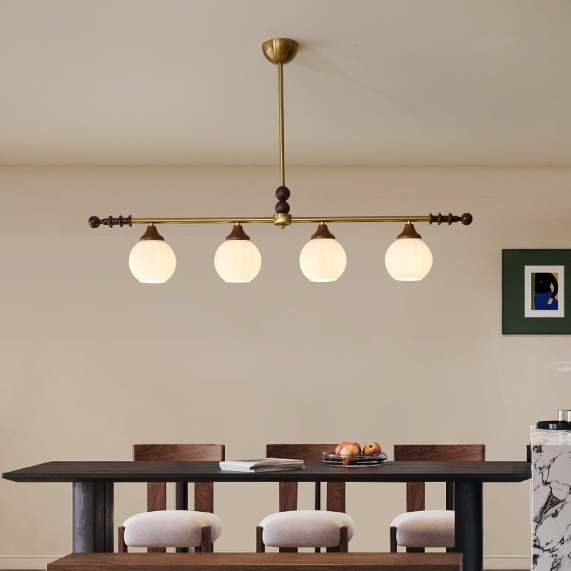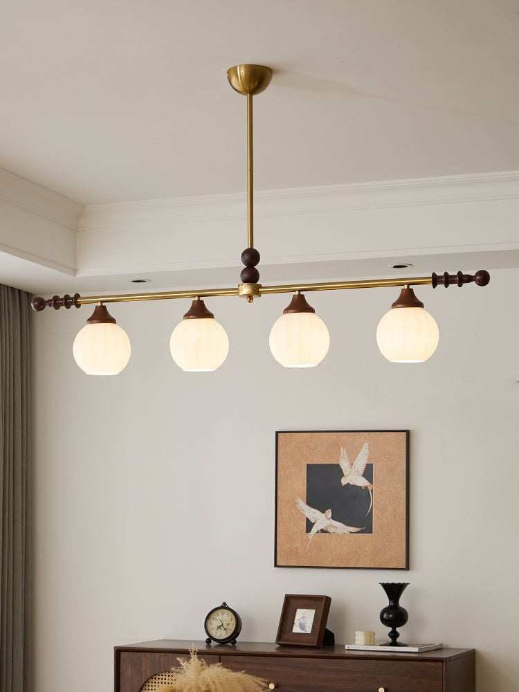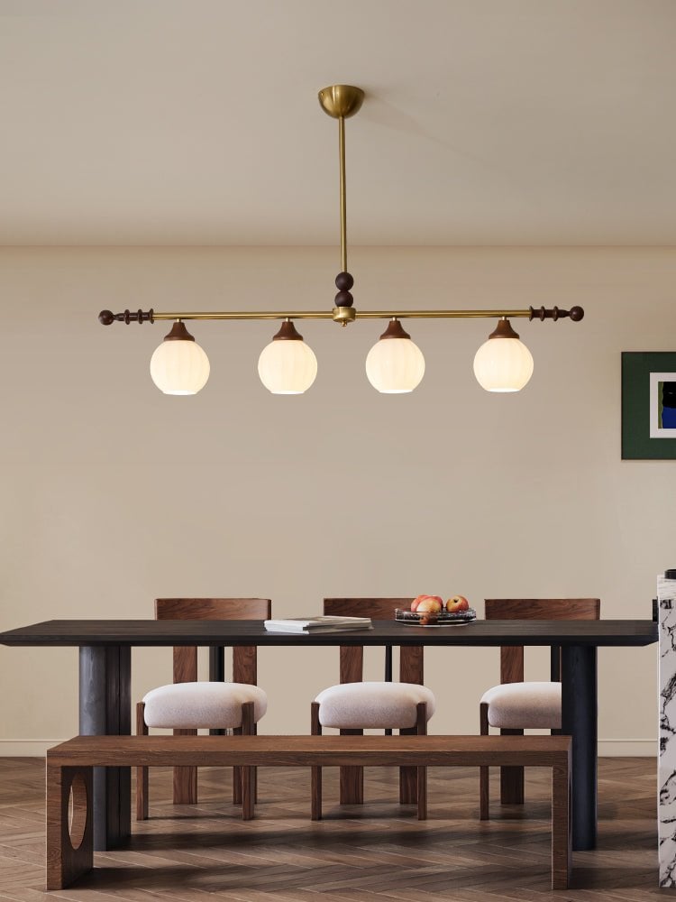 A sophisticated fusion of iron, glass, and wood, this Lighting pendant exudes elegance and harmony. With its linear balance and soft luminous globes, it creates an atmosphere of serene refinement, perfect for modern and classic interiors alike.