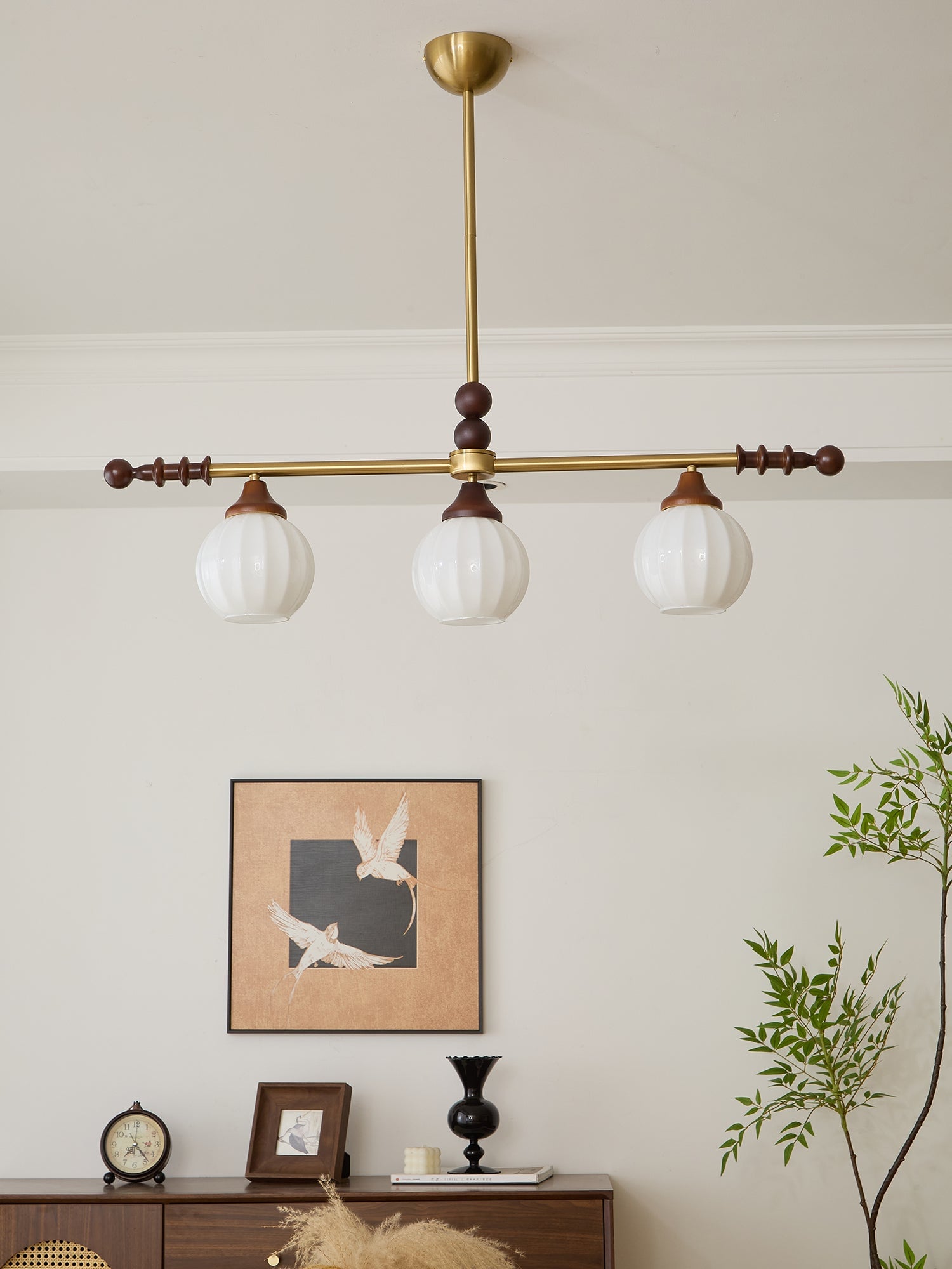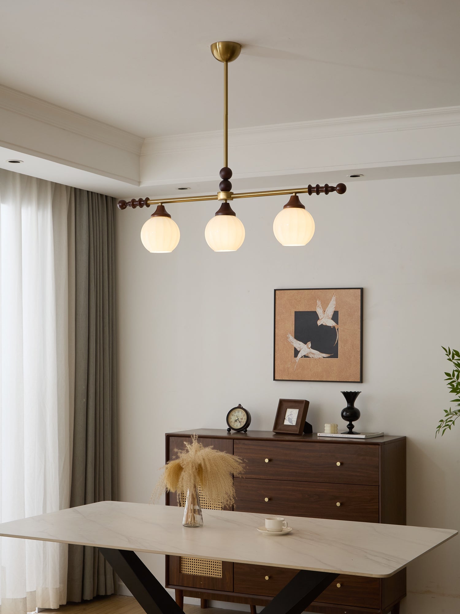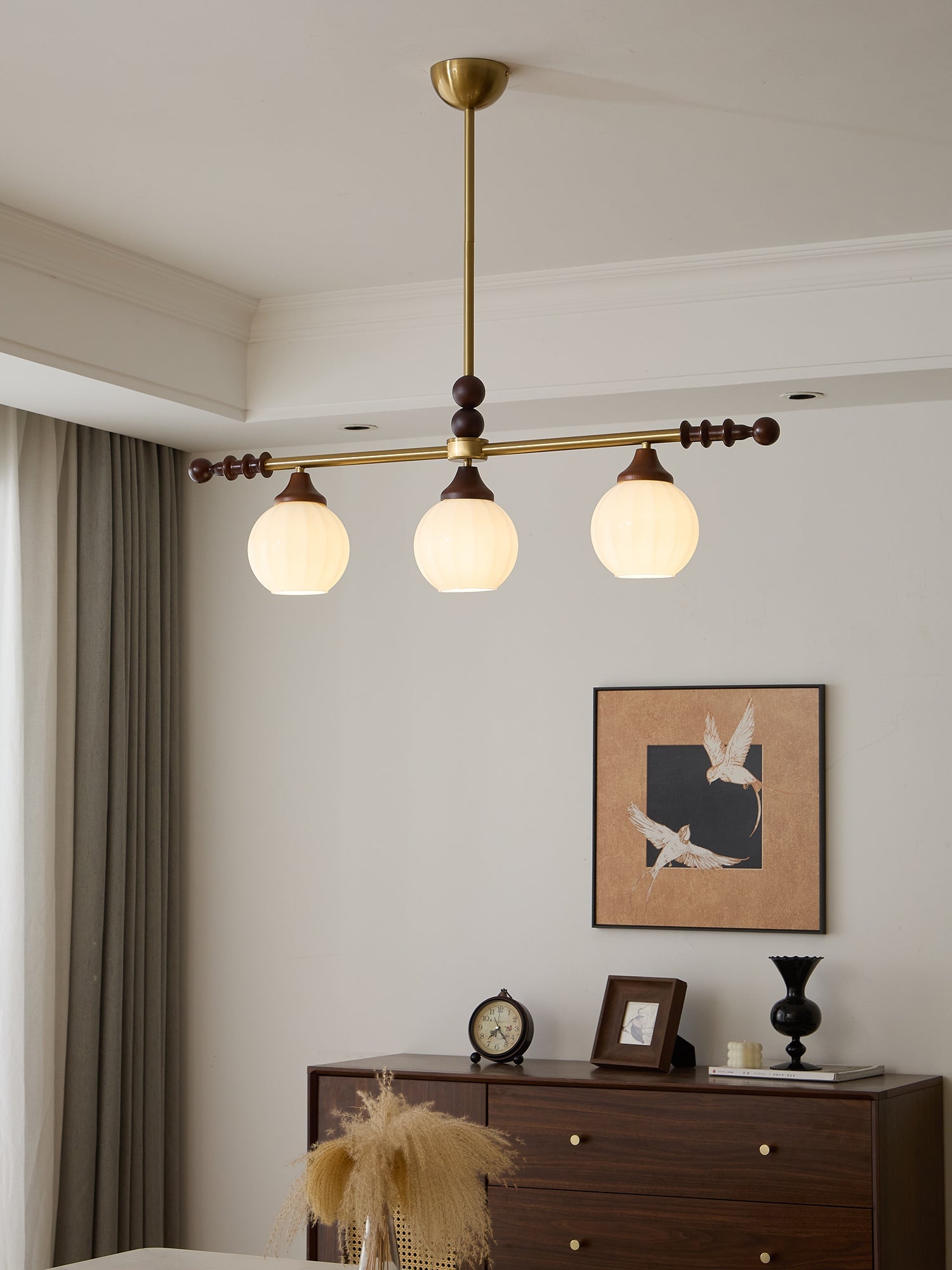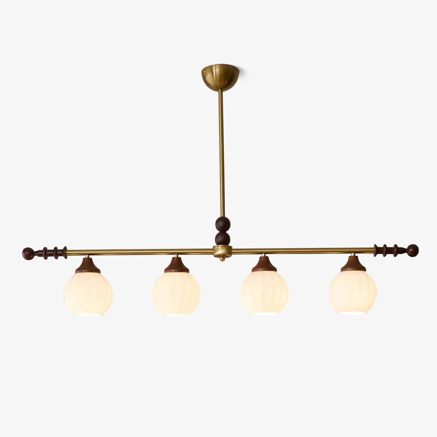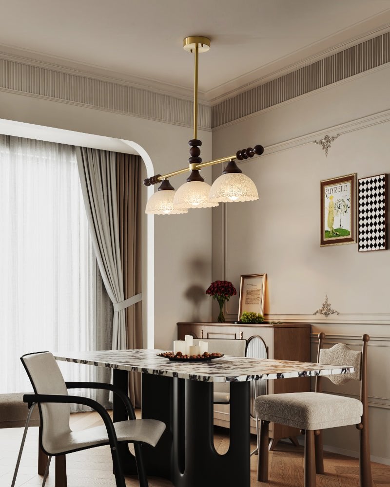 A sophisticated fusion of iron, glass, and wood, this Lighting pendant exudes elegance and harmony. With its linear balance and soft luminous globes, it creates an atmosphere of serene refinement, perfect for modern and classic interiors alike.