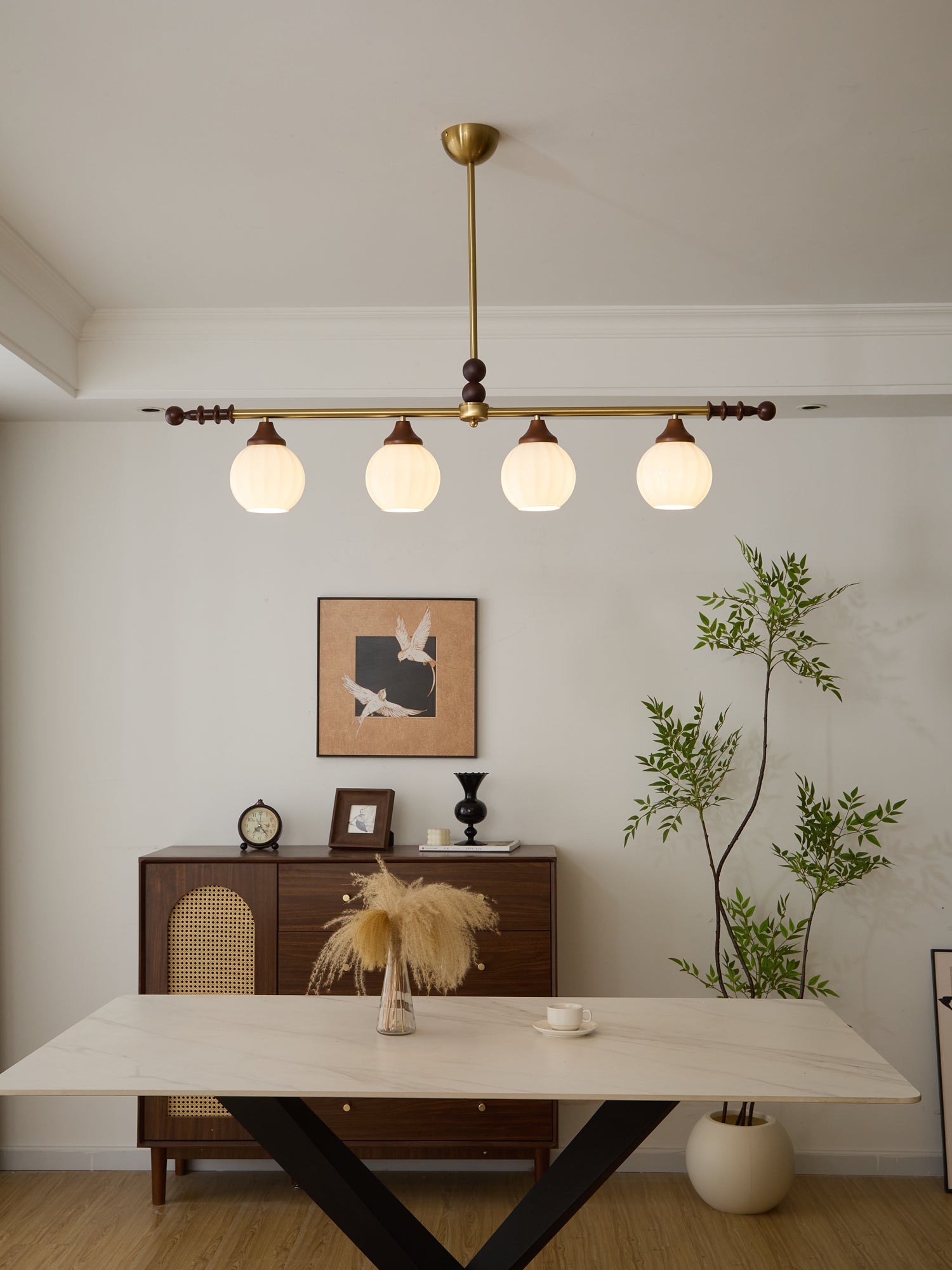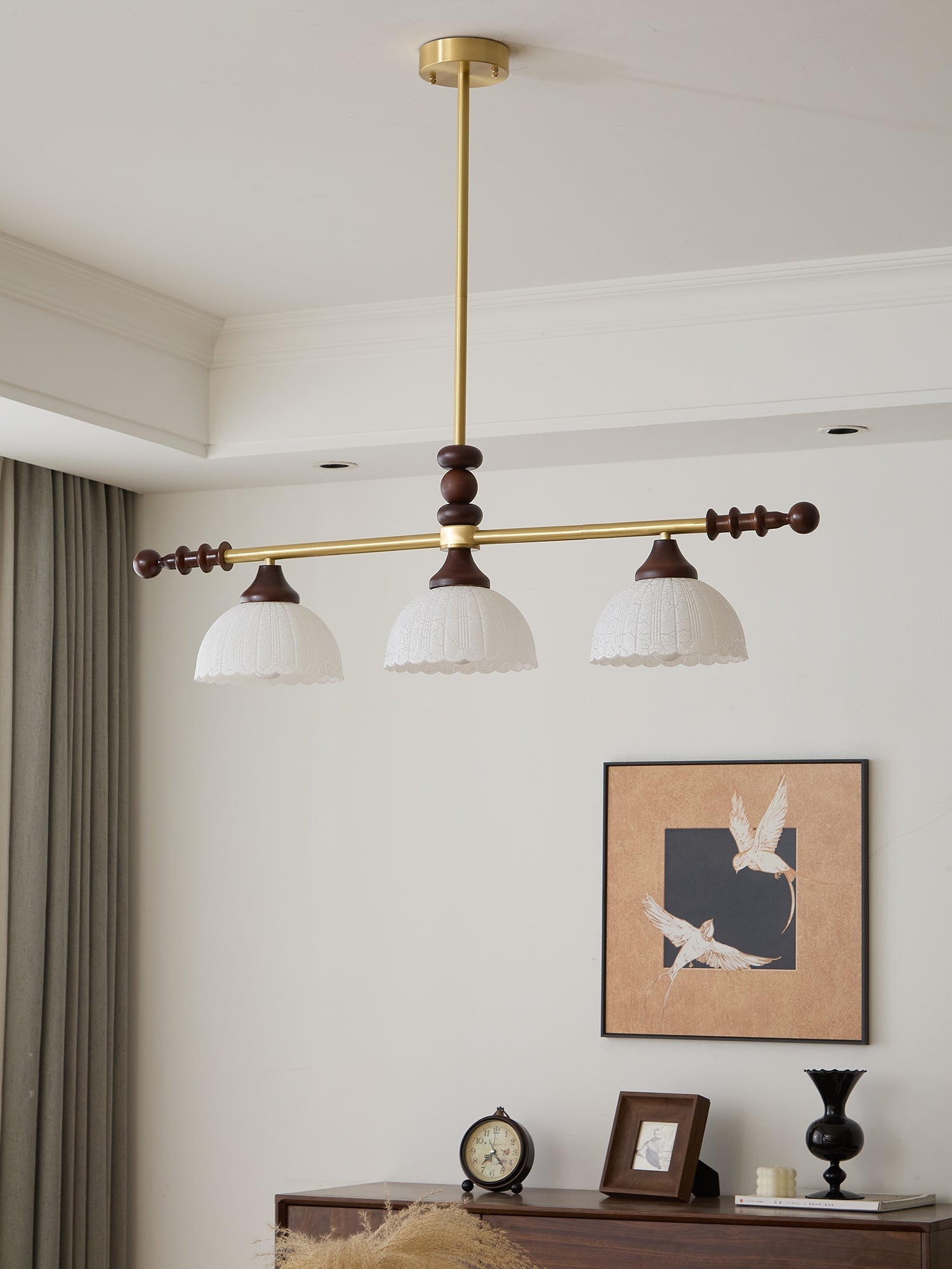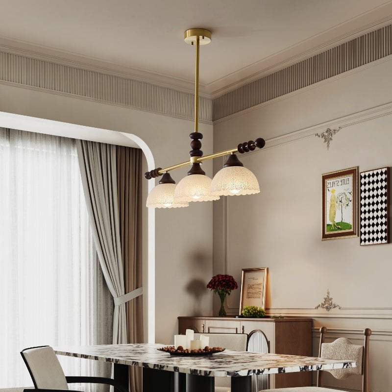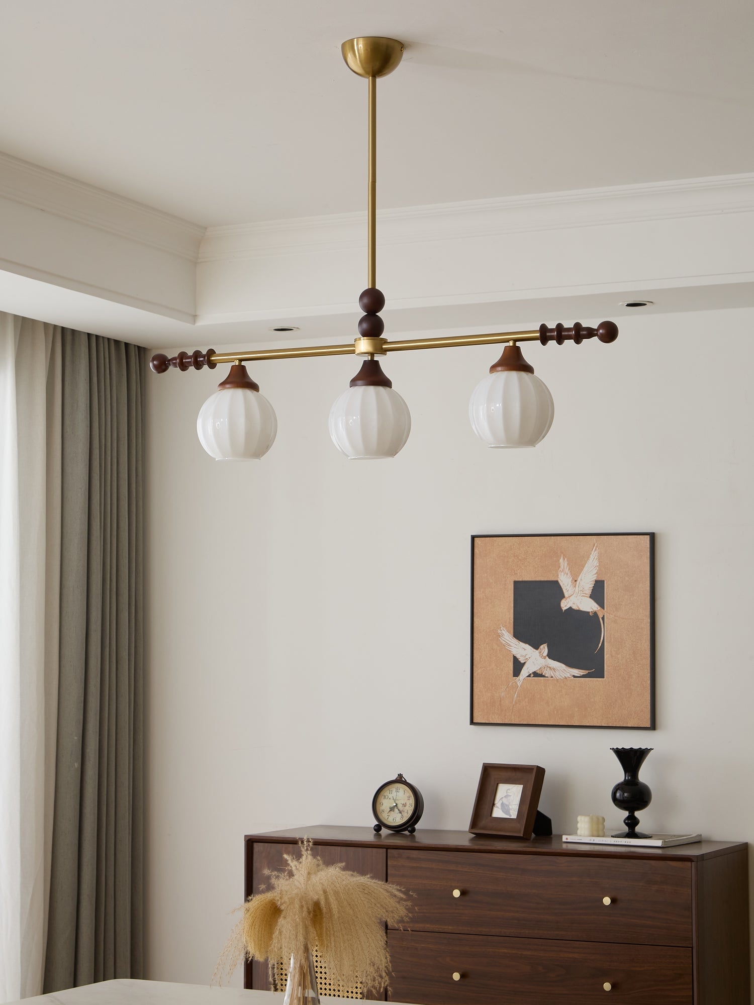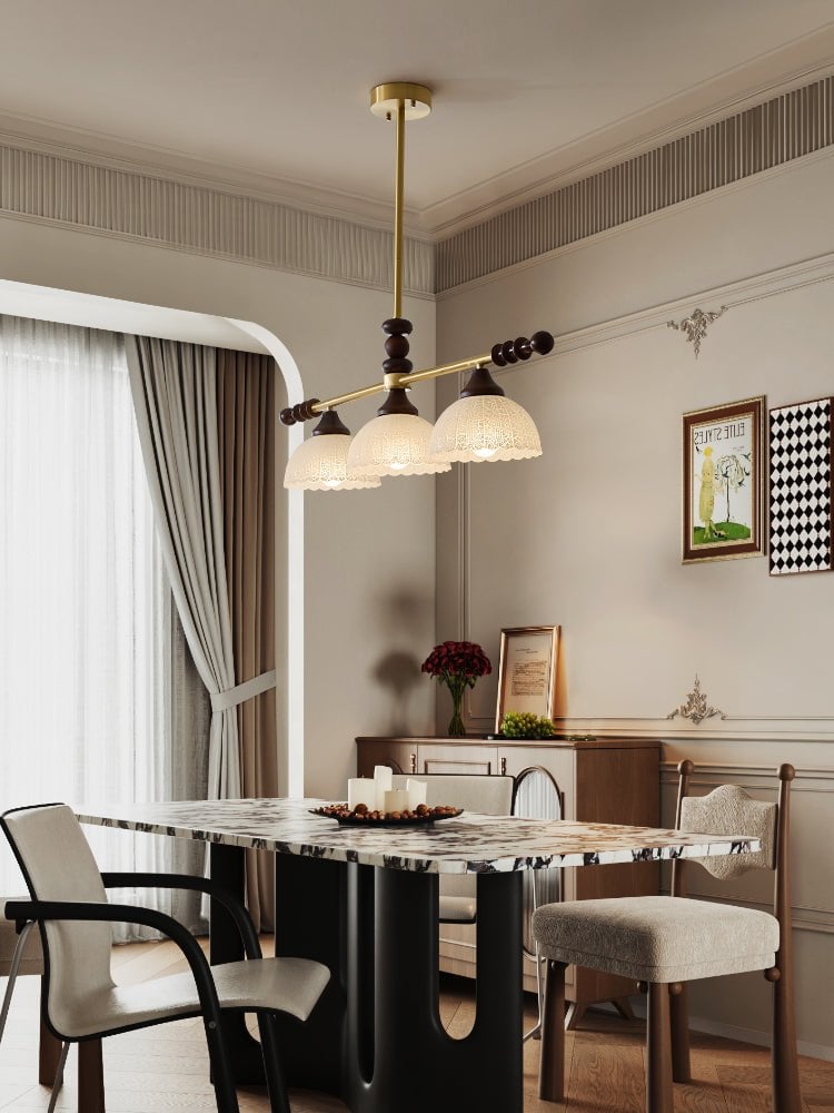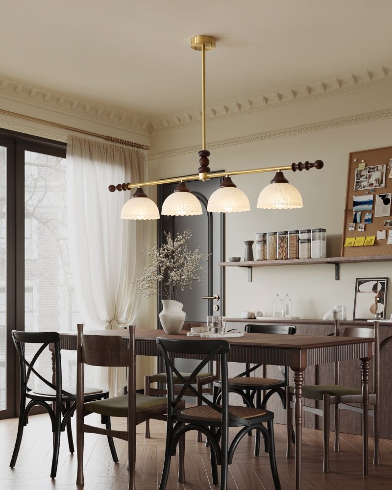 A sophisticated fusion of iron, glass, and wood, this Lighting pendant exudes elegance and harmony. With its linear balance and soft luminous globes, it creates an atmosphere of serene refinement, perfect for modern and classic interiors alike.
