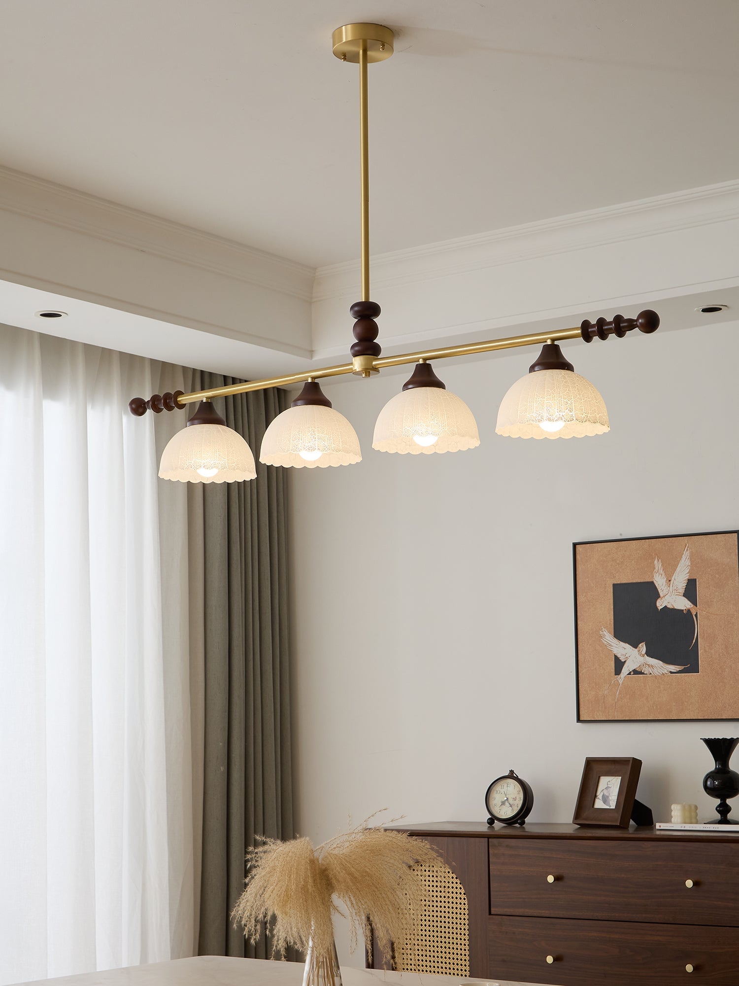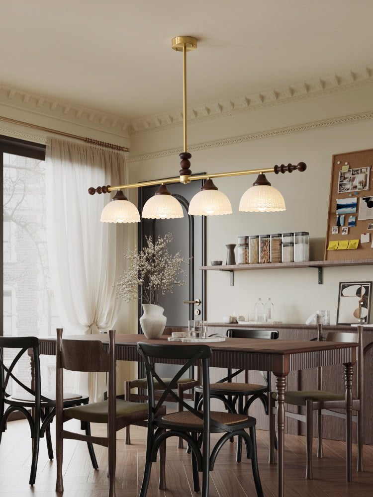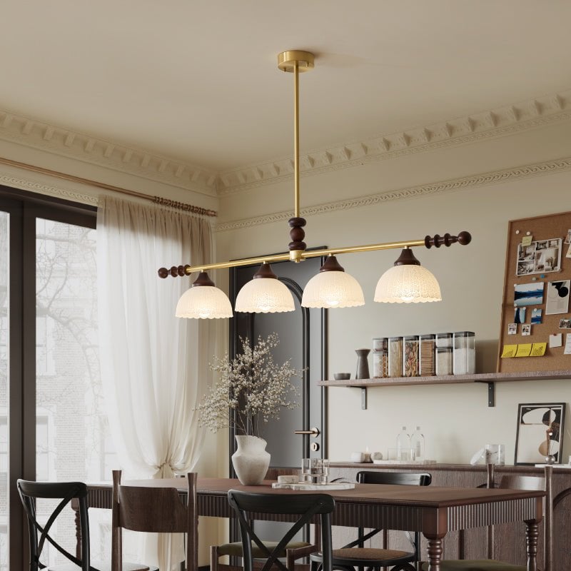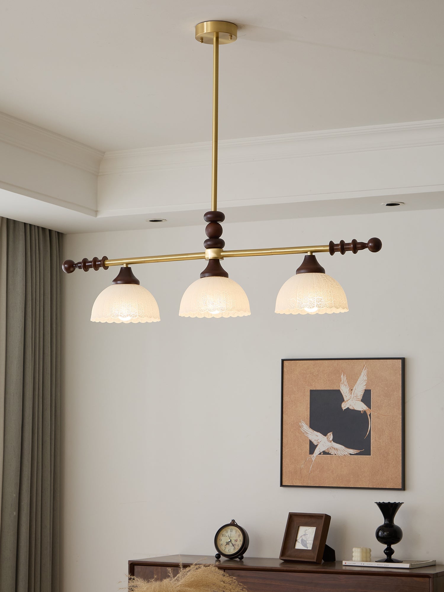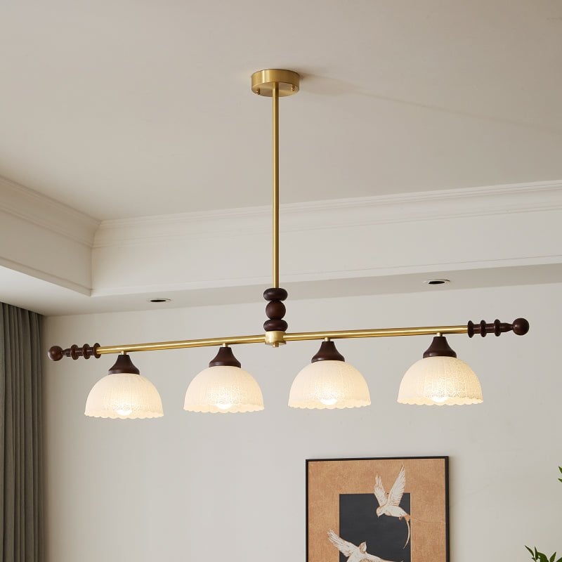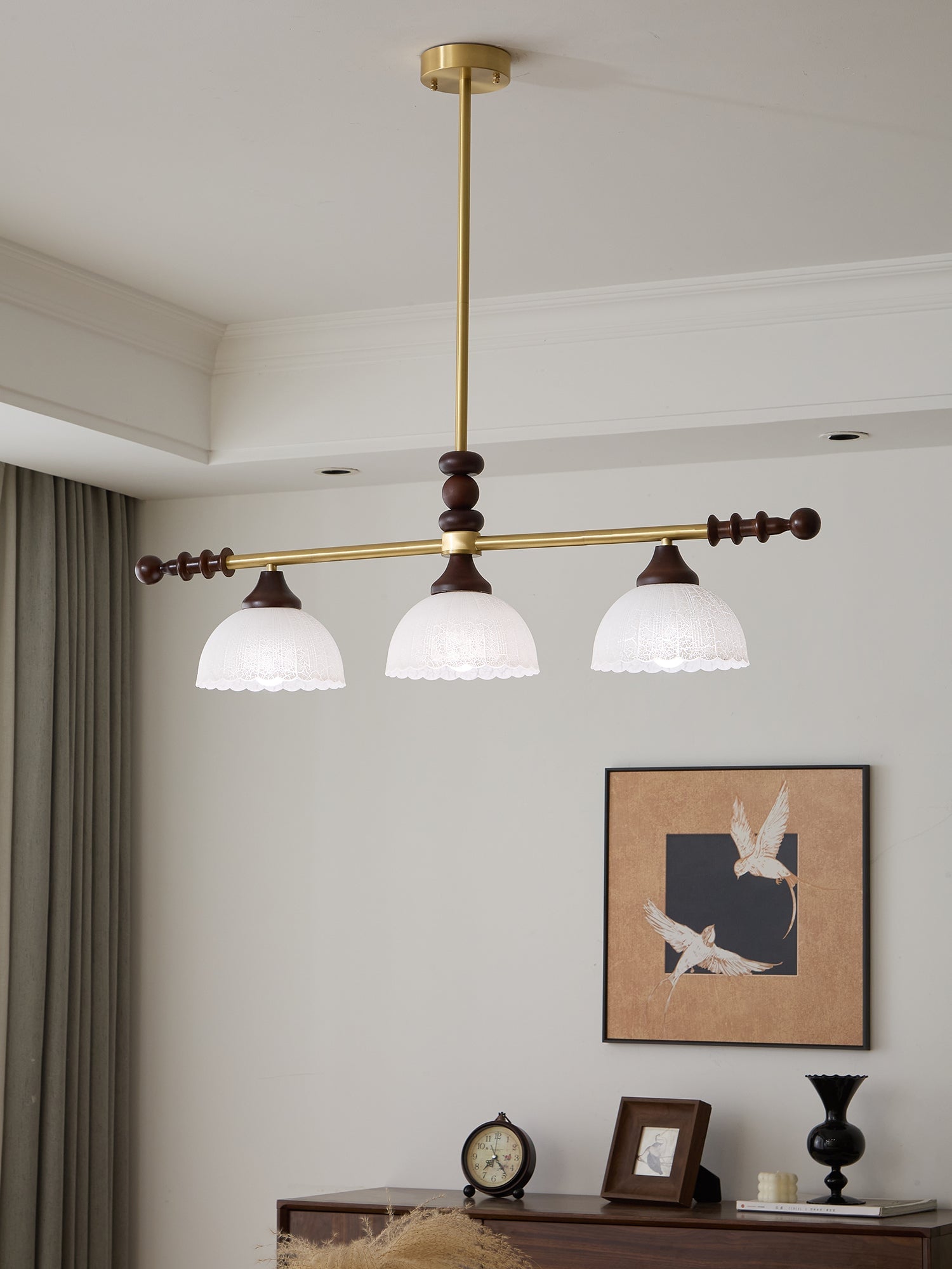 A sophisticated fusion of iron, glass, and wood, this Lighting pendant exudes elegance and harmony. With its linear balance and soft luminous globes, it creates an atmosphere of serene refinement, perfect for modern and classic interiors alike.