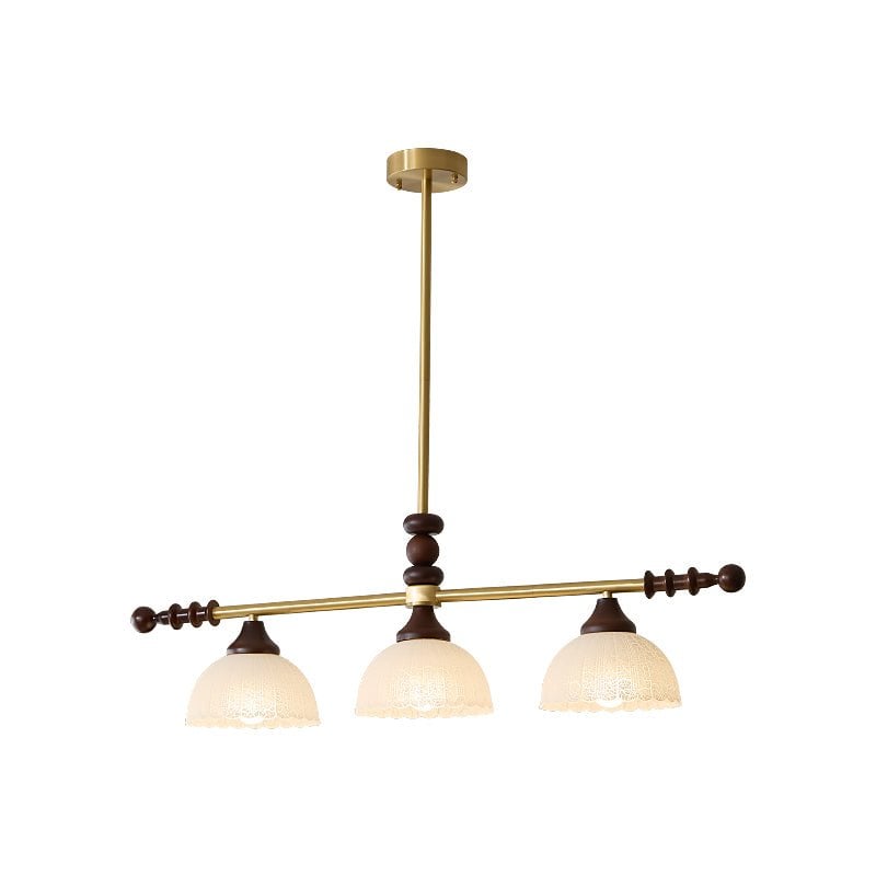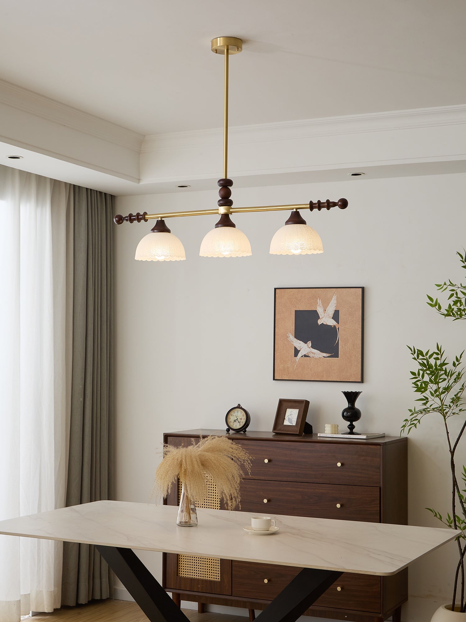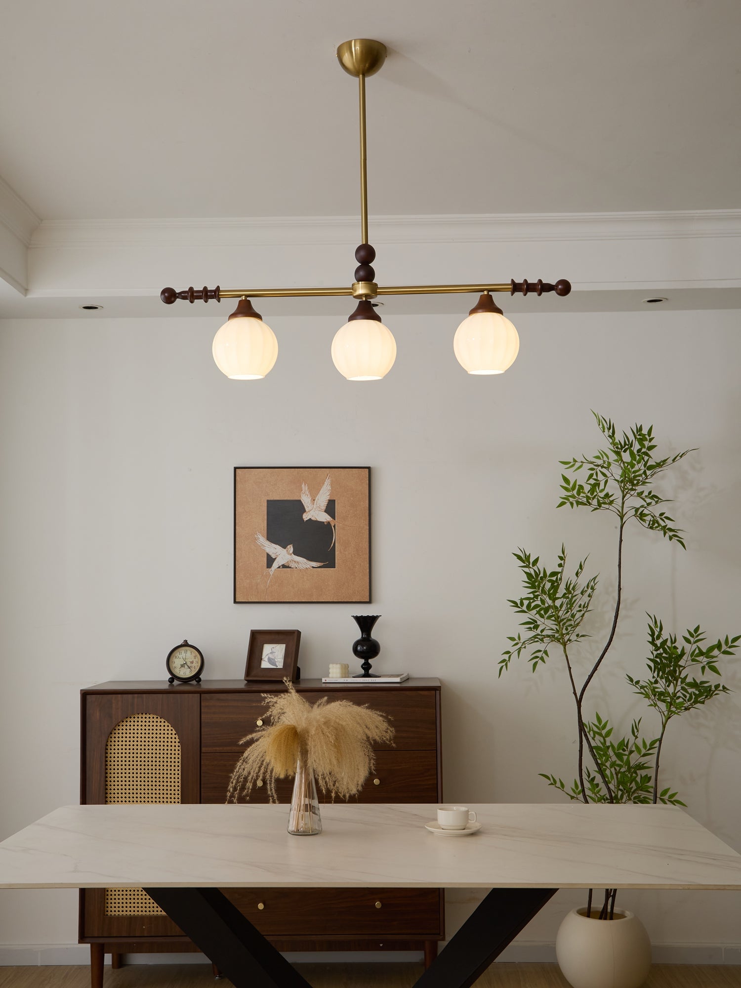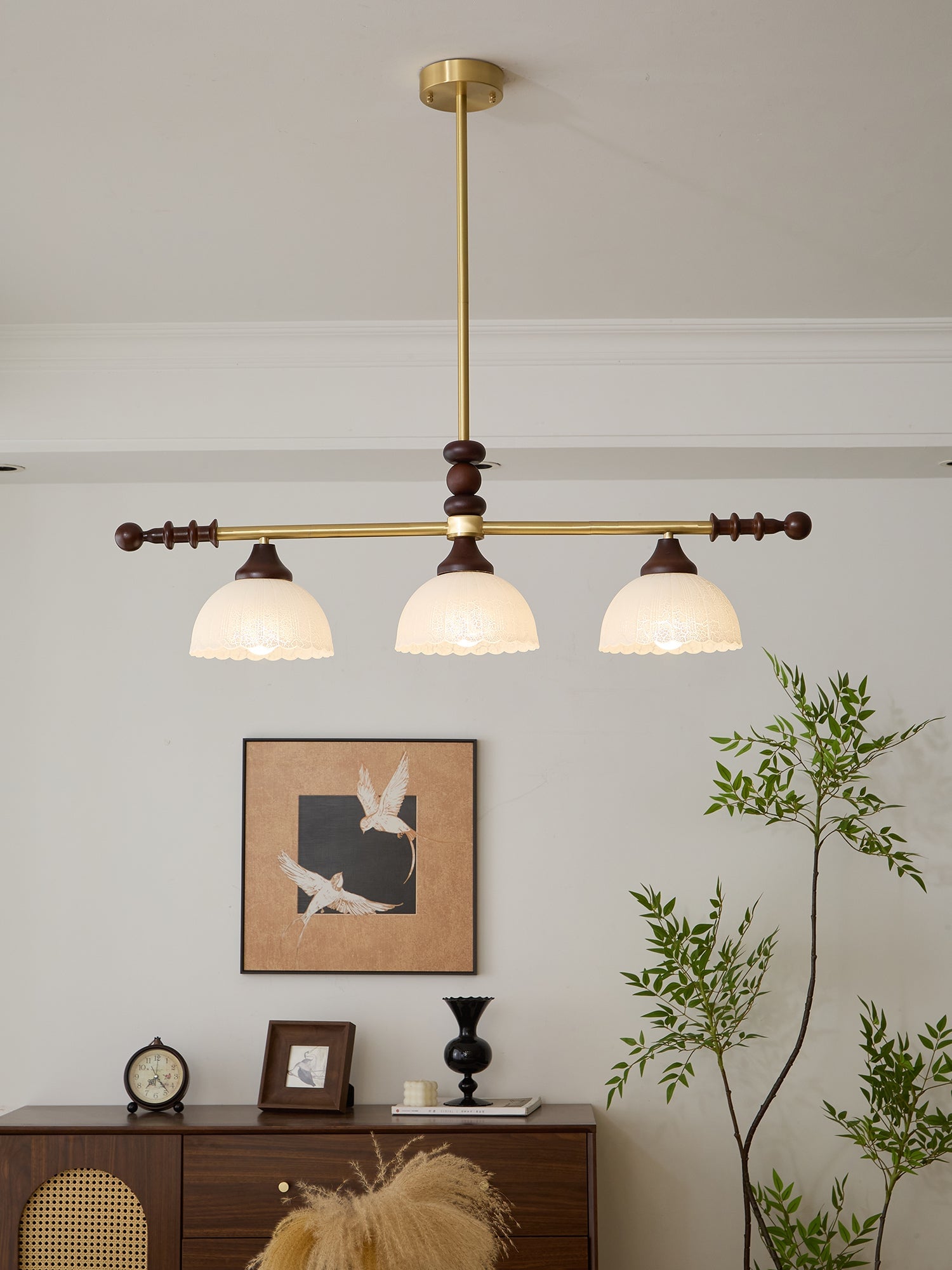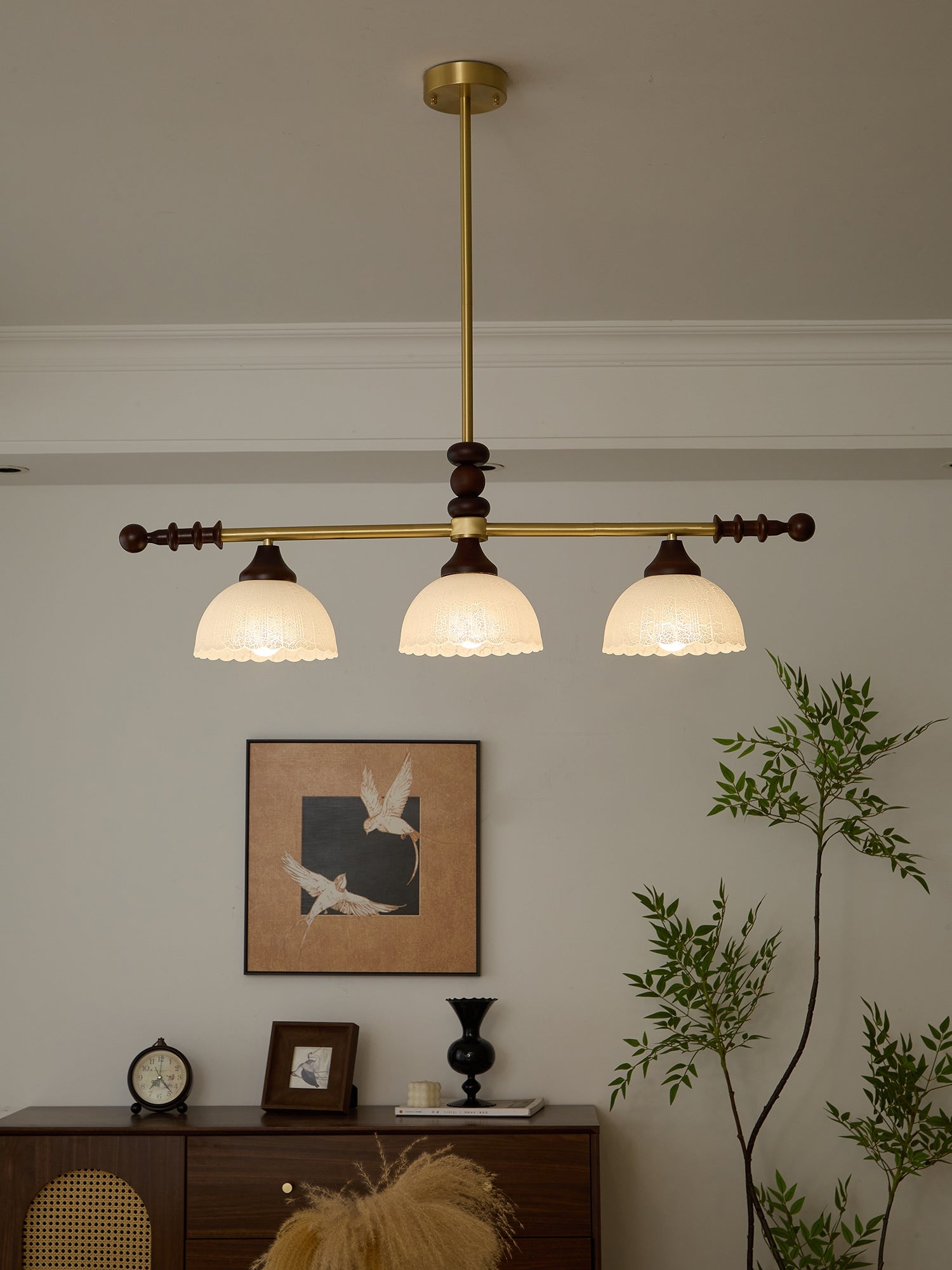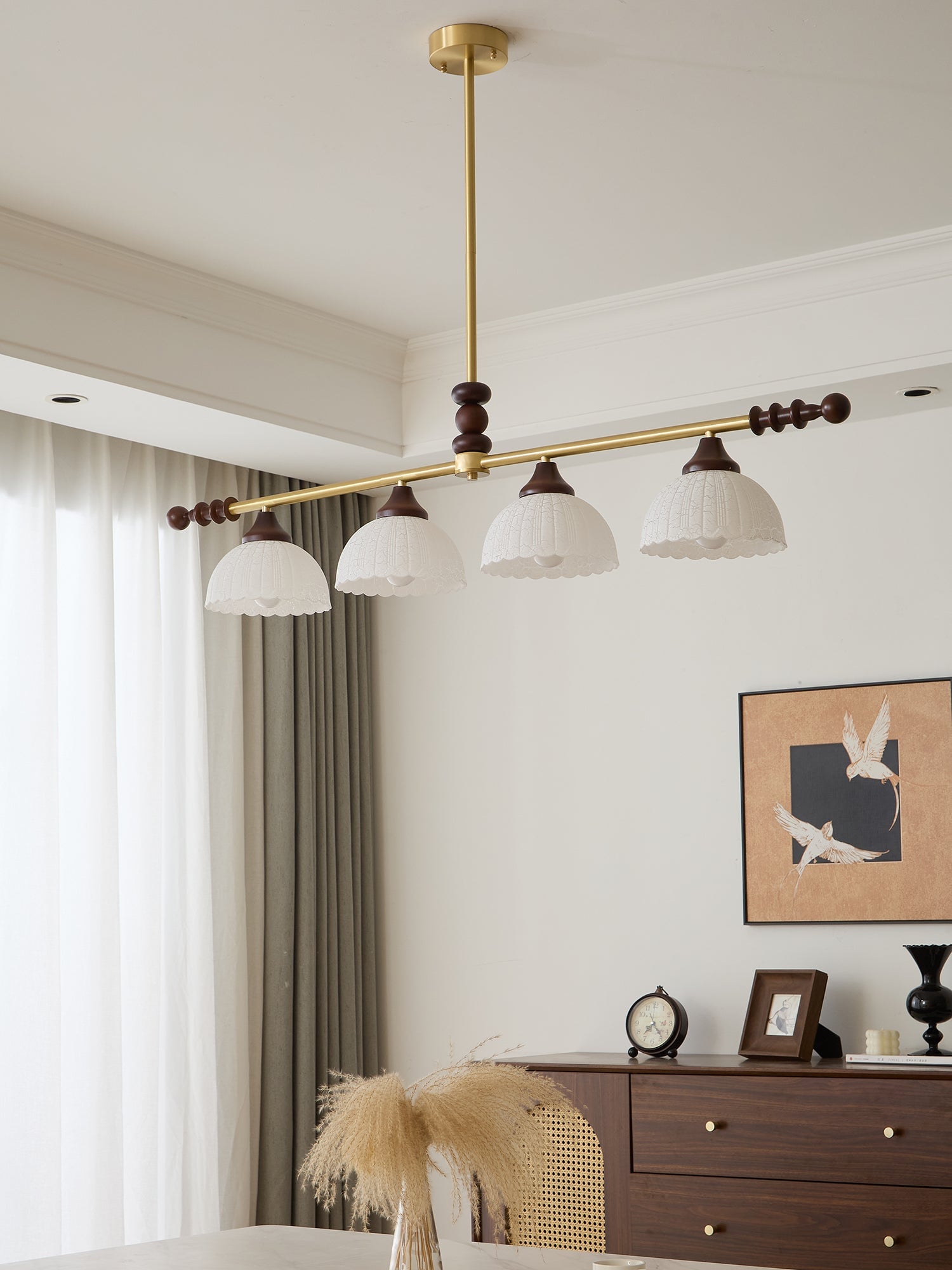 A sophisticated fusion of iron, glass, and wood, this Lighting pendant exudes elegance and harmony. With its linear balance and soft luminous globes, it creates an atmosphere of serene refinement, perfect for modern and classic interiors alike.