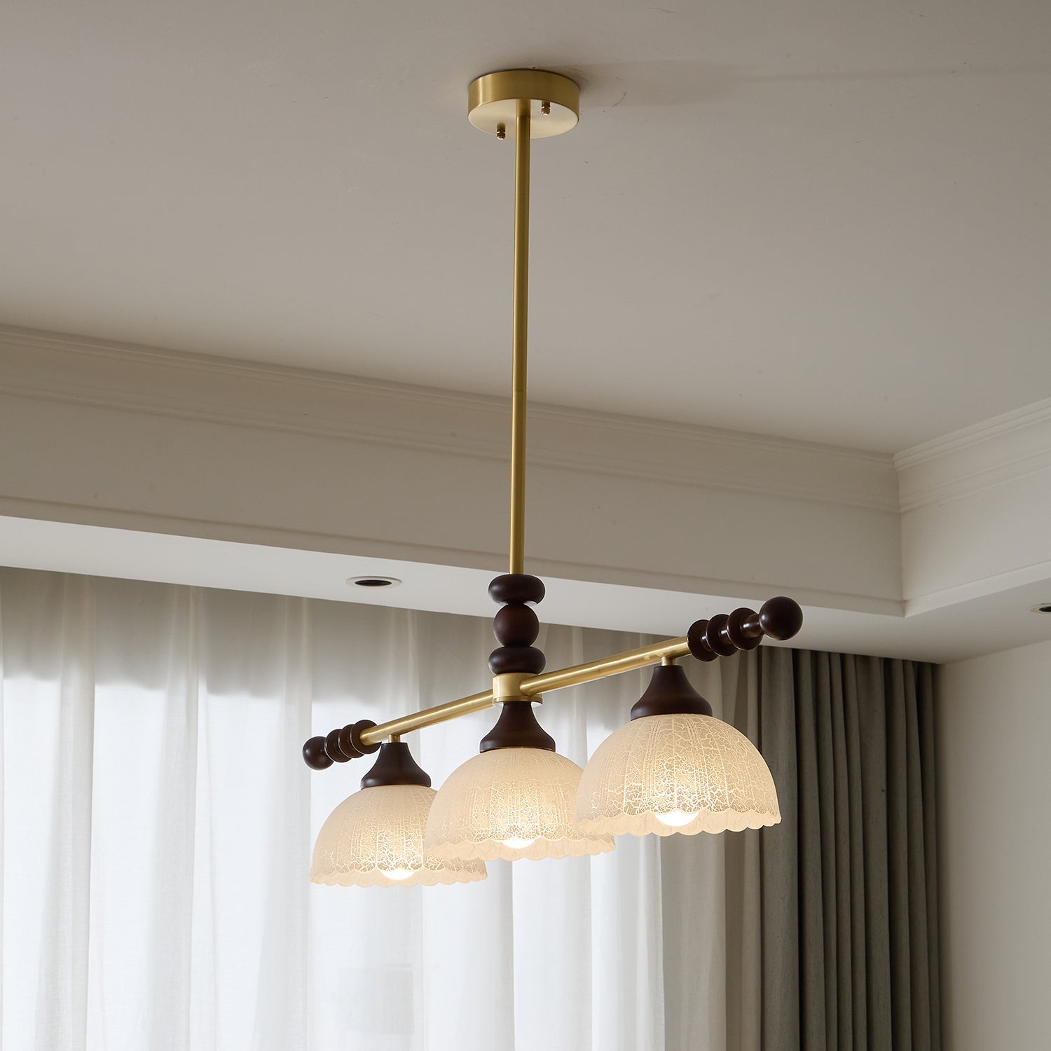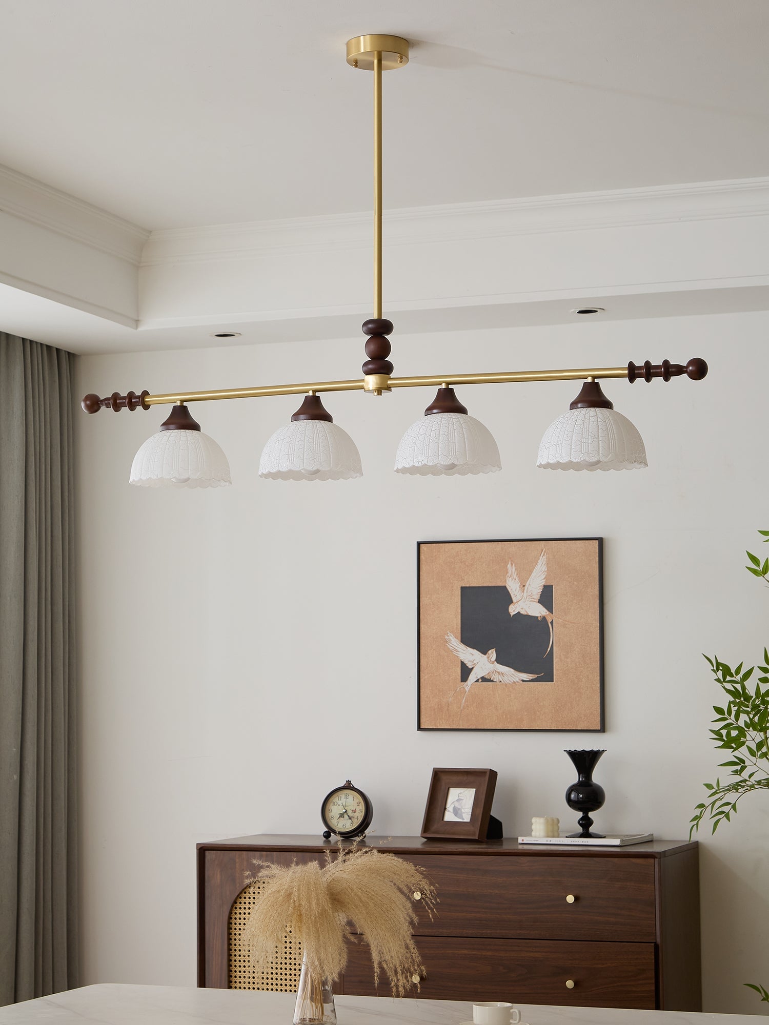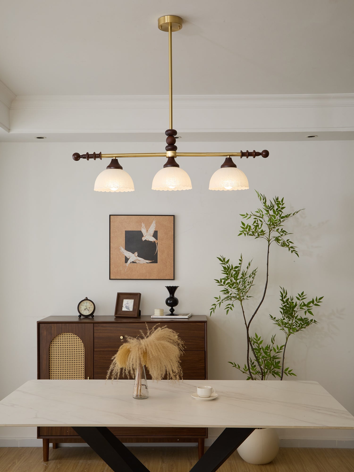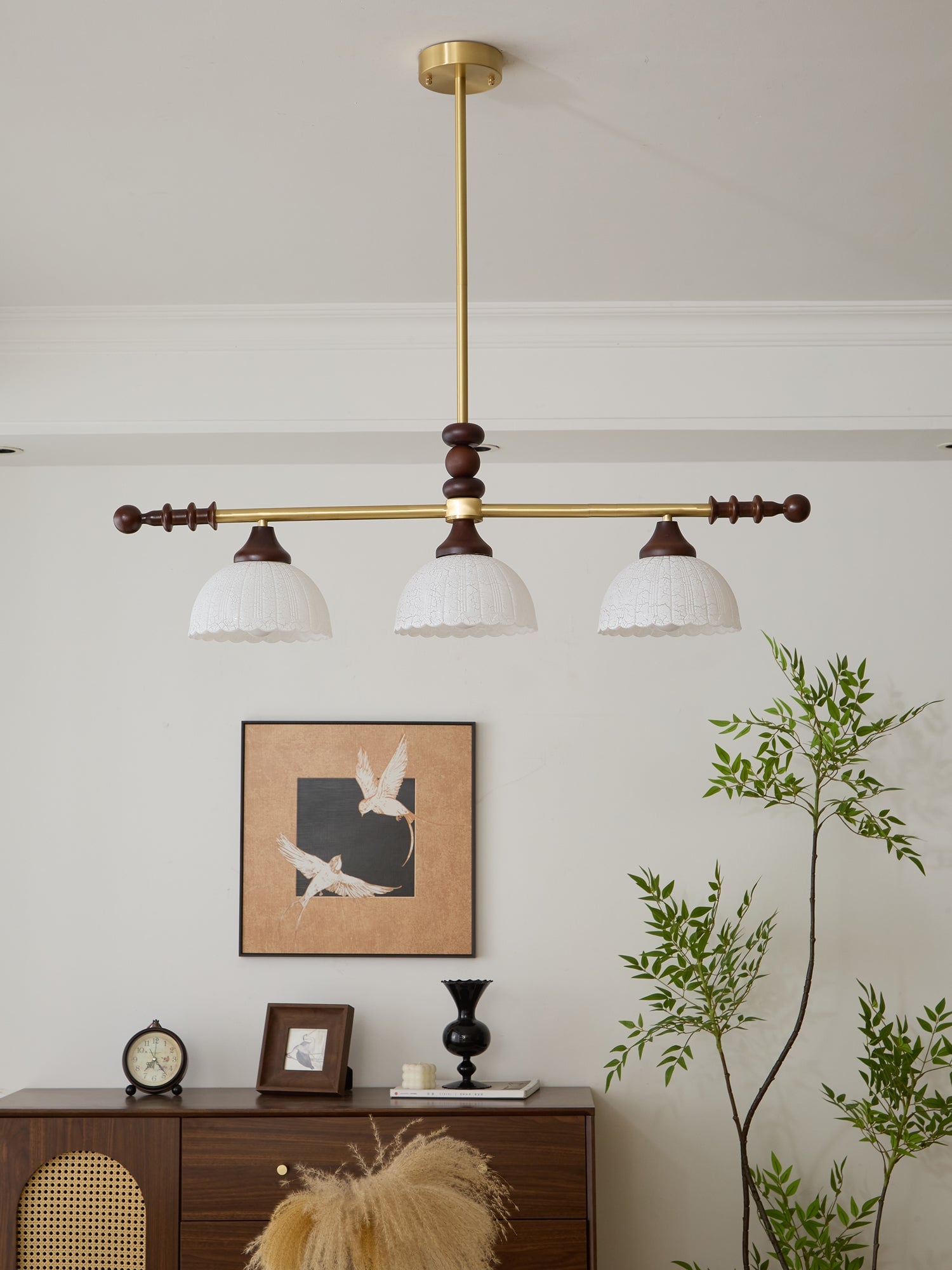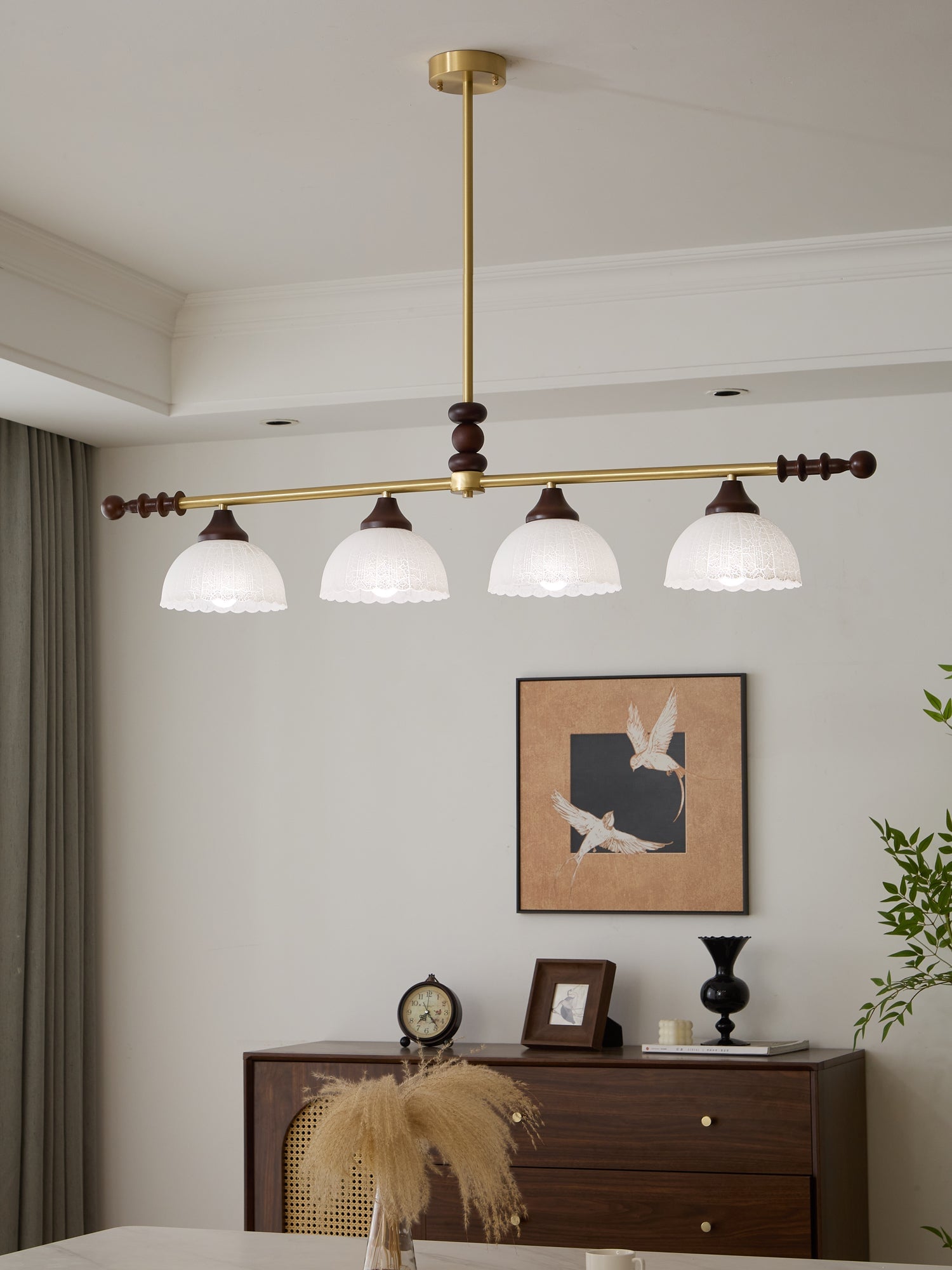 A sophisticated fusion of iron, glass, and wood, this Lighting pendant exudes elegance and harmony. With its linear balance and soft luminous globes, it creates an atmosphere of serene refinement, perfect for modern and classic interiors alike.