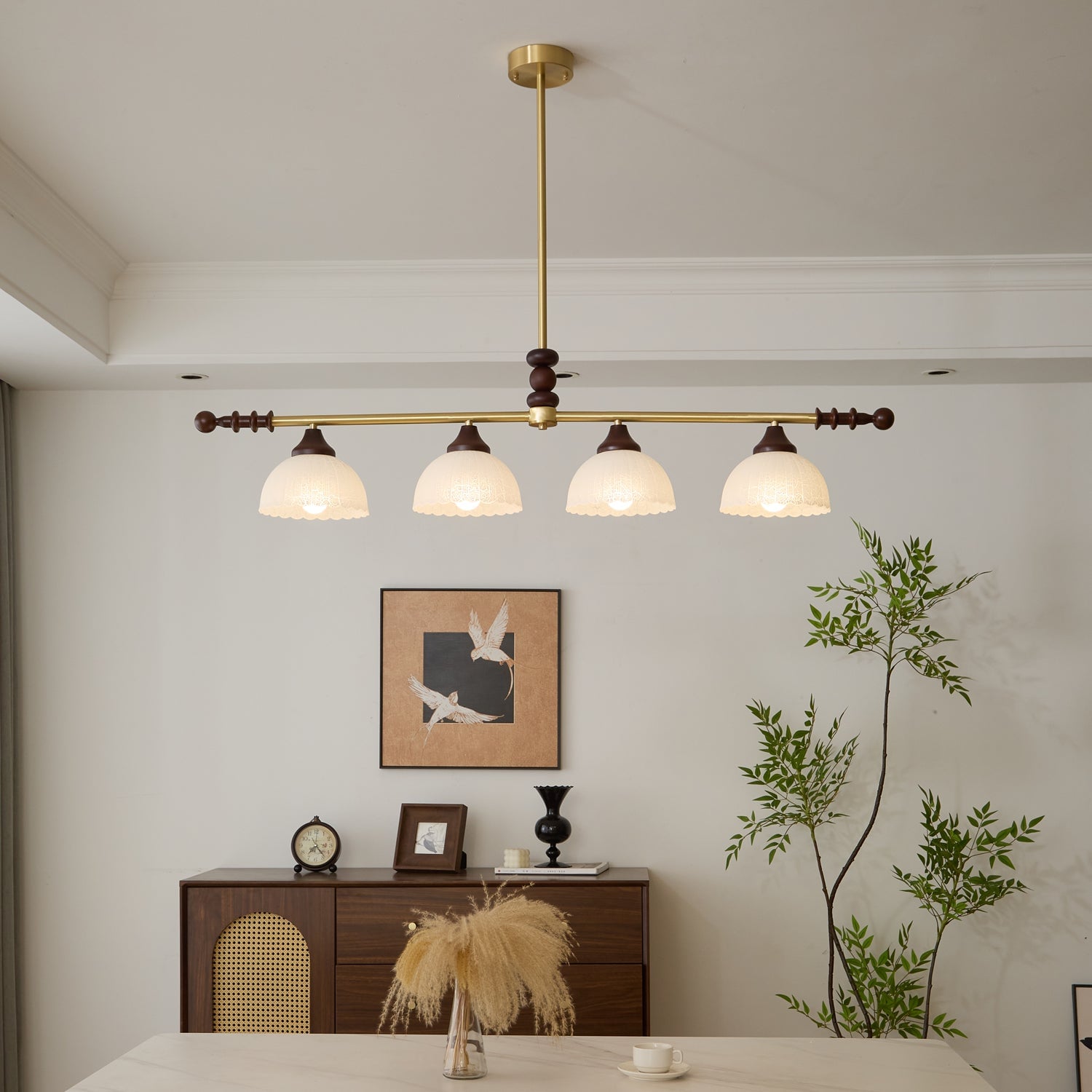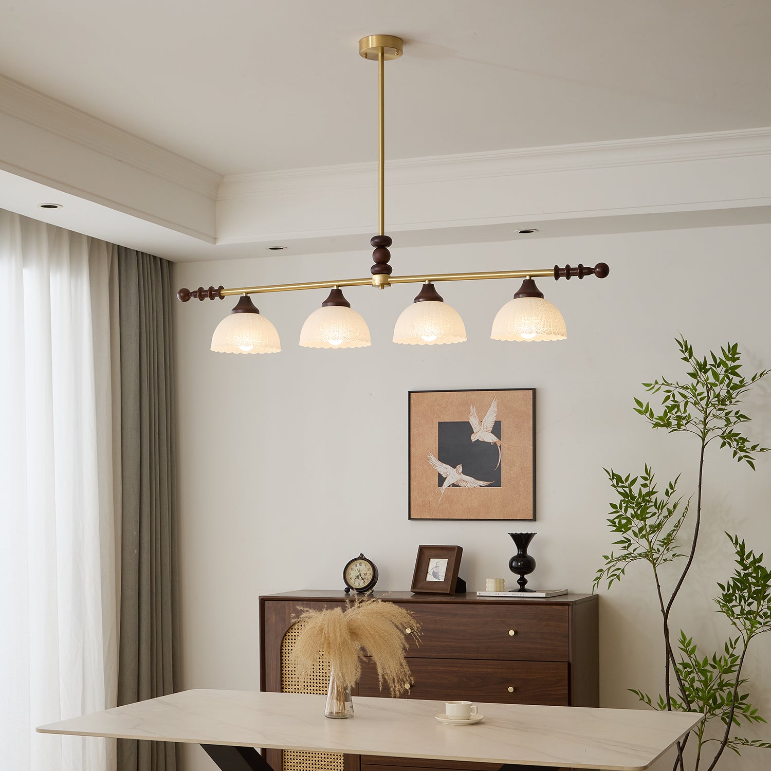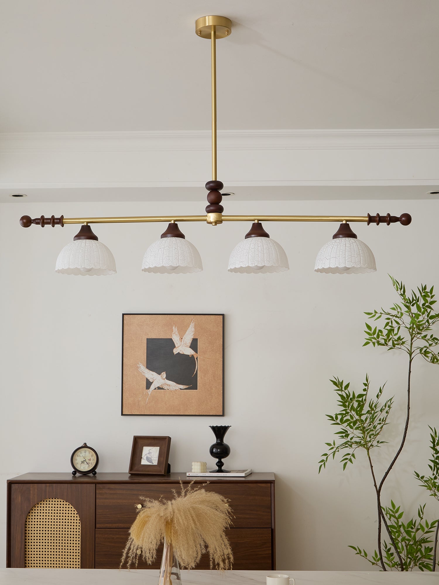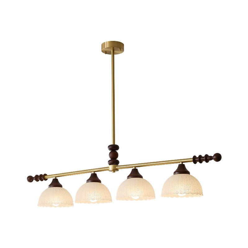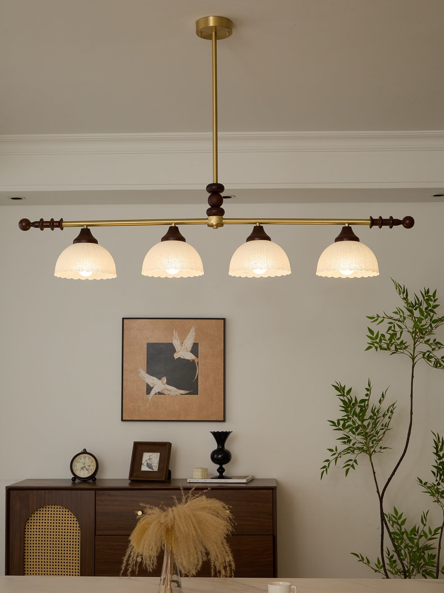 A sophisticated fusion of iron, glass, and wood, this Lighting pendant exudes elegance and harmony. With its linear balance and soft luminous globes, it creates an atmosphere of serene refinement, perfect for modern and classic interiors alike.