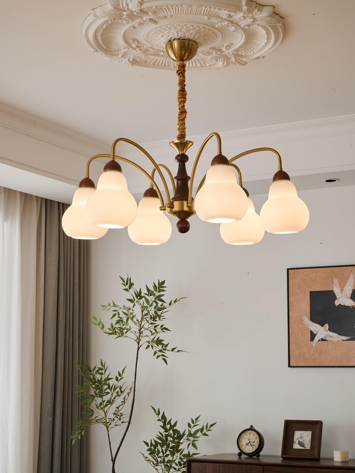 The Bellini Chandelier combines timeless elegance with modern sophistication. Crafted from premium metal, wood, and glass, this exquisite chandelier features elegantly designed arms that hold delicate glass globes, creating a soft and inviting glow. The blend of rich wood details and polished metal accents adds a unique, warm touch to your living space, making it a perfect choice for contemporary and classic interiors alike.