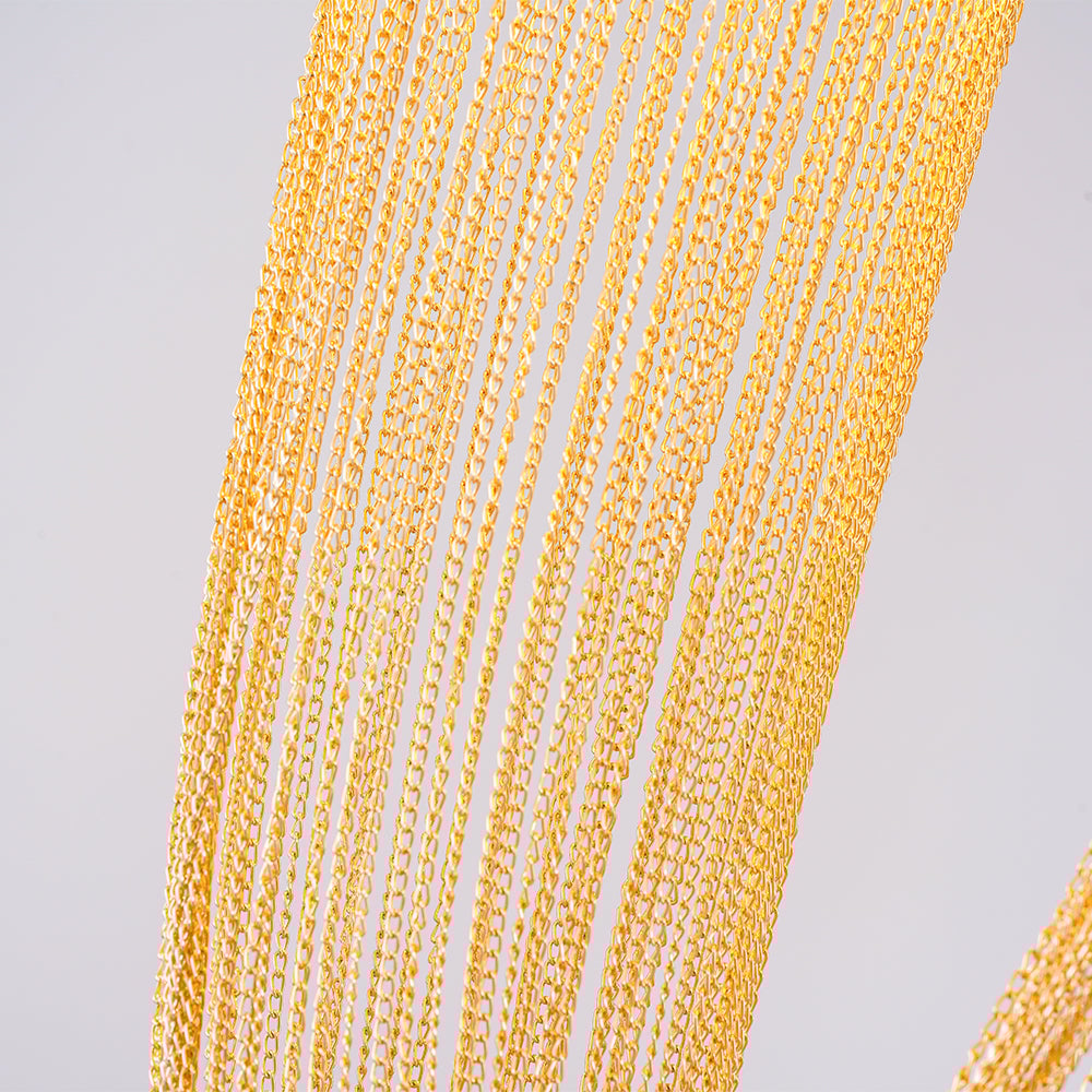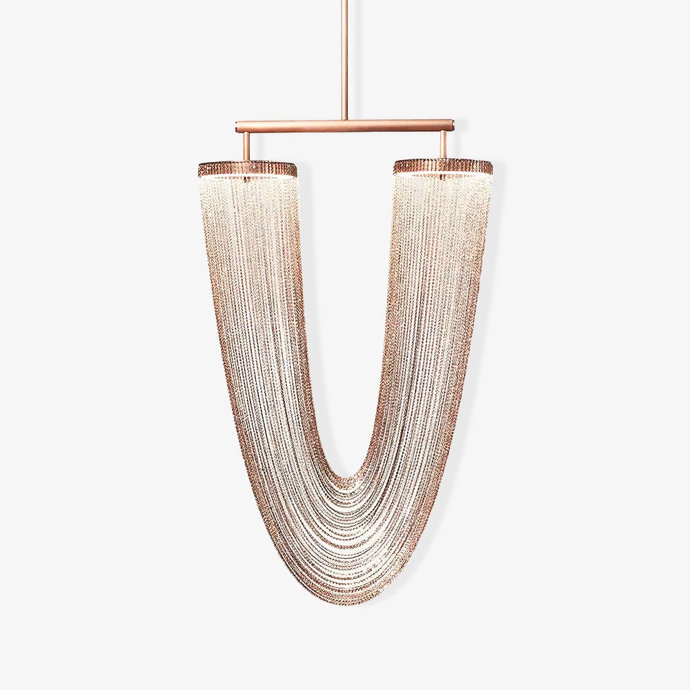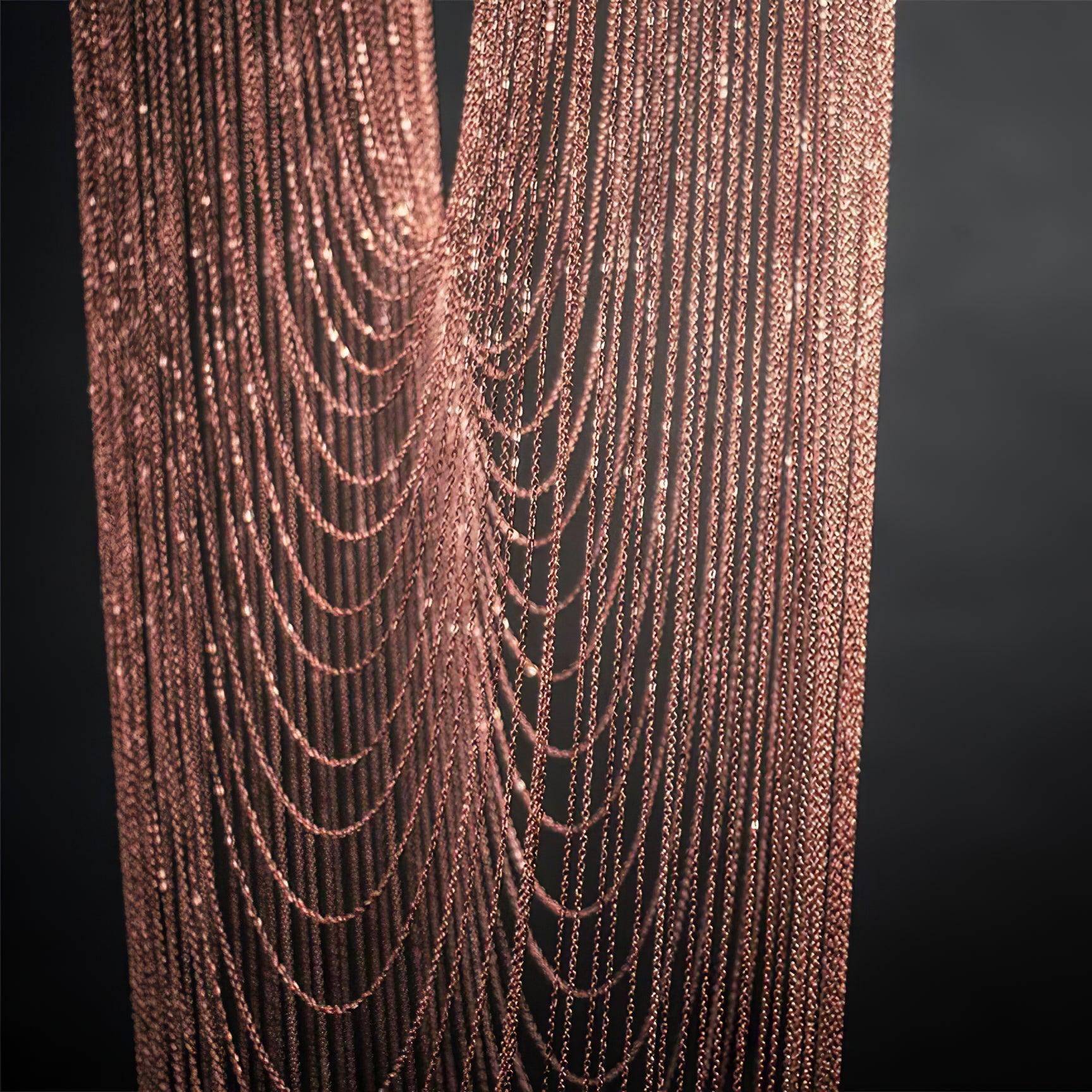 It is with a poetic beauty captured in this luxurious high-end lighting fixture that has been coated with warmth and elegance, that it will infect your daily life. This sculptural light is hand-crafted with delicate copper chains to create a unique and elegant curved shape inspired by the romantic world of jewelry. The light itself comes from two copper rings and goes through the chains to create a magic atmosphere.