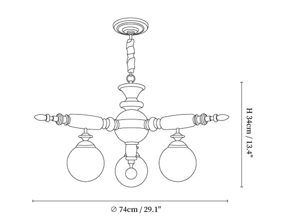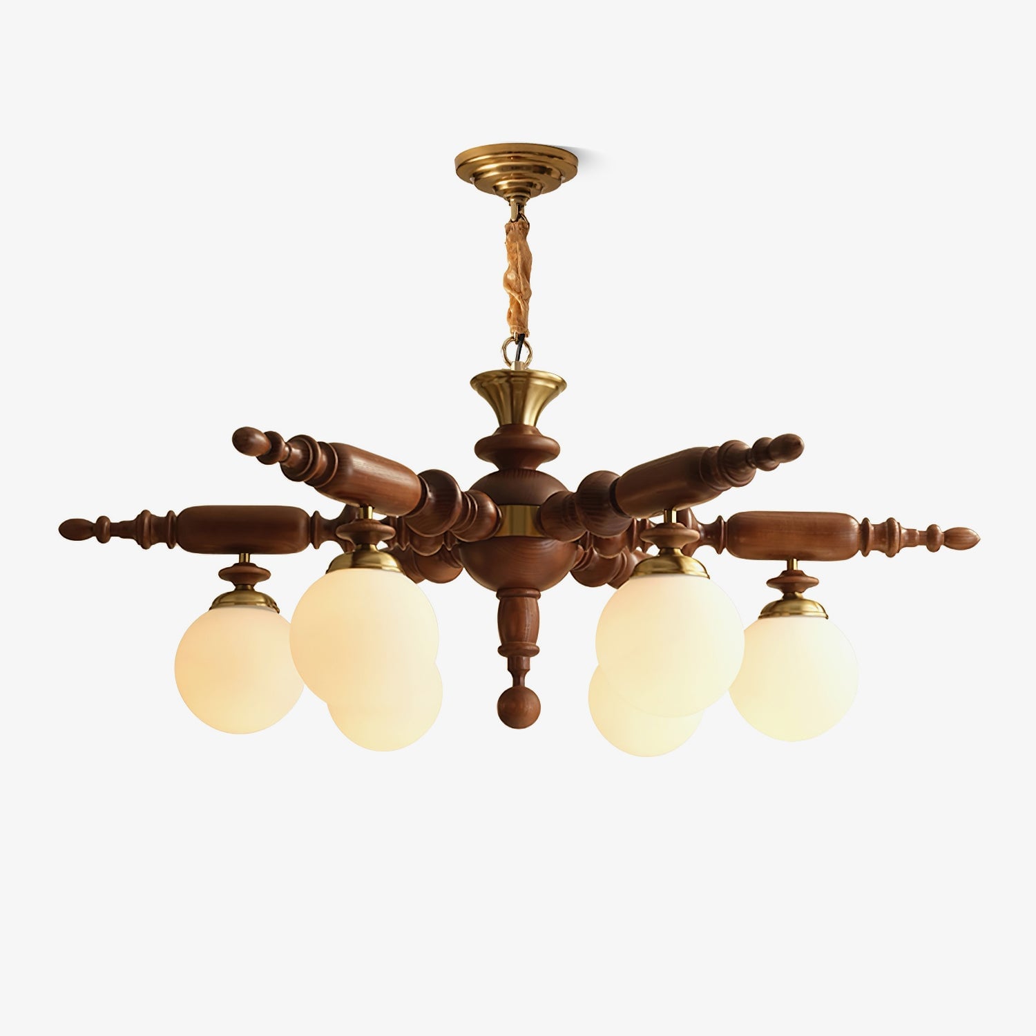 The Rotating Stick Chandelier seamlessly blends classic and modern elements, featuring wood details and opaline glass shades arranged in a symmetrical pattern reminiscent of a carousel horse. Add a touch of playful sophistication to your space with this timeless piece.