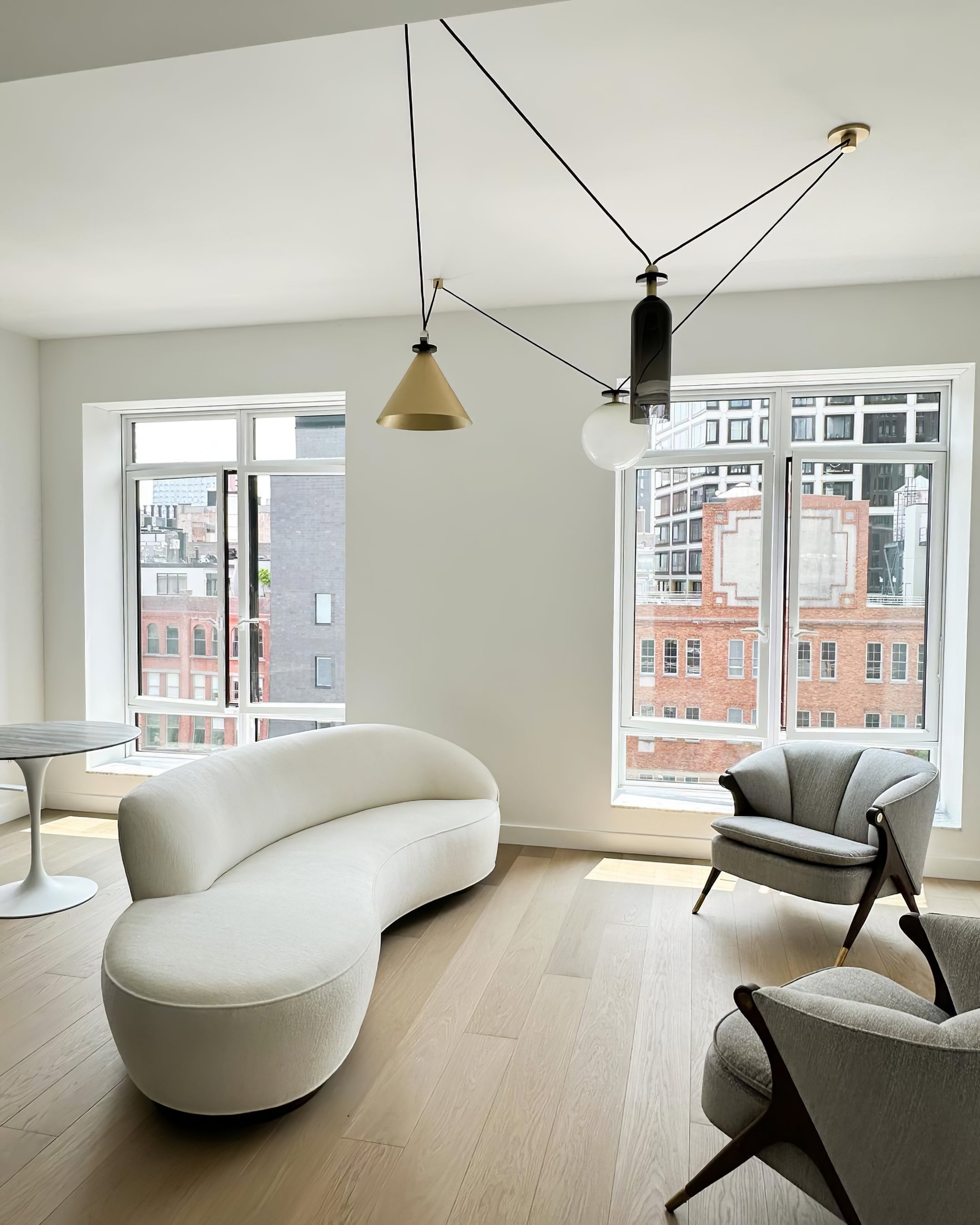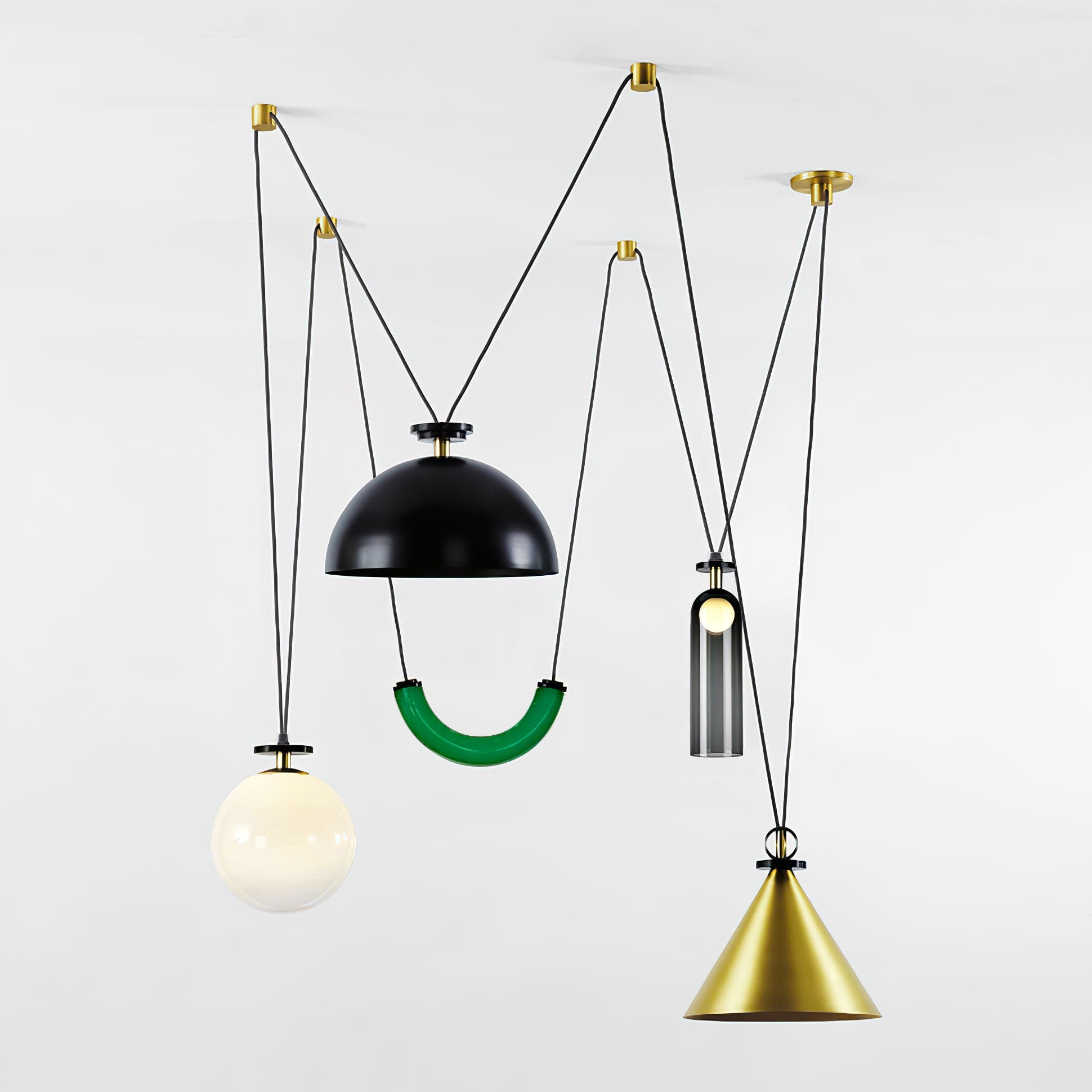 Shape Up is a versatile lighting series that celebrates bold geometric shapes: the playful juxtapositions upend traditional notions of symmetry in favor of dynamic spatial harmony. The modular system allows the shapes to be suspended and composed in response to a space's architecture and function, its shades discreetly networked via connecting cords and hubs.