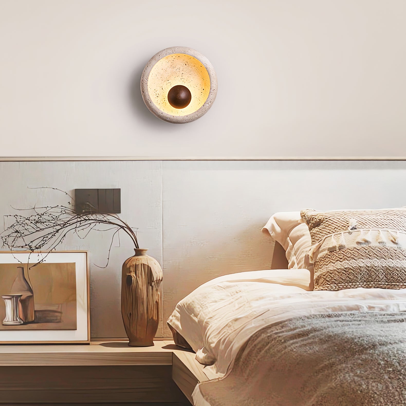The Sol Sphere Wall Lamp by Lighting highlights the beauty of raw travertine and a central wooden accent. Its soft, diffused light creates a cozy and sophisticated atmosphere for hallways and bedrooms.