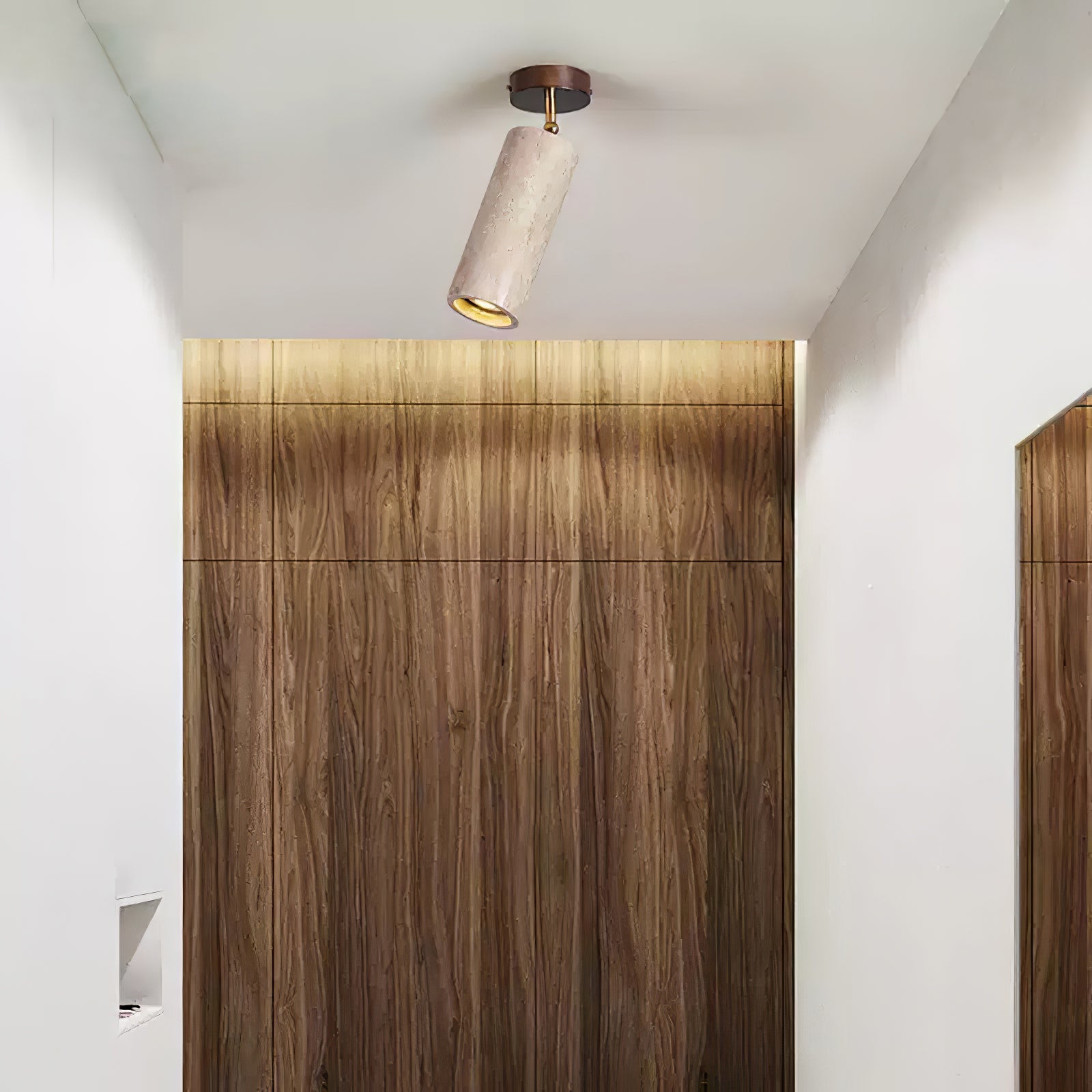 The Lighting Solis Stone Spotlight is a fusion of raw nature and refined craftsmanship. Featuring a meticulously sculpted travertine stone cylinder, complemented by a warm walnut wood ceiling mount and brass pivot, this spotlight exudes a timeless elegance. Its adjustable design allows for precise lighting, making it a versatile addition to contemporary interiors—perfect for accentuating artwork, creating ambient mood lighting, or adding a sophisticated touch to hallways and living spaces.