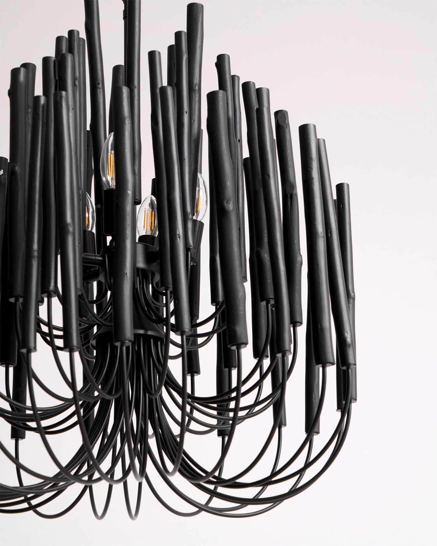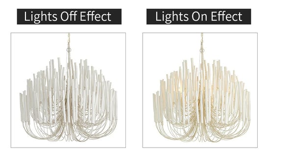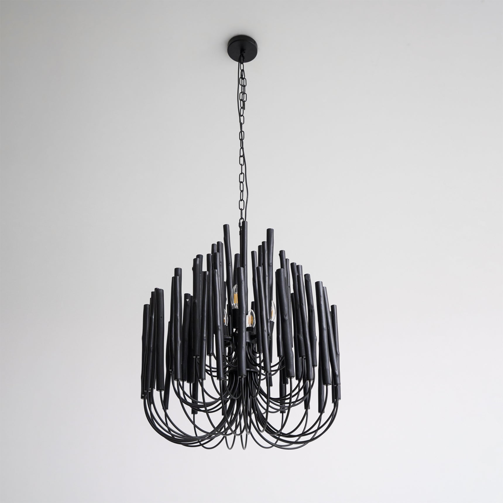 Enhance any space with the unique and charming Swinton Chandelier. Crafted with layered wooden rods and curved iron arms, each piece boasts a one-of-a-kind shape and size due to the natural characteristics of the wood. Available in black or white, this chandelier is a perfect blend of natural elements and modern design.