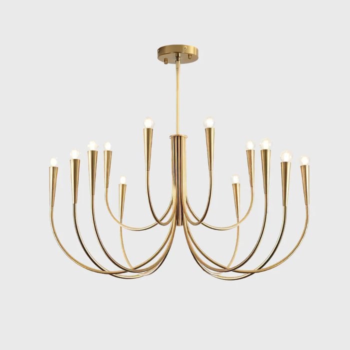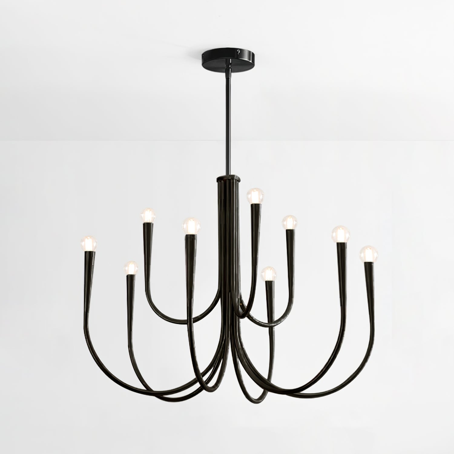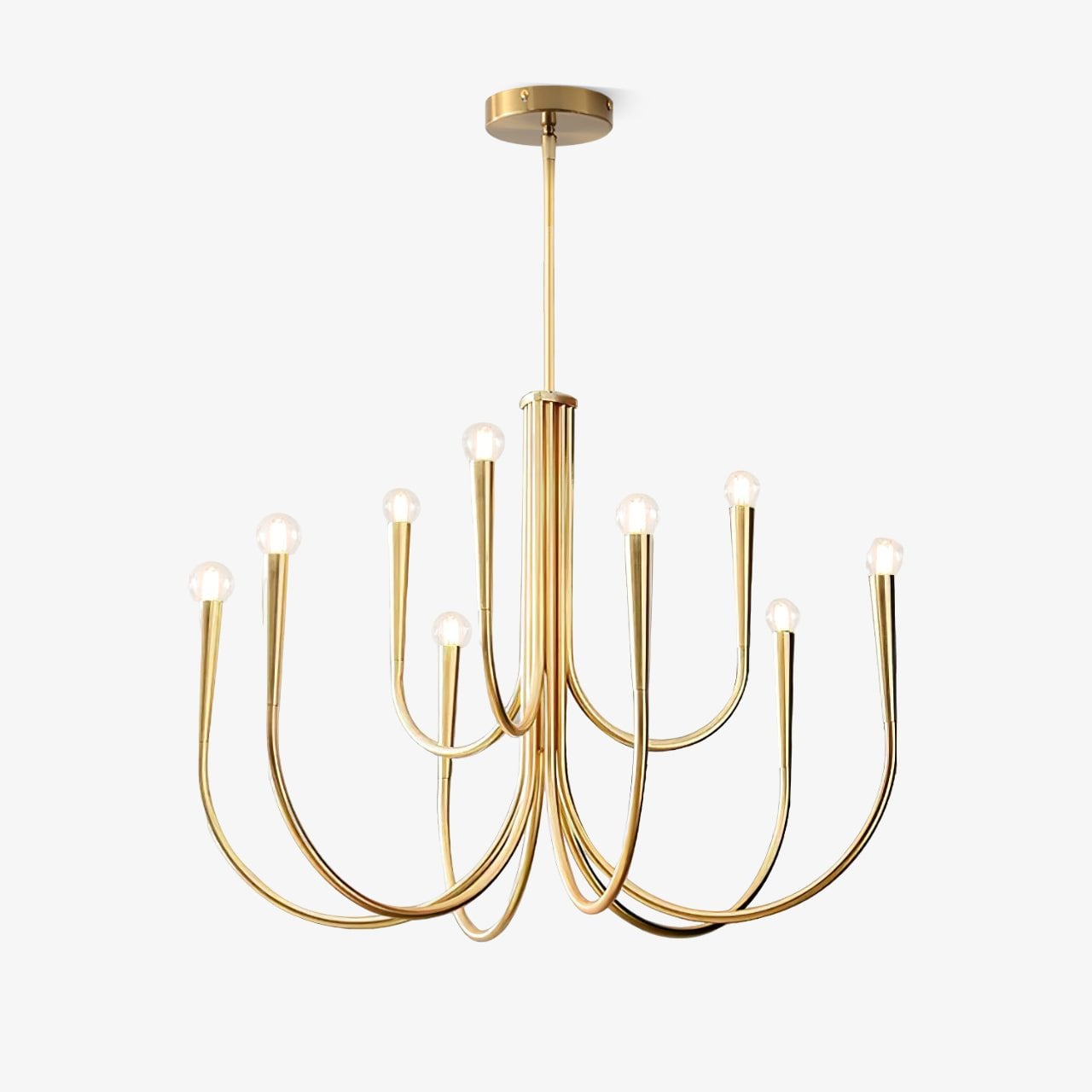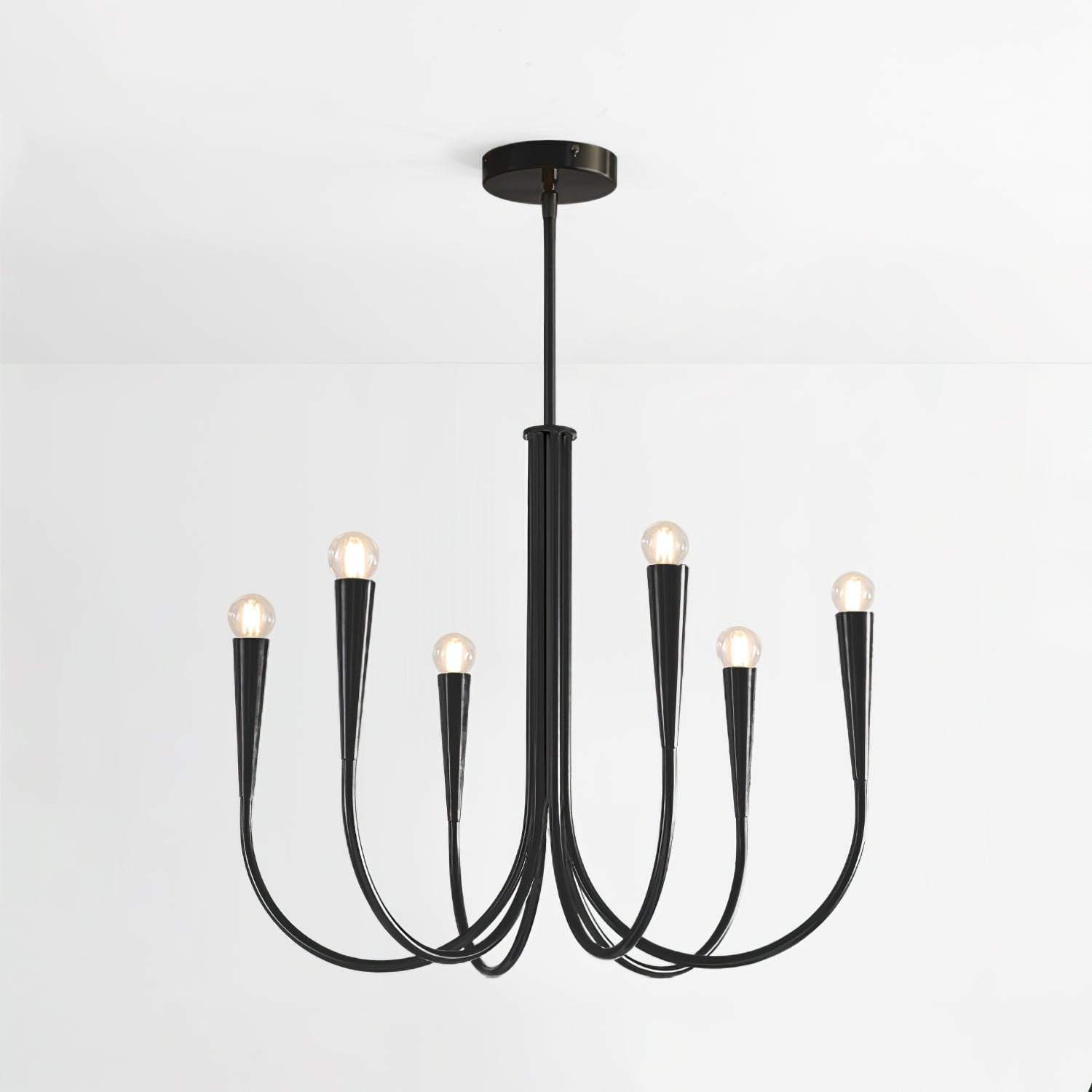 Add a touch of modern elegance to any room with the sleek and stylish Swoop Arm Chandelier. Its unique curves and vintage-inspired design make it a striking statement piece above a dining table or in a living room. Elevate your space with this stunning chandelier.