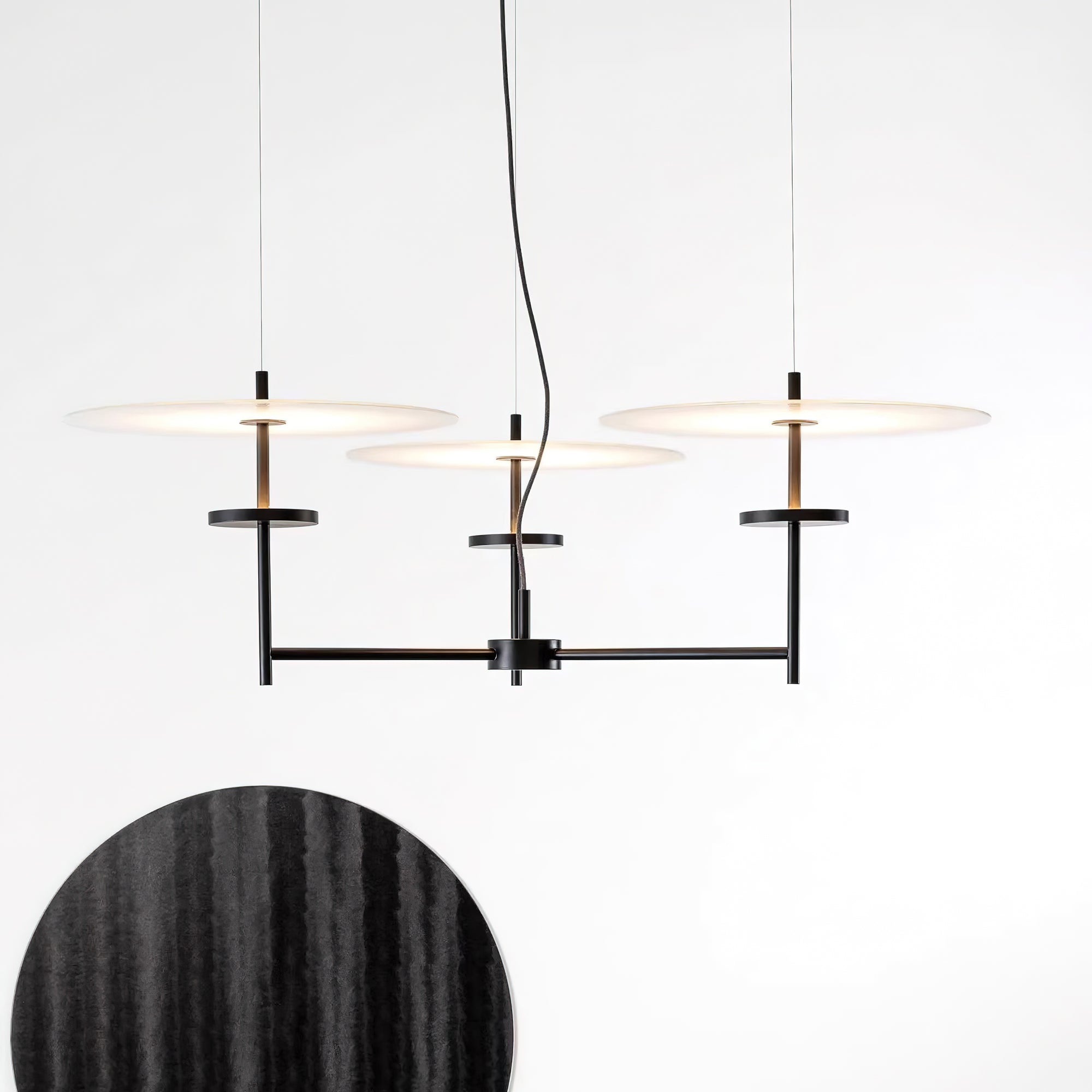 Illuminate your space with the Trezzero Chandelier. The disk-shaped lampshade mimics a solar eclipse, providing a unique and artistic touch. The sleek black brackets and warm lighting bring balance and beauty to modern spaces. Bring the beauty of light and shadow to your home with this stunning chandelier.